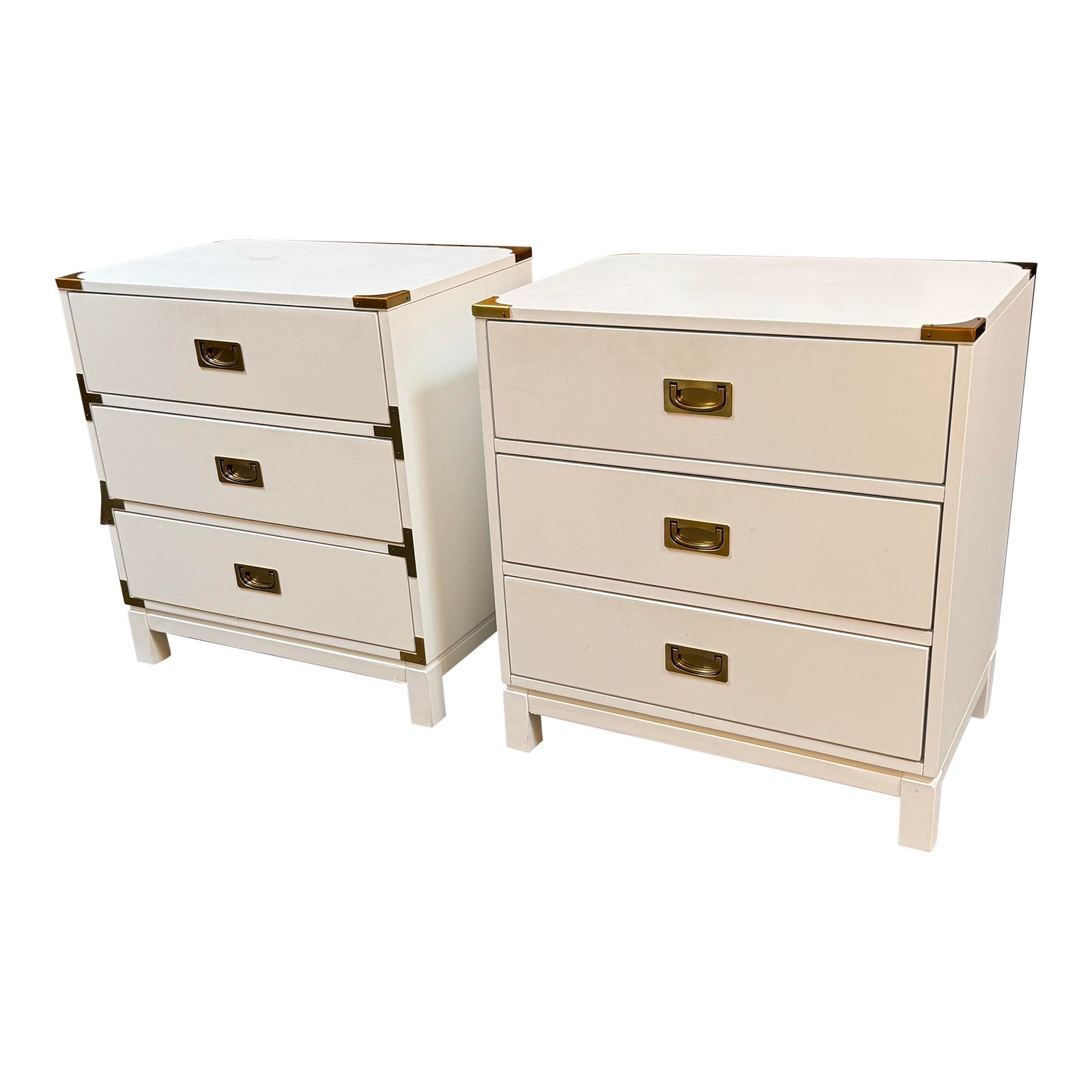 Design Plus Gallery presents a Pair of Campaign Nightstands by Walter of Wabash. Brilliant white engineered wood create the drama, the three roomy drawers create the function. Brass fittings finished the nightstands beautifully. Low square legs elevate each nightstand. Little surface wear; condition is consistent with age and use.