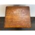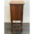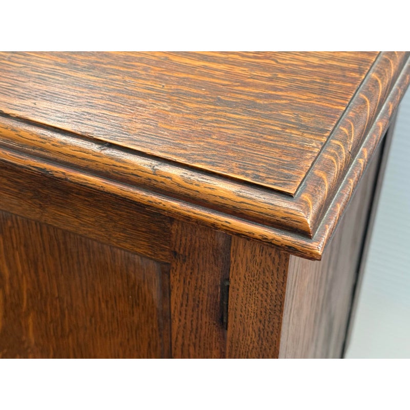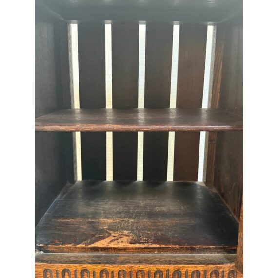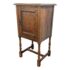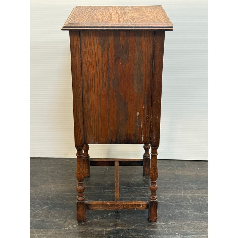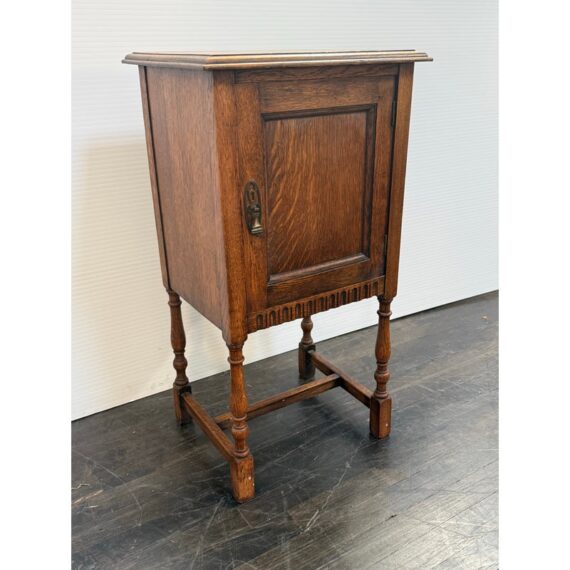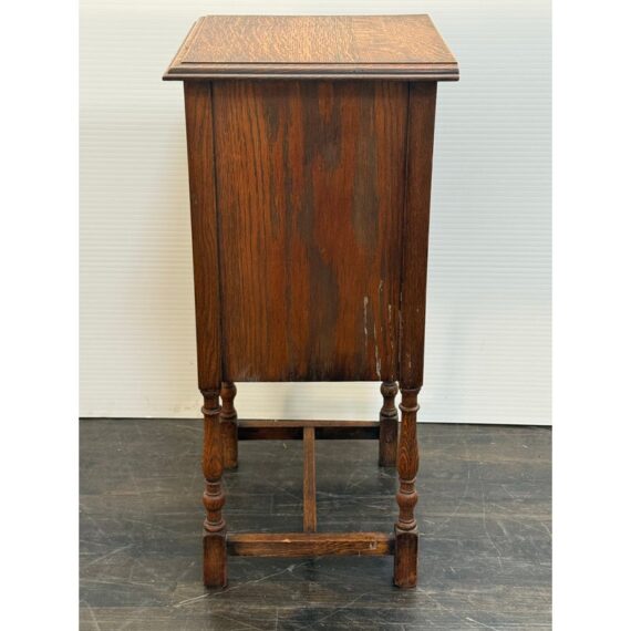 Design Plus Gallery presents a Jacobean Revival Nightstand from Waring & Gillow of Lancaster. This small bedside cabinet in oak wood likely dates to the 19th century in England. It is of figured oak wood with a good color and patina. There is a hand carved paneled door that opens to reveal an empty cavity space for storage and opens by a fancy bras escutcheon plate with faux keyhole. The cabinet stands on shaped legs that have stretcher joining in their center for stability. Brand plate is present and the cabinet is in fair condition for its antique age.