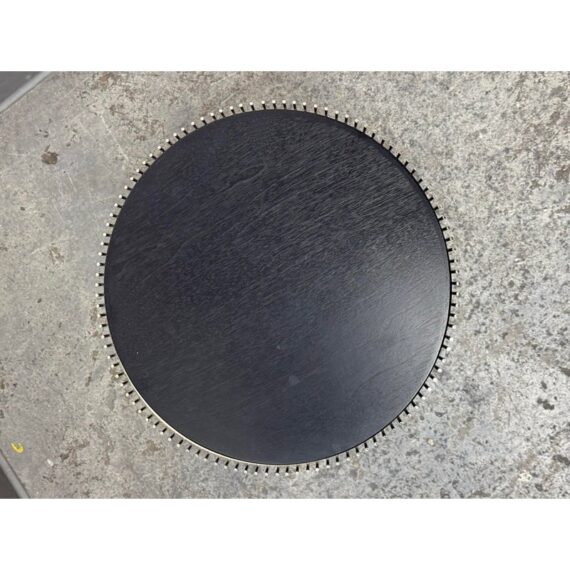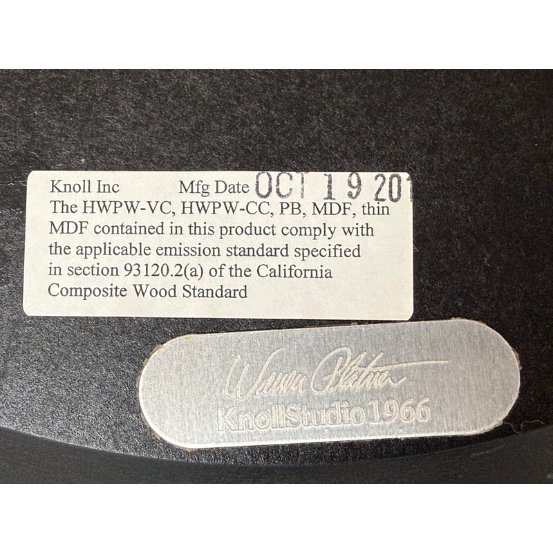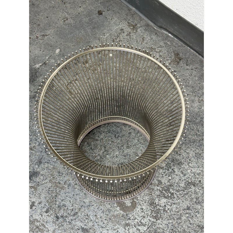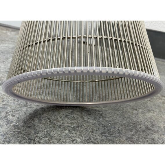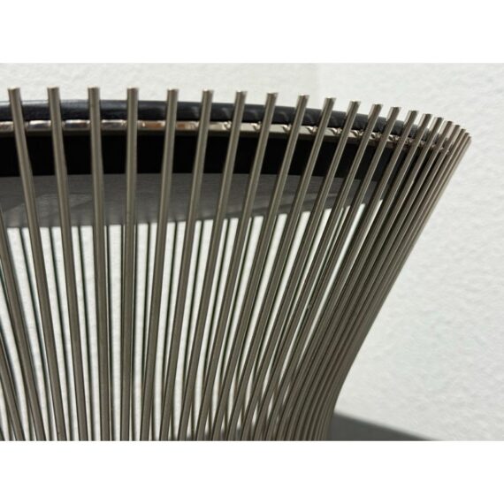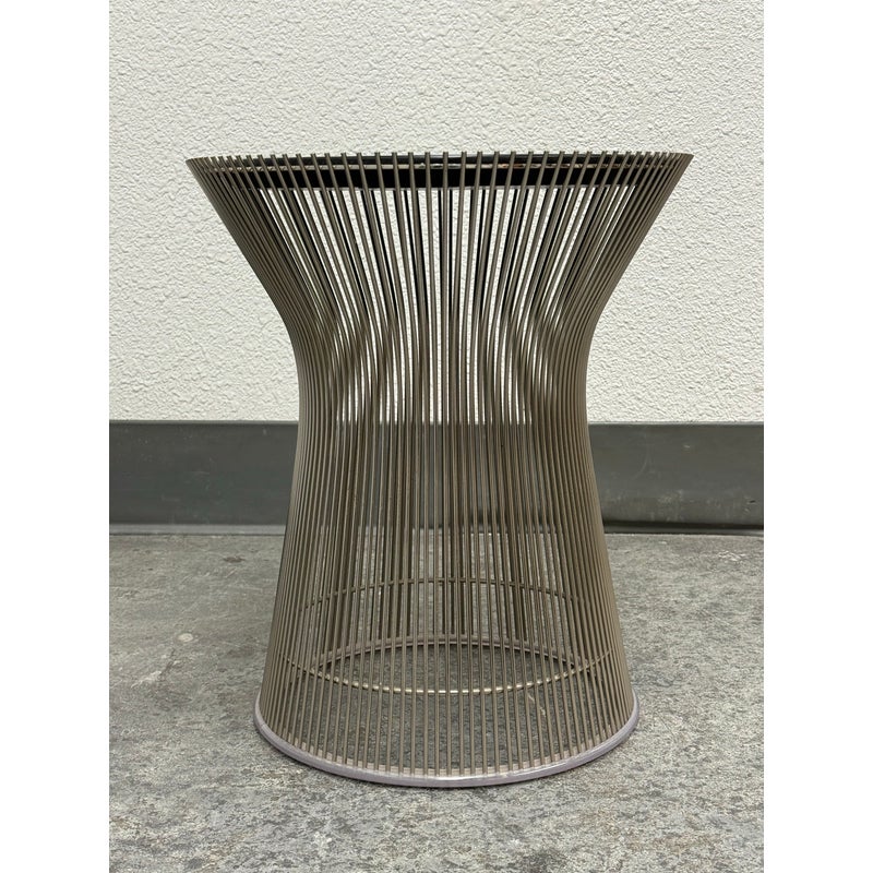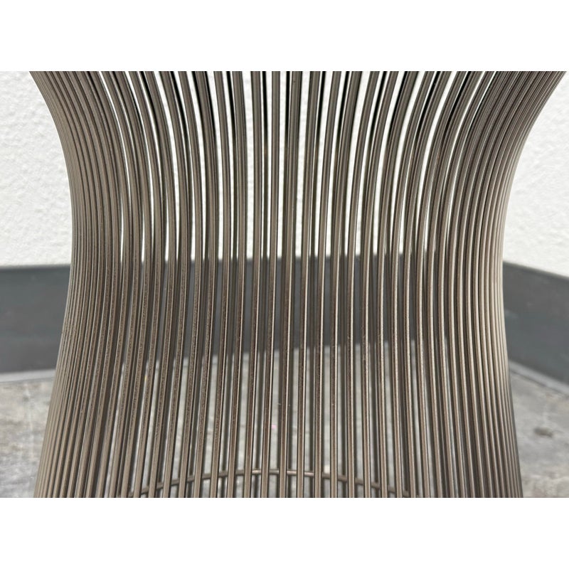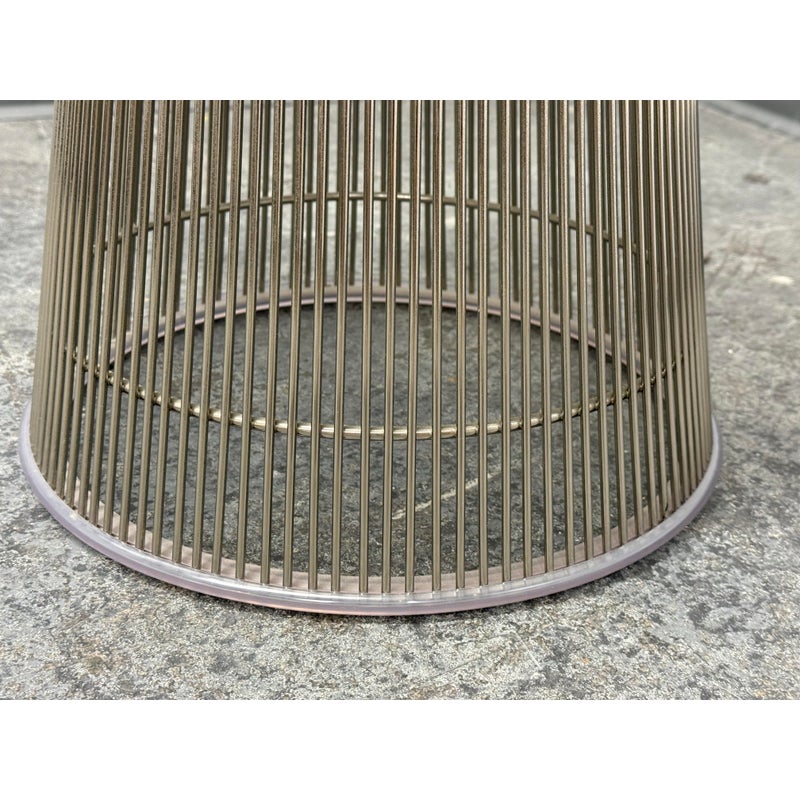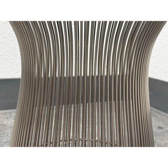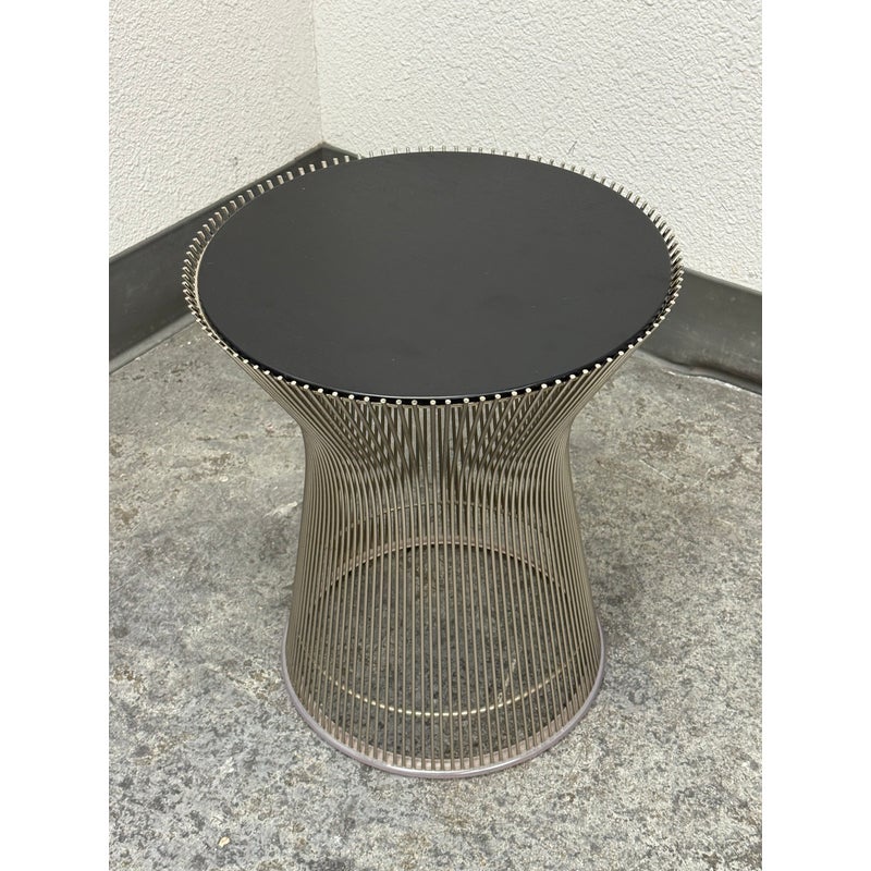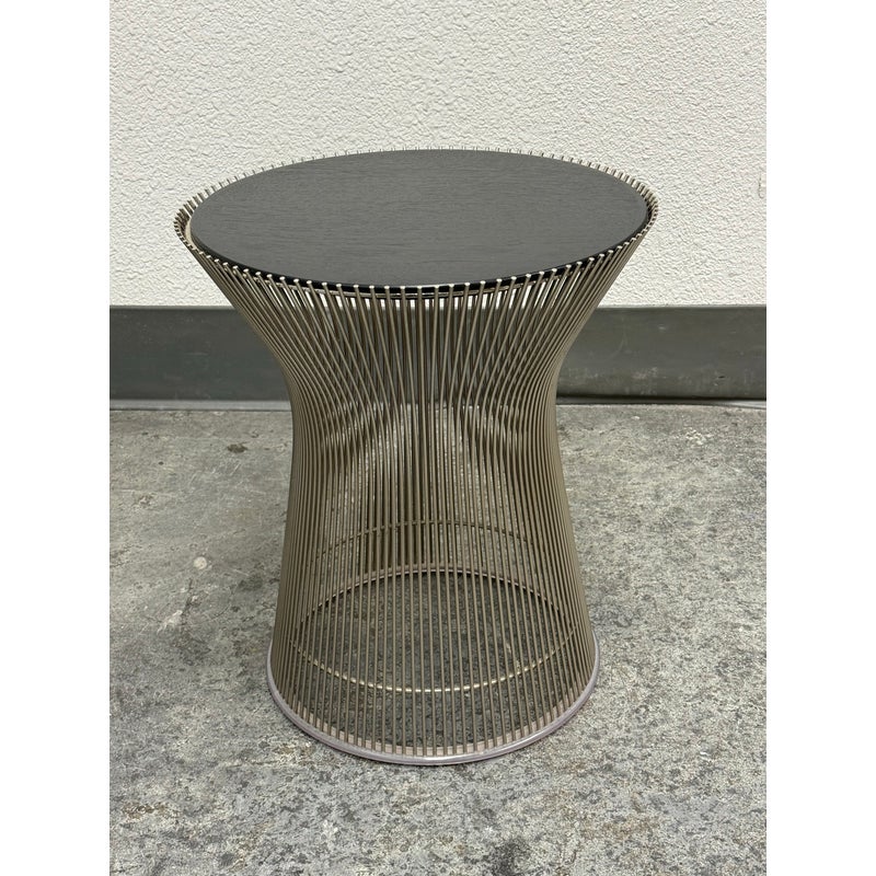 Design Plus Gallery presents a Platner Side Table from Knoll Studios with Ebonized Walnut Veneer Top and Polished Nickel finish Base. This side table is a modern classic that embodies both elegance and innovation and was designed by Warren Platner in 1966. Platner contributed to iconic projects alongside I.M. Pei and Eero Saarinen, founded the Platner Collection, and was noted in bringing a unique softness and decorative sensibility to modern design. Platner believed that modernism could encompass “the kind of decorative, gentle, graceful design that appeared in a period style like Louis XV,” and this ethos informs the side table’s silhouette. The table’s base is a mesmerizing, sculptural cage of curved steel rods, each welded together in a production process that requires up to 1,000 individual welds. The result is both airy and structurally precise, a perfect balance of form and function that appears almost weightless while remaining undeniably sturdy. Brand plate is found on the base and the table is in good condition, visible and minimal wear. Made in Italy.