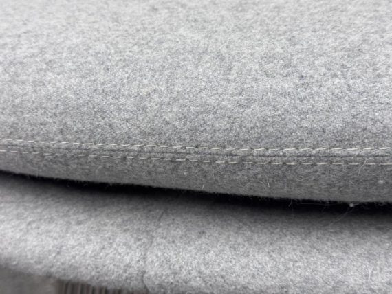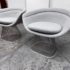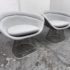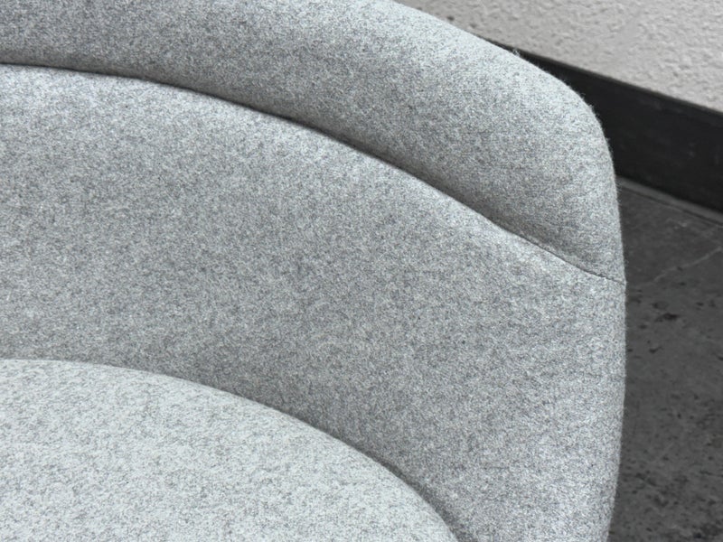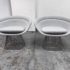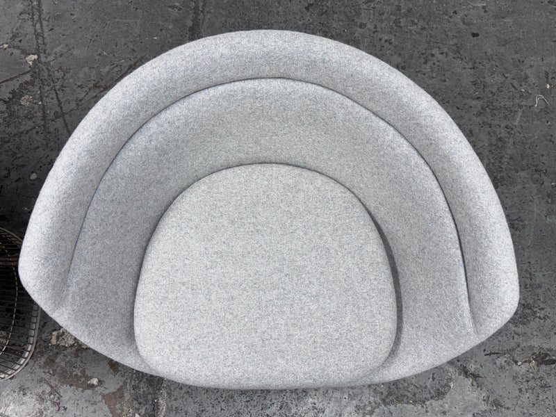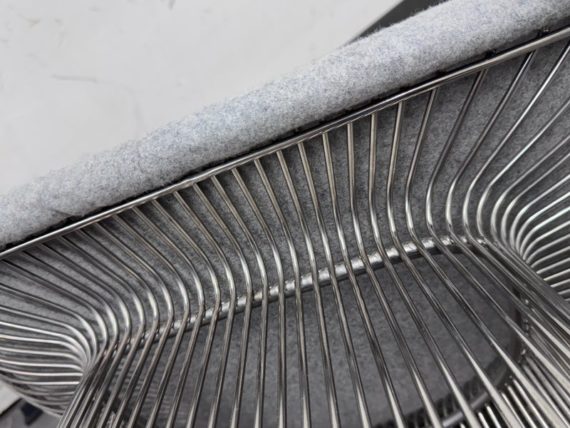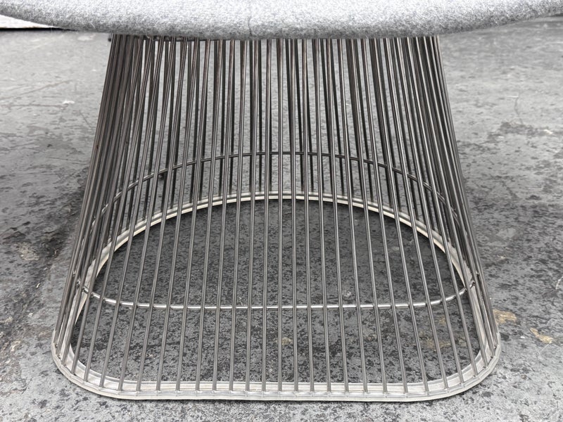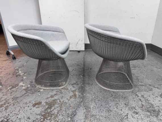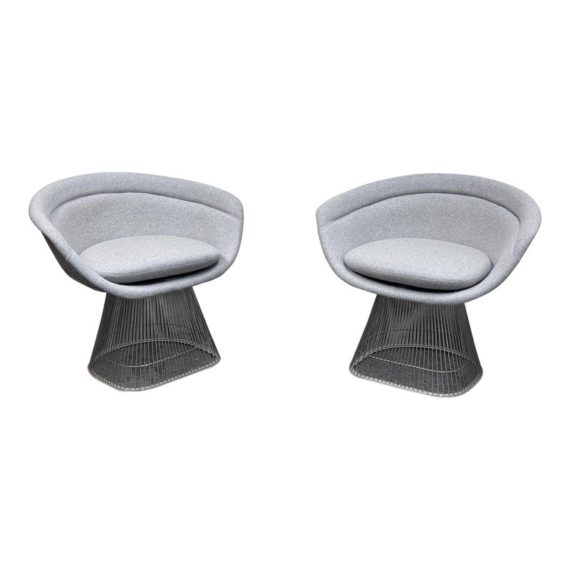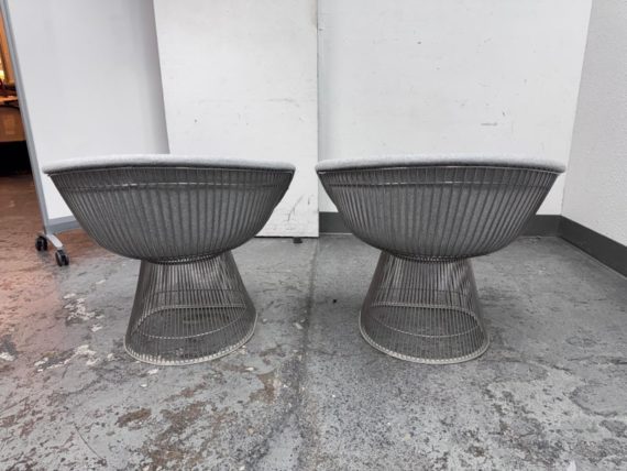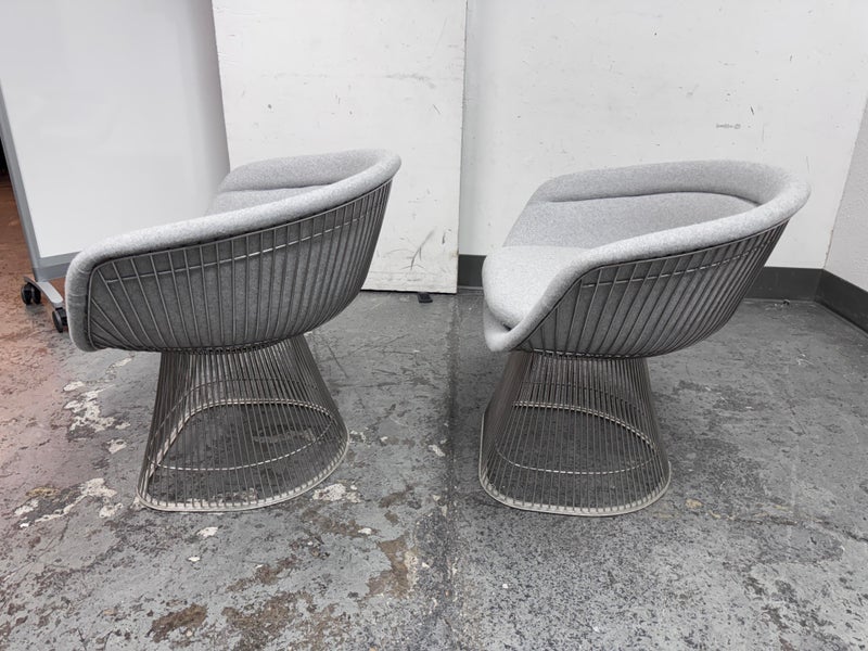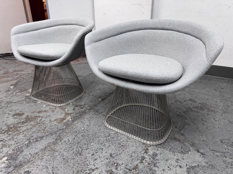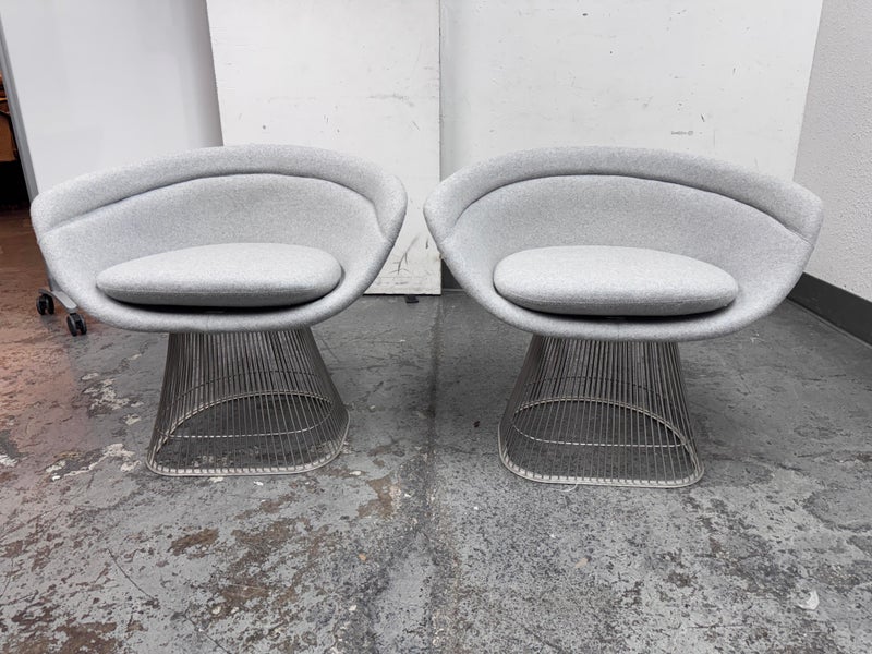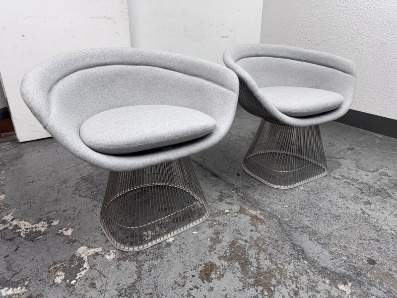 Design Plus Gallery presents a Pair of Platner Style Lounge Chairs. Inspired by the original 1966 Platner Collection designed by Warren Platner, this lounge chair captures the iconic Modernist era style. Both elegant and whimsical, the stainless steel wire base was designed to resemble a shiny sheaf of wheat. The design provides not just a unique look, but also full support and stability for the seating shell. In displayed chairs, high-density foam cushioning has been upholstered in a soft cashmere blend upholstery for luxurious comfort. Both are in good, showroom like condition with minimal signs of wear.