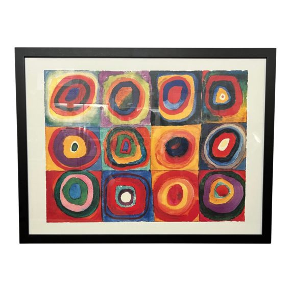 Design Plus Gallery presents a “Squares With Concentric Circles” Print by Wassily Kandinsky by Z Gallerie. Twelve squares containing circles are arranged in three rows and four columns. The squares contain different color combinations so viewers can study the perceptual impacts of each. The print was originally made by the artist to support his creative process. Originally made in 1913. The print is single matted and framed in wood with a black finish. A hanging cord is attached for horizontal mounting. Minor wear from use; print is in good condition.
