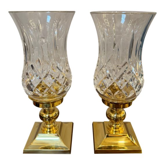 Design Plus Gallery presents a Pair of Crystal Hurricane Candle Holders by Waterford Crystal. Stunning cut crystal hurricanes, removable, refract the light from taper or pillar into your space. Polish brass stands can be used with or without hurricanes. Elegant and welcoming addition to hearth, entryway or dining table. Little evidence of wear; condition is good for age and use.