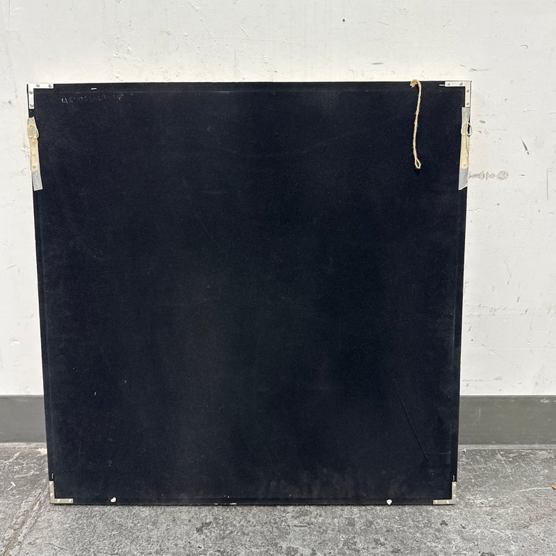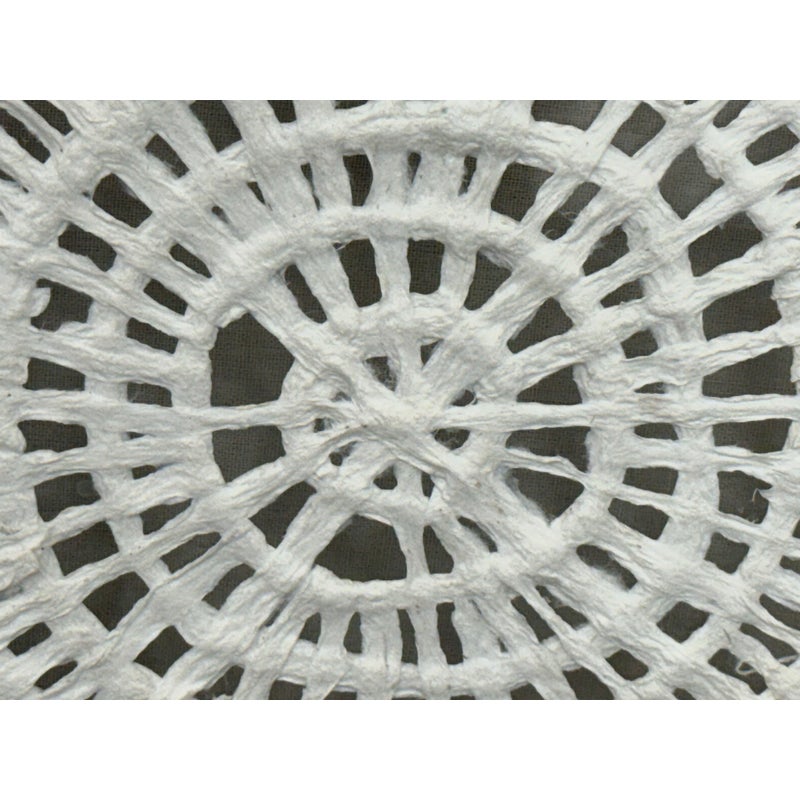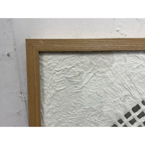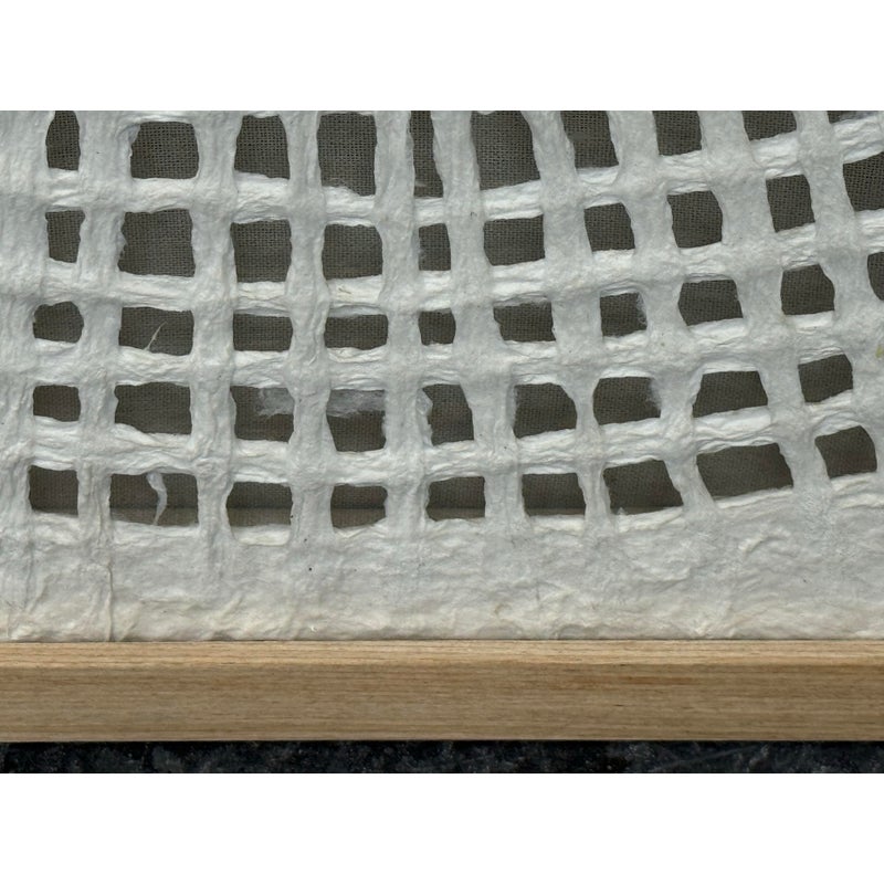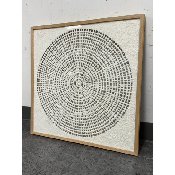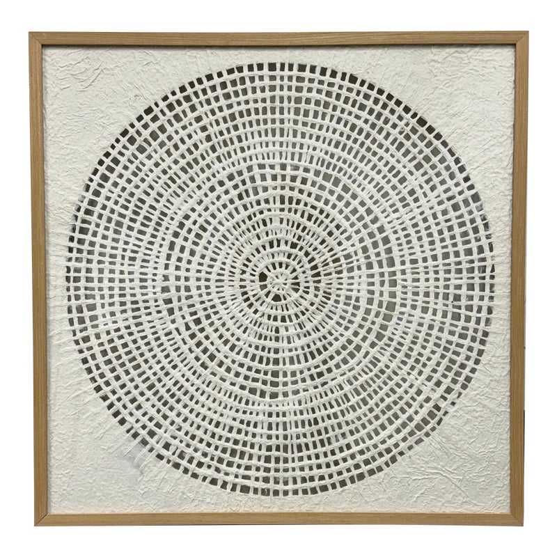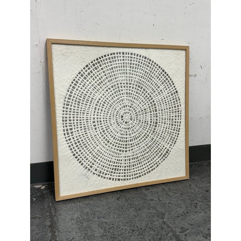 Design Plus Gallery presents a Rice Paper of Web Pattern in a Shadow Box. This wall hanging is formed with a circular pattern of tiny dots that create a pattern similar to a spider’s web. The paper is placed over linen backing and frame in a light wood frame. Overall the art piece is in good condition for its usage.