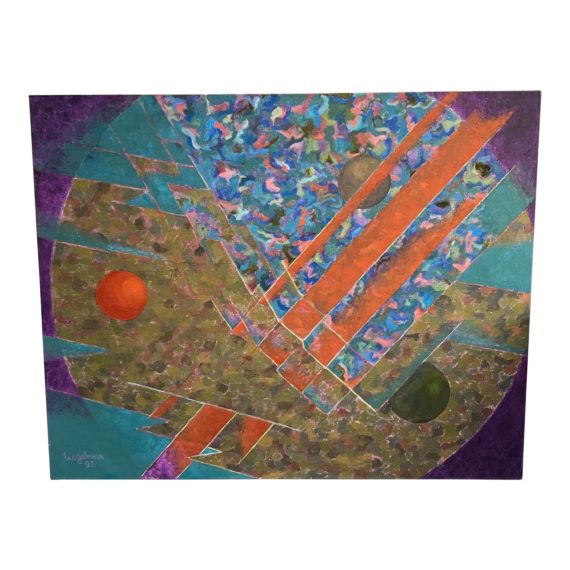 Design Plus Gallery presents a Large Original painting by Webster B. Gelman, dated 1993. The scale of the piece, combined with the dynamic lines and saturated colors brings to mind planetary travel, whether by light or in orbit. Fill that blank wall with color and energy, an original painting on stretched linen. Light surface wear; condition is consistent with age and use.