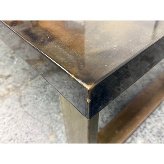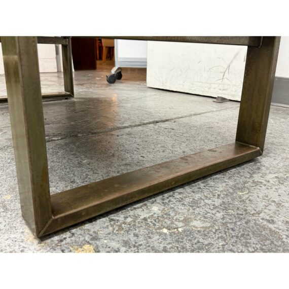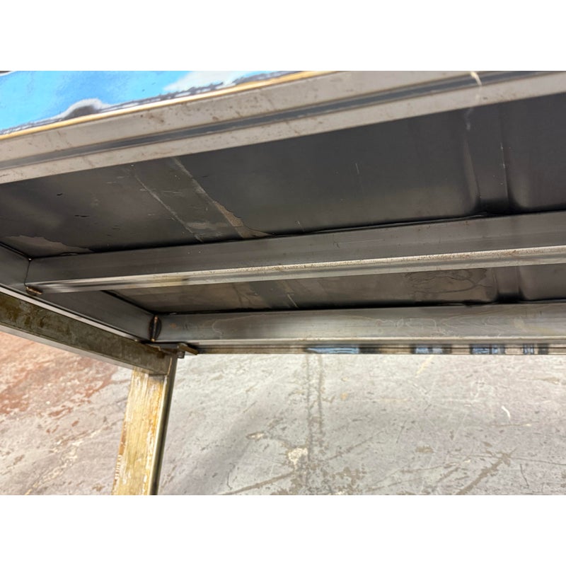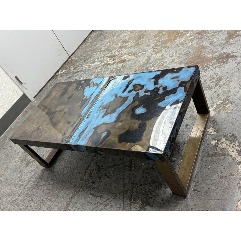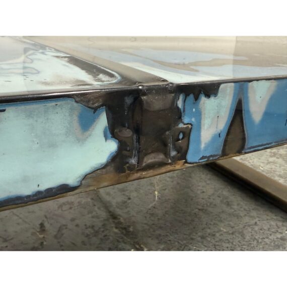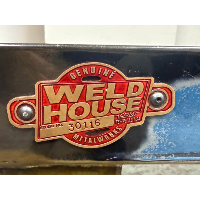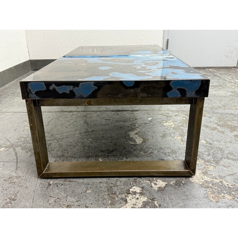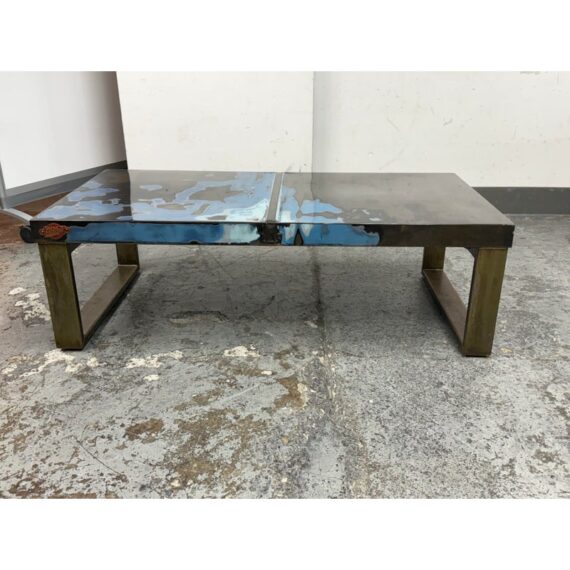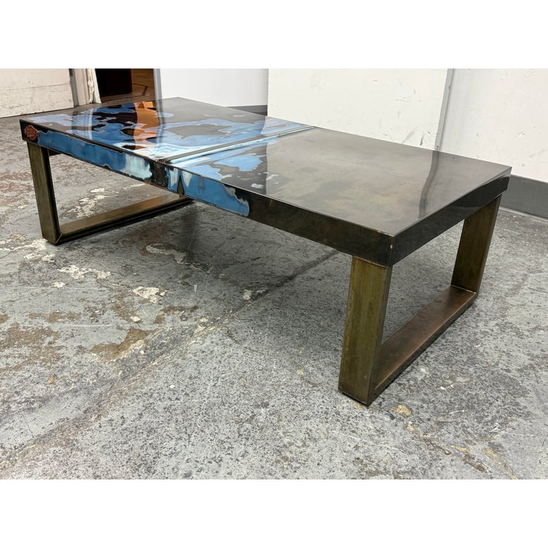 Design Plus Gallery presents a Custom Coffee Table from Weld House. The table is a conversion piece from a 1967 Chevrolet Pick Up Truck, what had been the trucks hood. The blue truck takes on a new life with the treatment this talented Artist, Joel Hester did on the table. The legs are metal and sled like, allowing the heavy piece easier movement and their style adds to the look of the surface. There is a brand plate on the side + serial number for authenticity. The brand has transitioned to commercial projects and away from residential, making this coffee table a smart investment. Is in good condition and will last for many more decades.