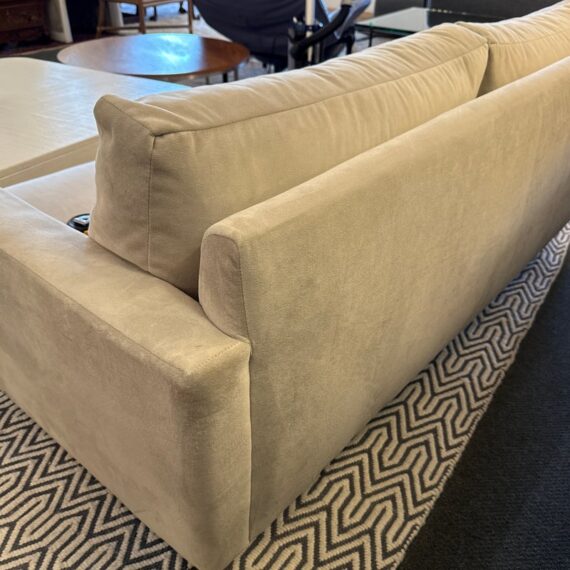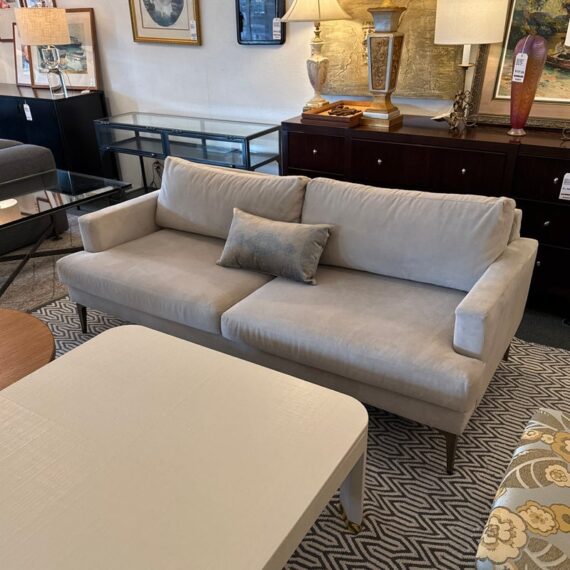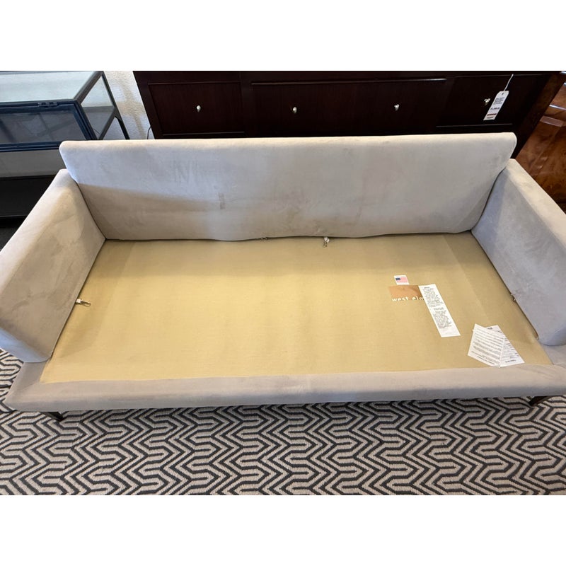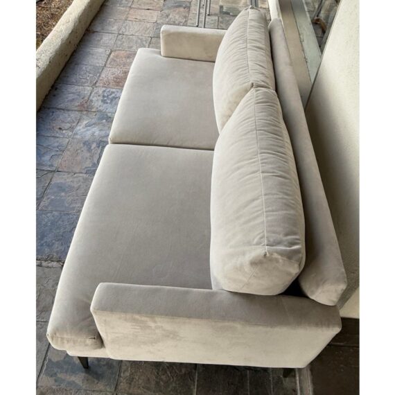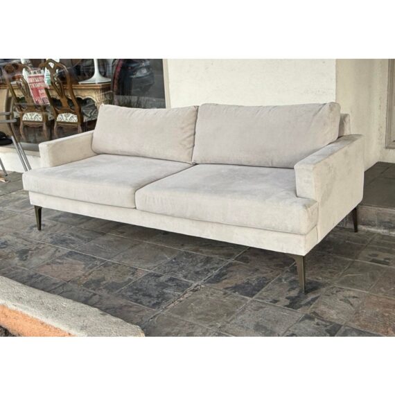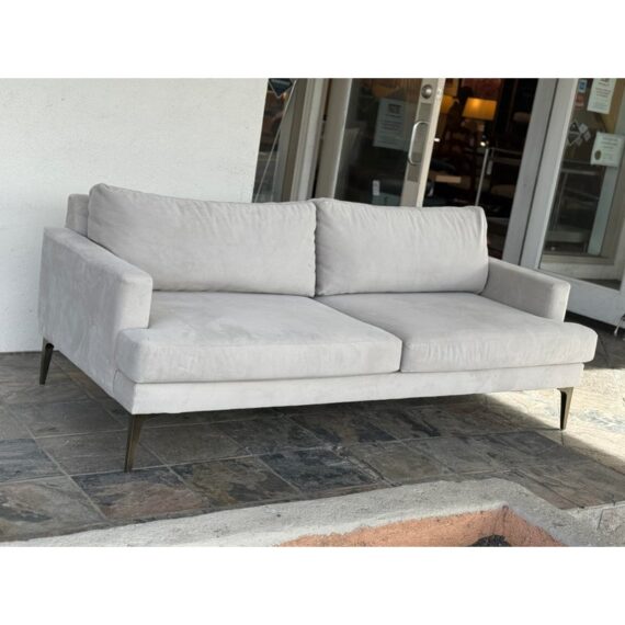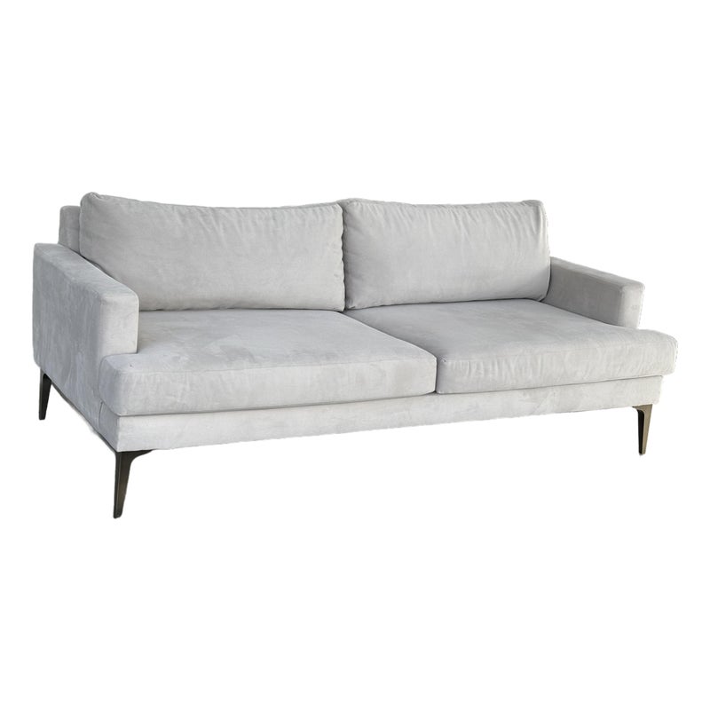Design Plus Gallery presents the Andes Sofa from West Elm. This style of sofa offers refined comfort with enduring craftsmanship. Upholstered in their Frost Gray Performance Velvet and offers a plush, polished look that’s made to last. Hand-built with a solid eucalyptus and engineered hardwood frame, reinforced joinery, and hand-finished upholstery. There are eversible cushions with zip-off covers to make caring for them a simple feat. The seat cushions themselves are fiber-wrapped with high-resiliency polyurethane foam cores for supportive comfort. The back cushions are generously fiber filled for a soft, relaxed lounge. Removable legs make delivery and rearranging a breeze. In good condition, visible and minimal wear from usage. Made in USA.