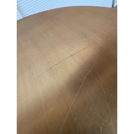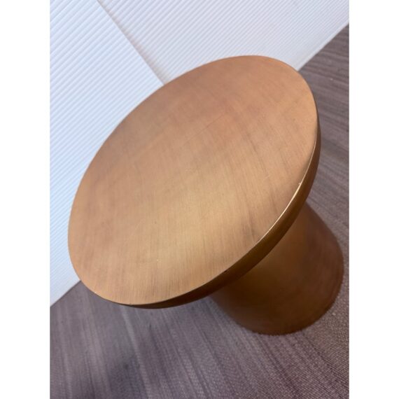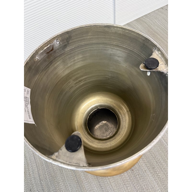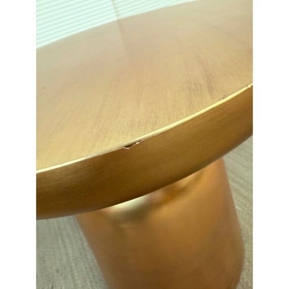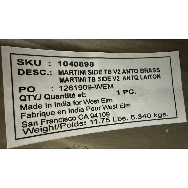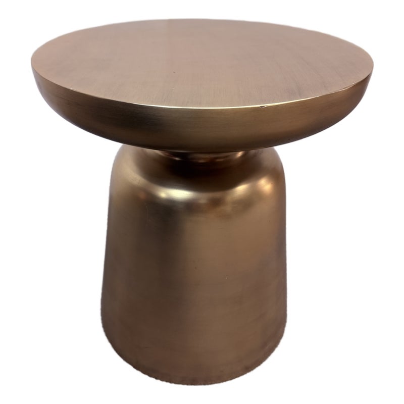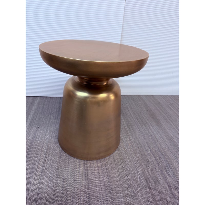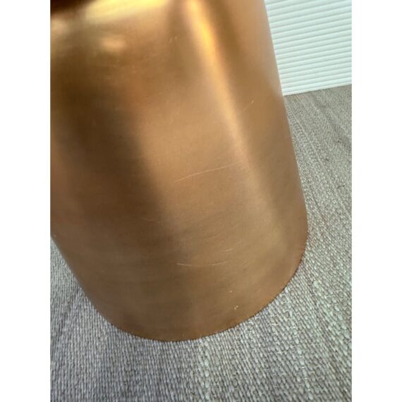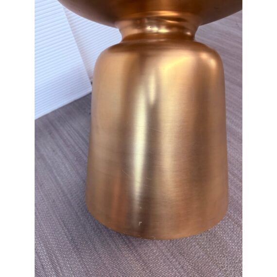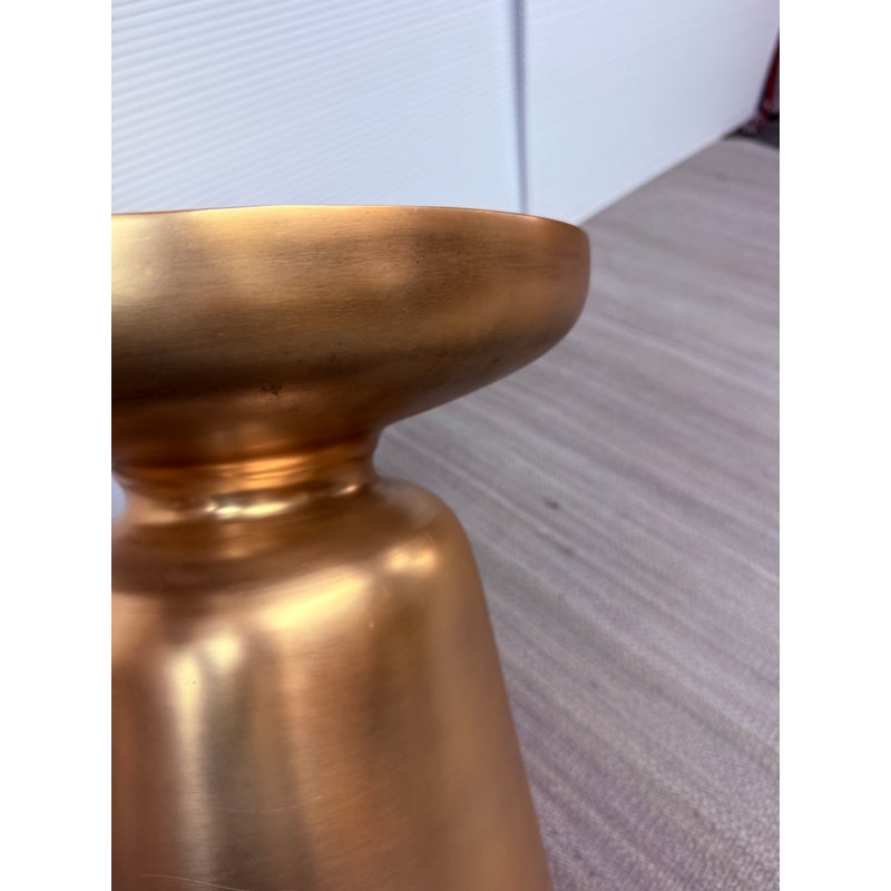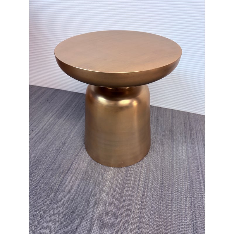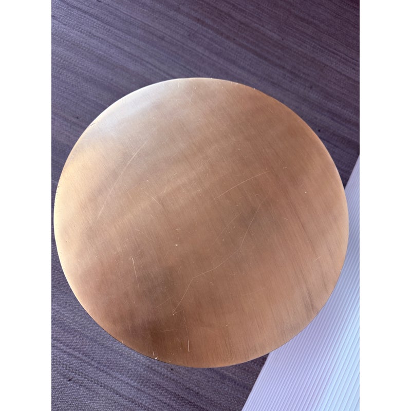 Design Plus Gallery presents a Martini Brass Side Table from West Elm. The side table is made of hollow lightweight aluminum in a dramatic shape with retro finesse. The table was given an antique brass metallic finish that naturally blends well with many color ways. The table can be used indoors or outdoors. Visible and minor wear scratches missing one padded support on base.