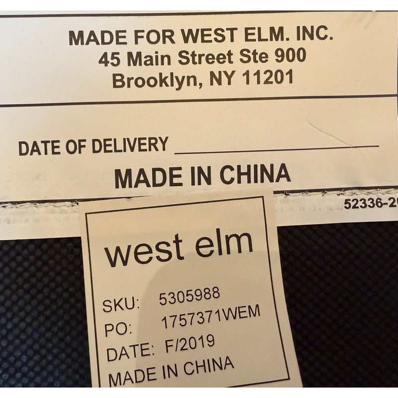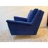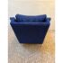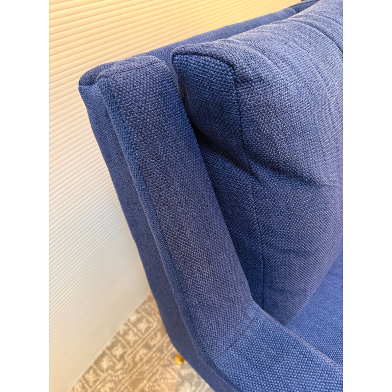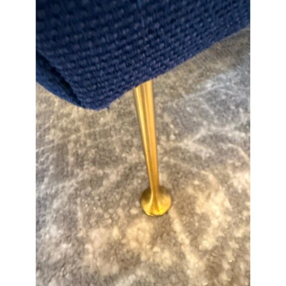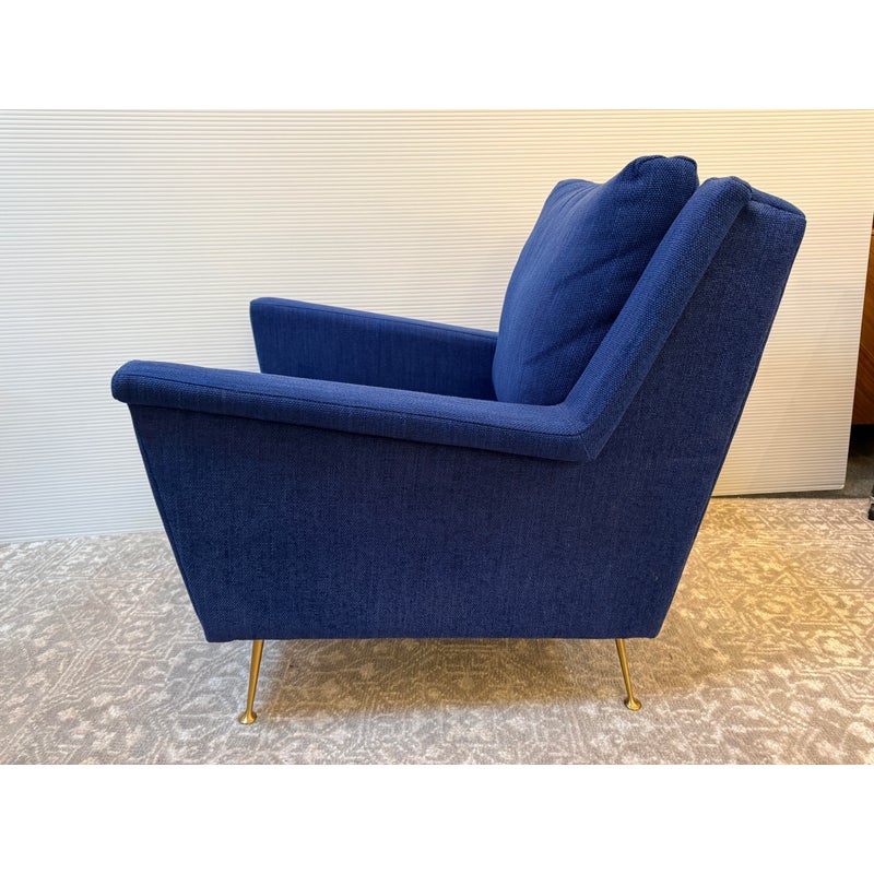 Design Plus Gallery presents a Carlo Arm Chair by West Elm. Designed with a strong, angular profile but with deep cushioning and timeless style. Textured wove deep blue upholstery wraps the frame as well as loose back and seat cushions. Elevated on satin brass legs. Light surface wear; condition is consistent with age and use; professional cleaning recommended.