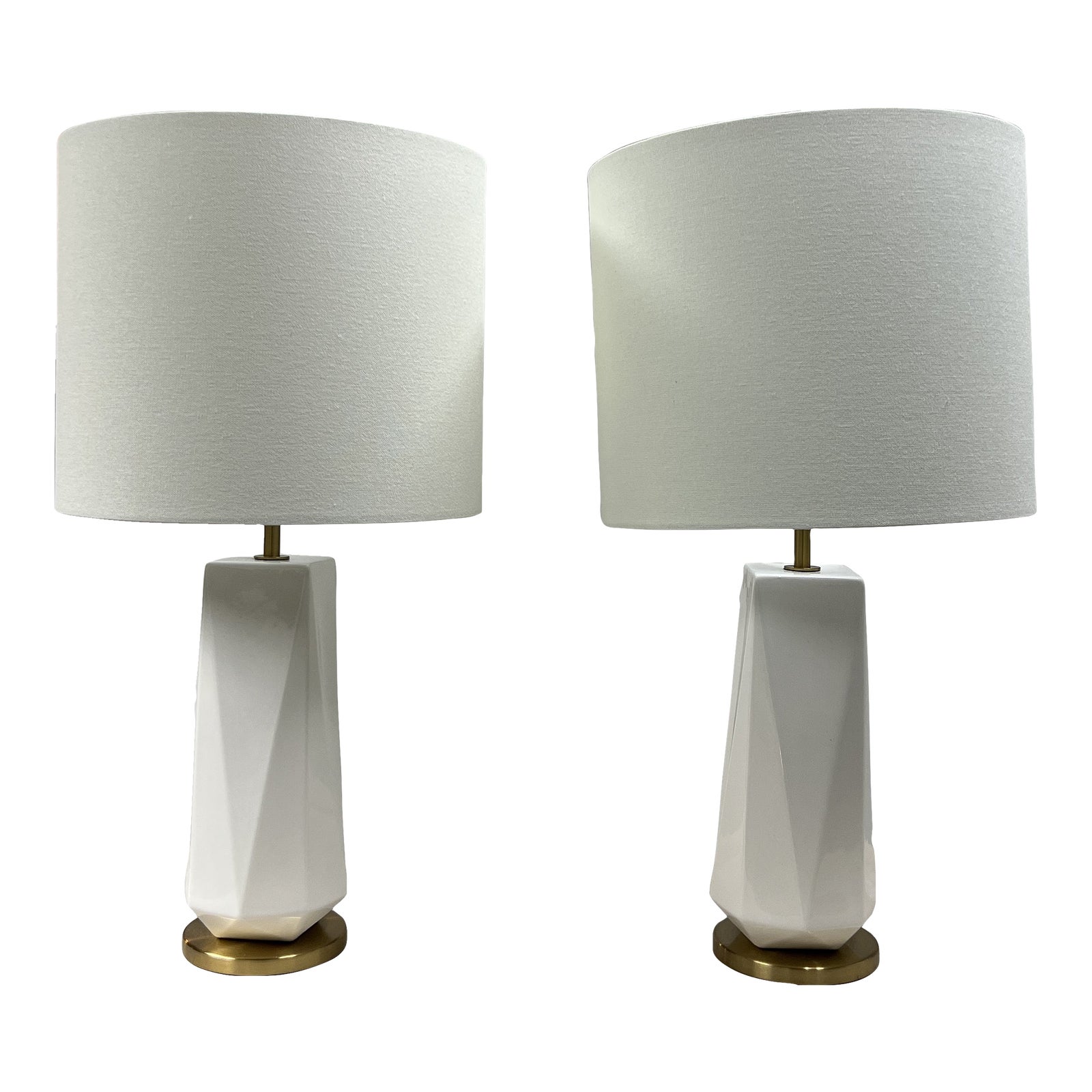 Design Plus Gallery presents a Pair of Faceted Porcelain Table Lamps by West Elm. A combinations of art with function. Crafted from durable porcelain that marries delicate form with strength, diamond-shaped beautifully catch the light. The base is in an Antique Brass finish. These are discontinued models. Made in China.