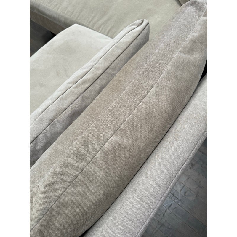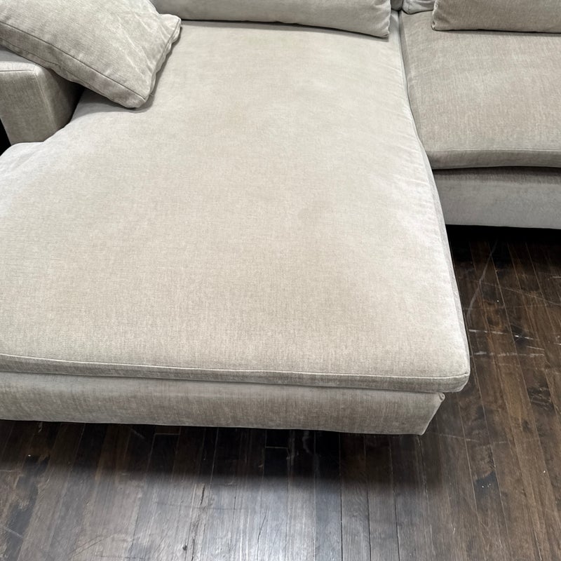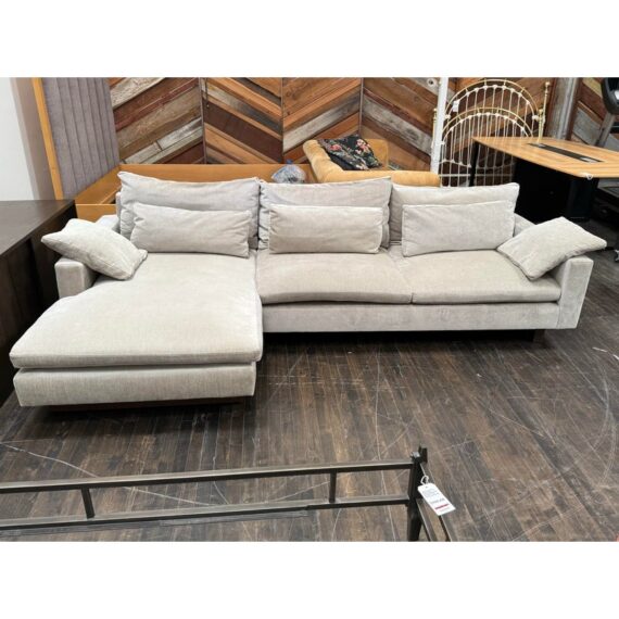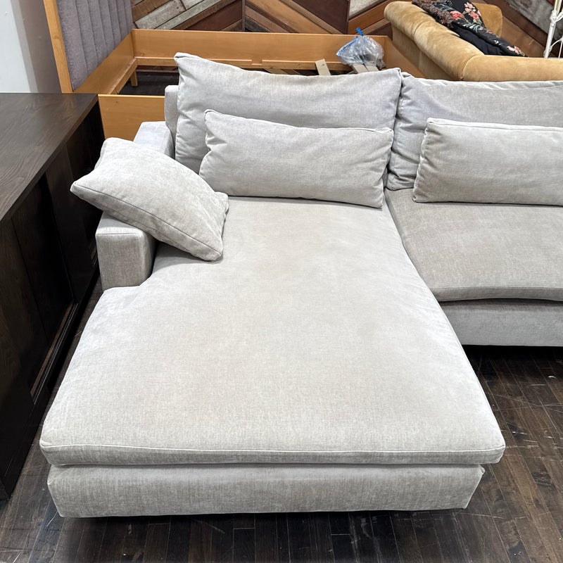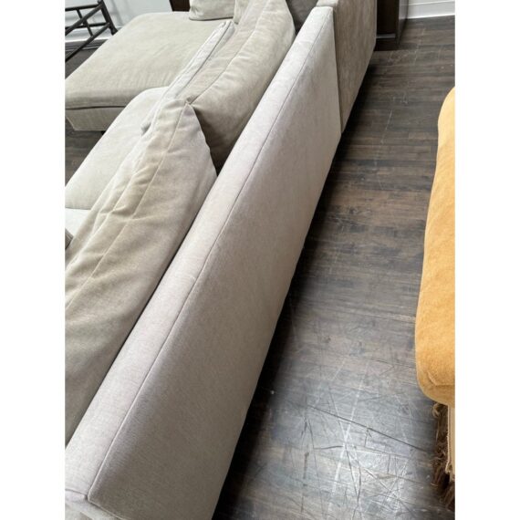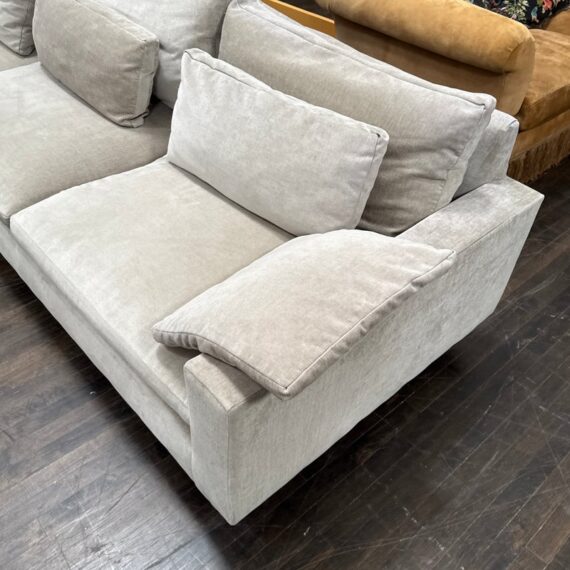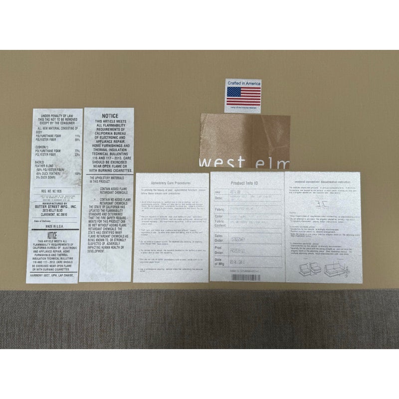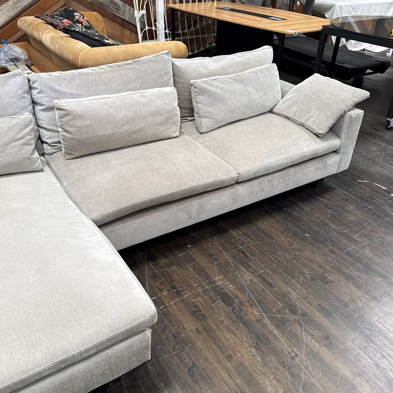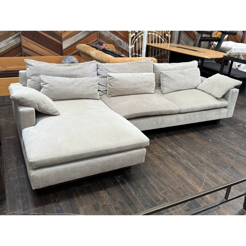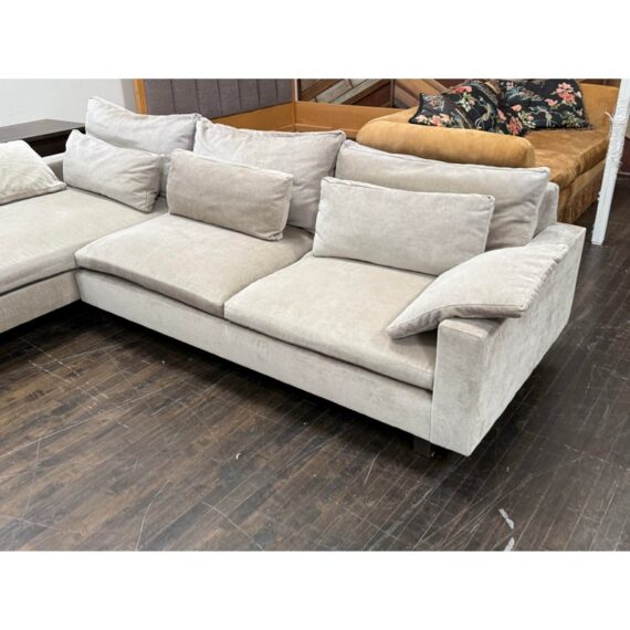 Design Plus Gallery presents Harmony Sectional with Chaise Lounge from West Elm. Harmony is their most comfortable sectional ever, thanks to its deep seat, plush cushions and go-anywhere lumbar and throw pillows. Made for sprawling out and enjoying a good show on, or even entertaining with plenty of friends/family around you. Is in good condition for its age with visible surface wear that is consistent with use. Would benefit with a professional cleaning. Made in the USA.