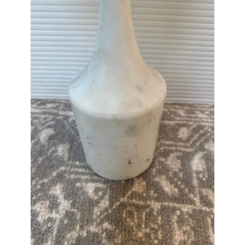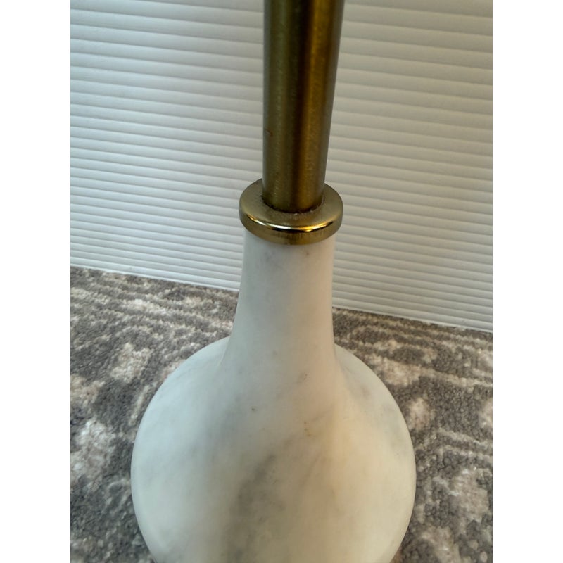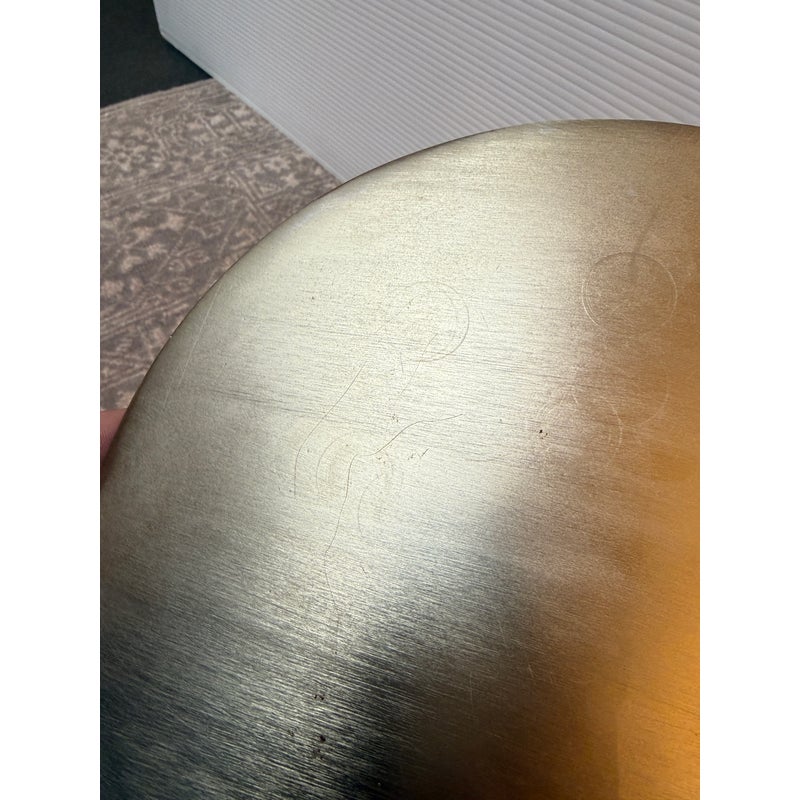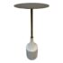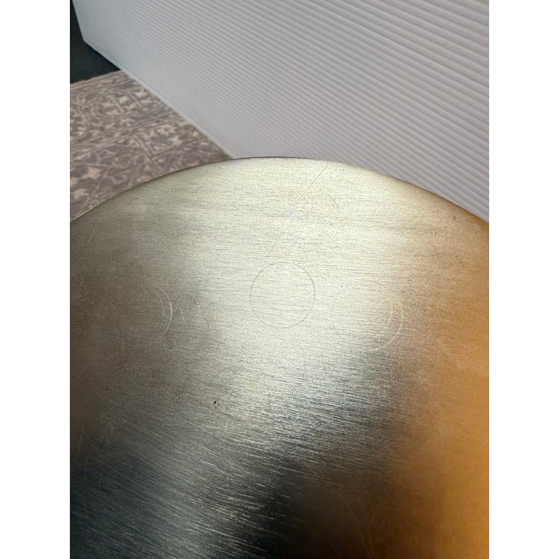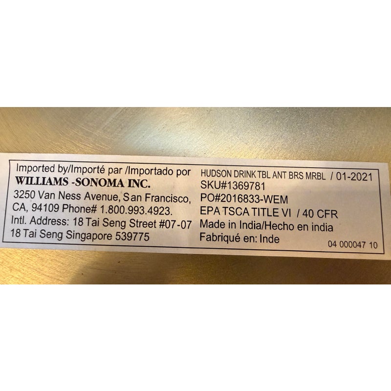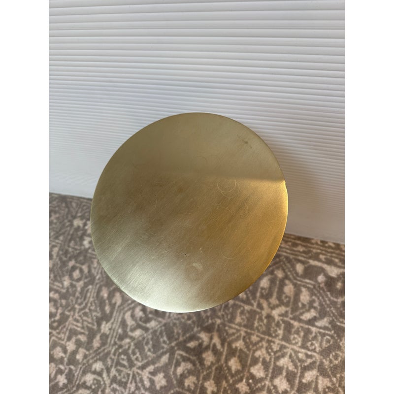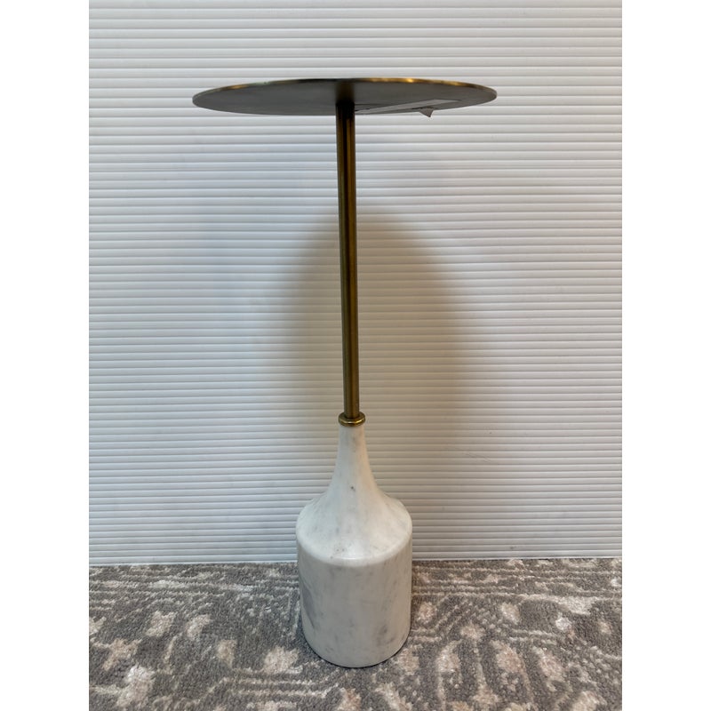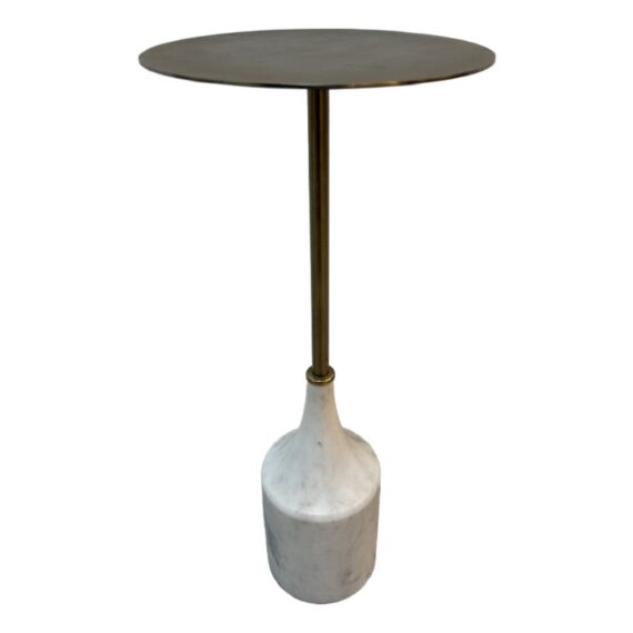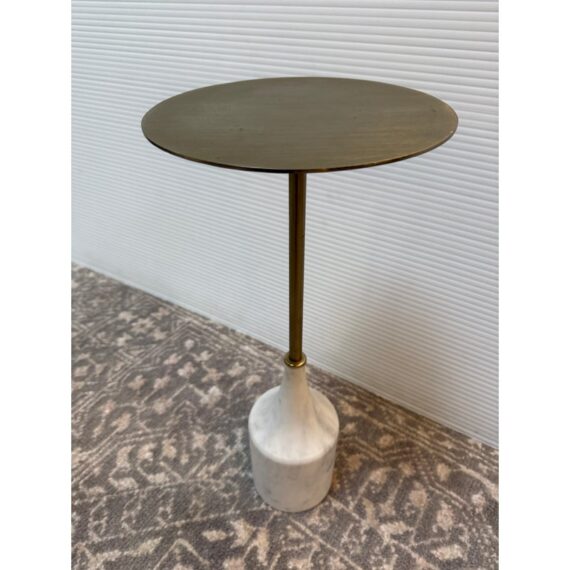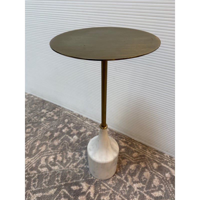 Design Plus Gallery presents a Hudson Drink Side Table by William Sonoma. A steel top and stem in an Antique Brass finish with solid white marble base. A mix of materials adds dimension to your space. Mid-century inspired, complementing your aesthetic. Just the right height for drinks or books. Compact in shape, so it’s small space friendly. Minor wear from usage. Made in India.