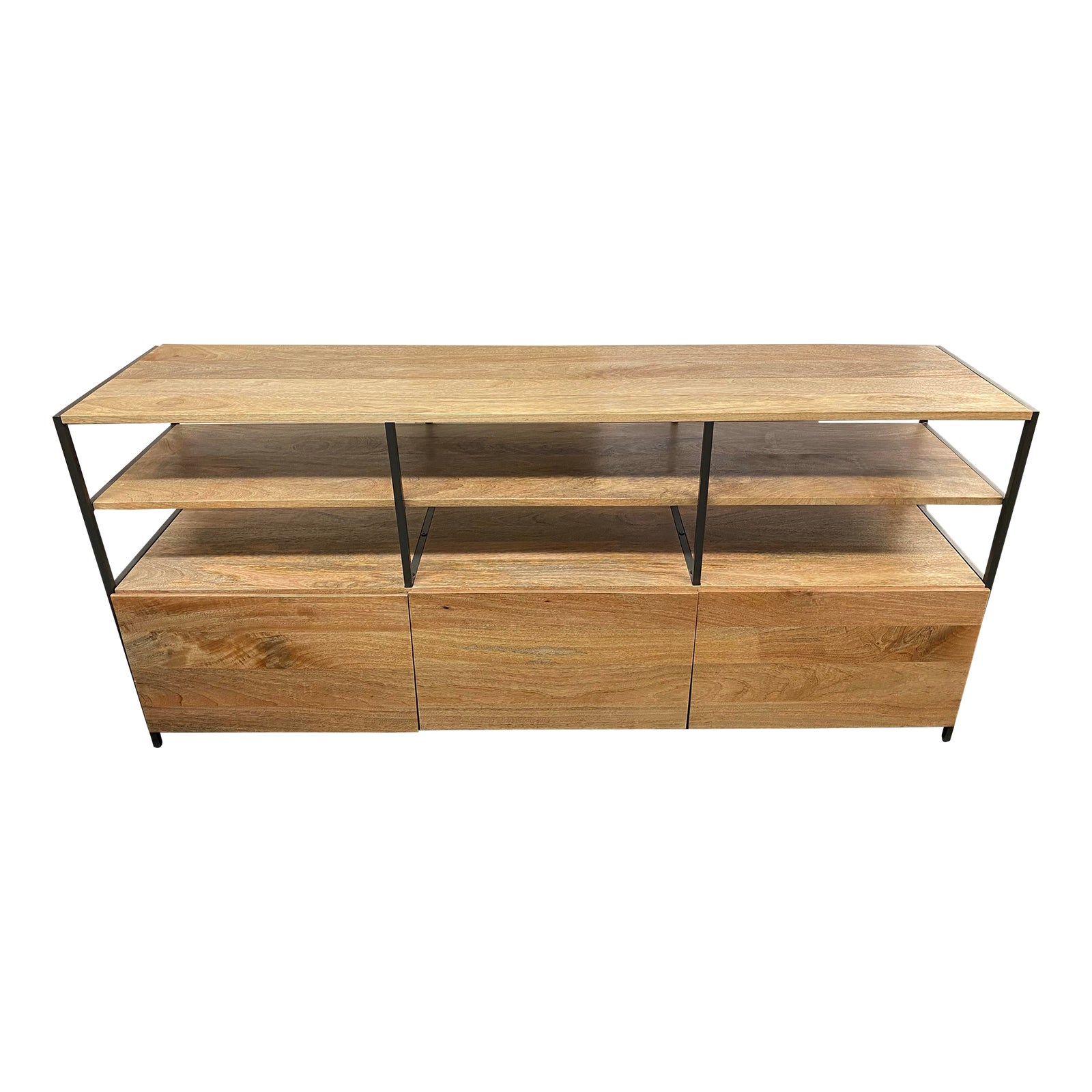 Design pLus Gallery presents a Modular Media Console from West Elm. Each cabinet inside the bottom swing doors allows for adjusting the shelves. Made of solid mango wood, with a natural finish, and a blacked steel frame + legs. Is in good condition with minimal wear.