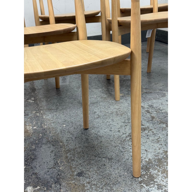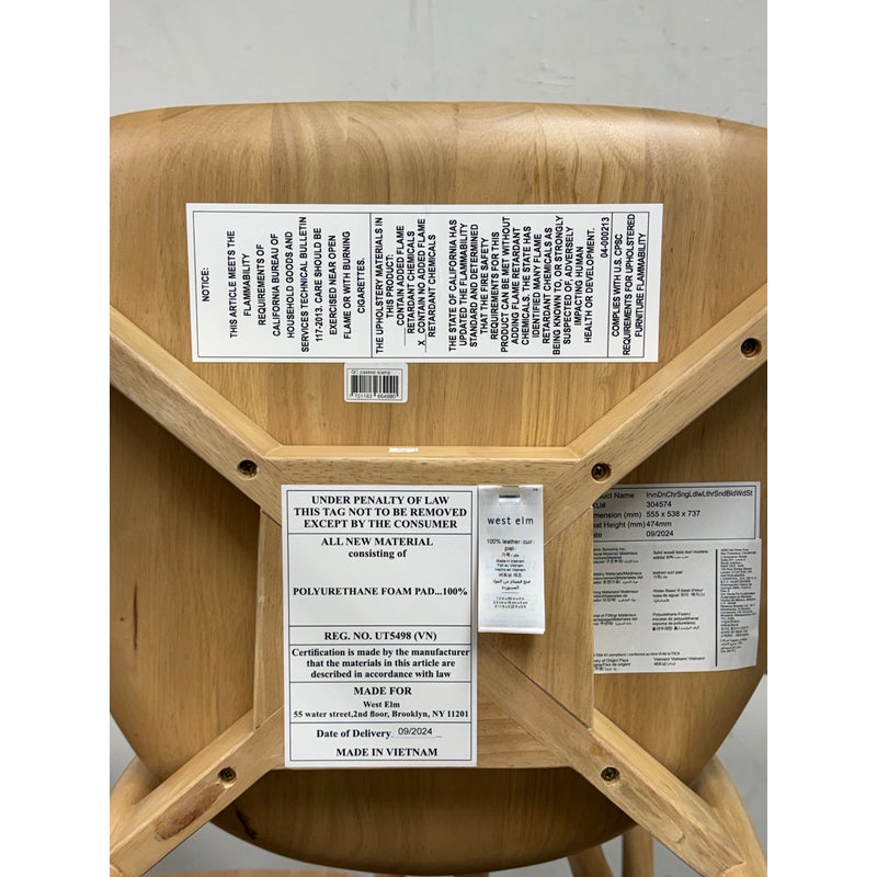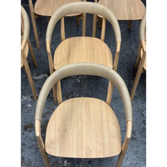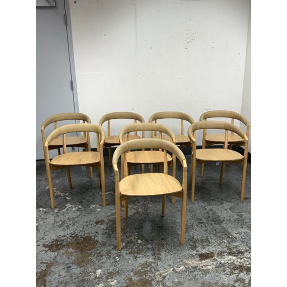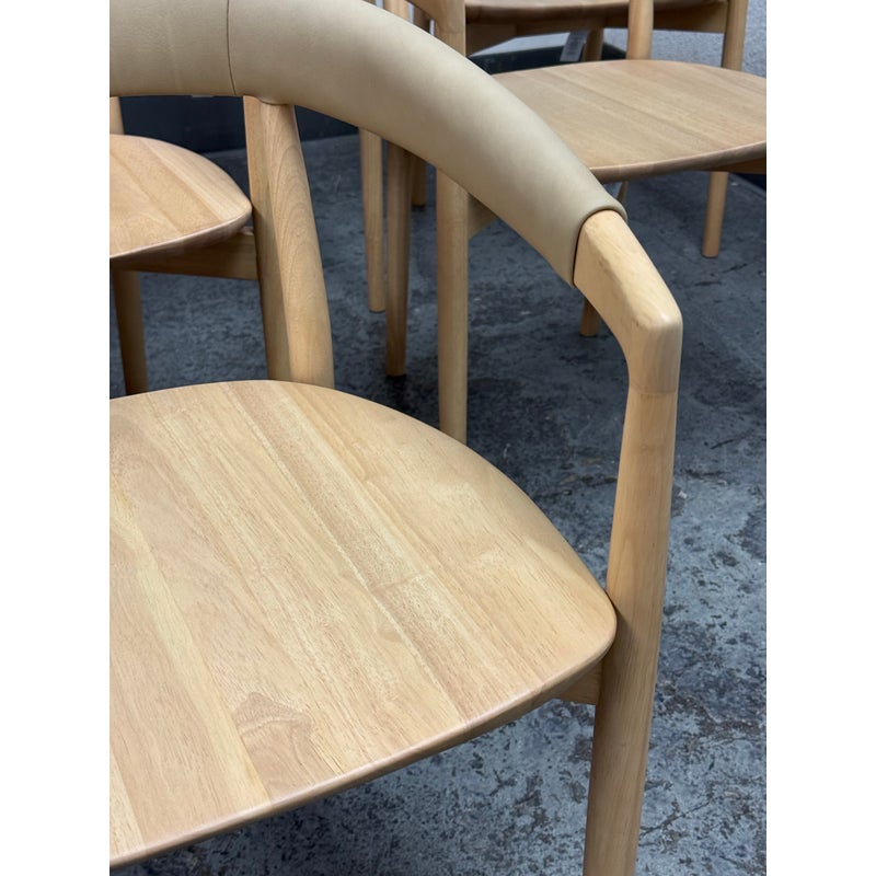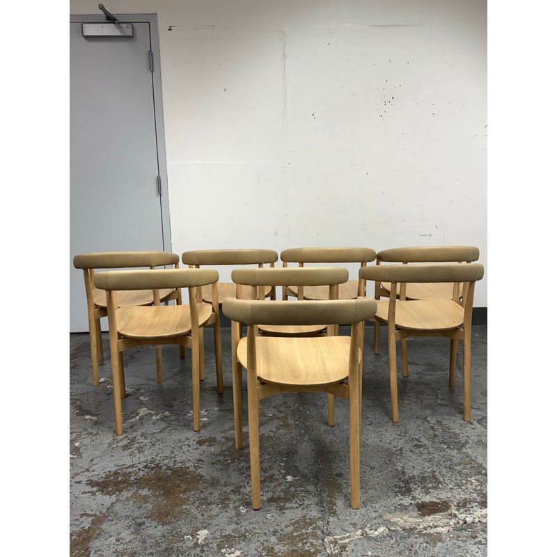 Design Plus Gallery presents a Set of Eight Irvine Leather Dining Chairs from West Elm. Designed to bring a clean, modern presence to the dining room. Each chair showcases a sculptural silhouette with gently curved lines that provide visual balance and everyday comfort. The backrest and seat are wrapped in top-grain leather upholstered in Ludlow Leather in a Sand color. Natural variation in color and texture is inherent to each hide, ensuring no two chairs are exactly alike and adding depth and character across the set. A solid rubberwood frame in a blonde finish grounds the design with durability and a light, versatile tone that pairs well with a range of table styles and interiors. These chairs work equally well in contemporary, transitional, or casual dining settings, making them a flexible choice for both everyday use and entertaining. They are in good condition, minimal wear. Made in Vietnam.