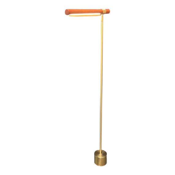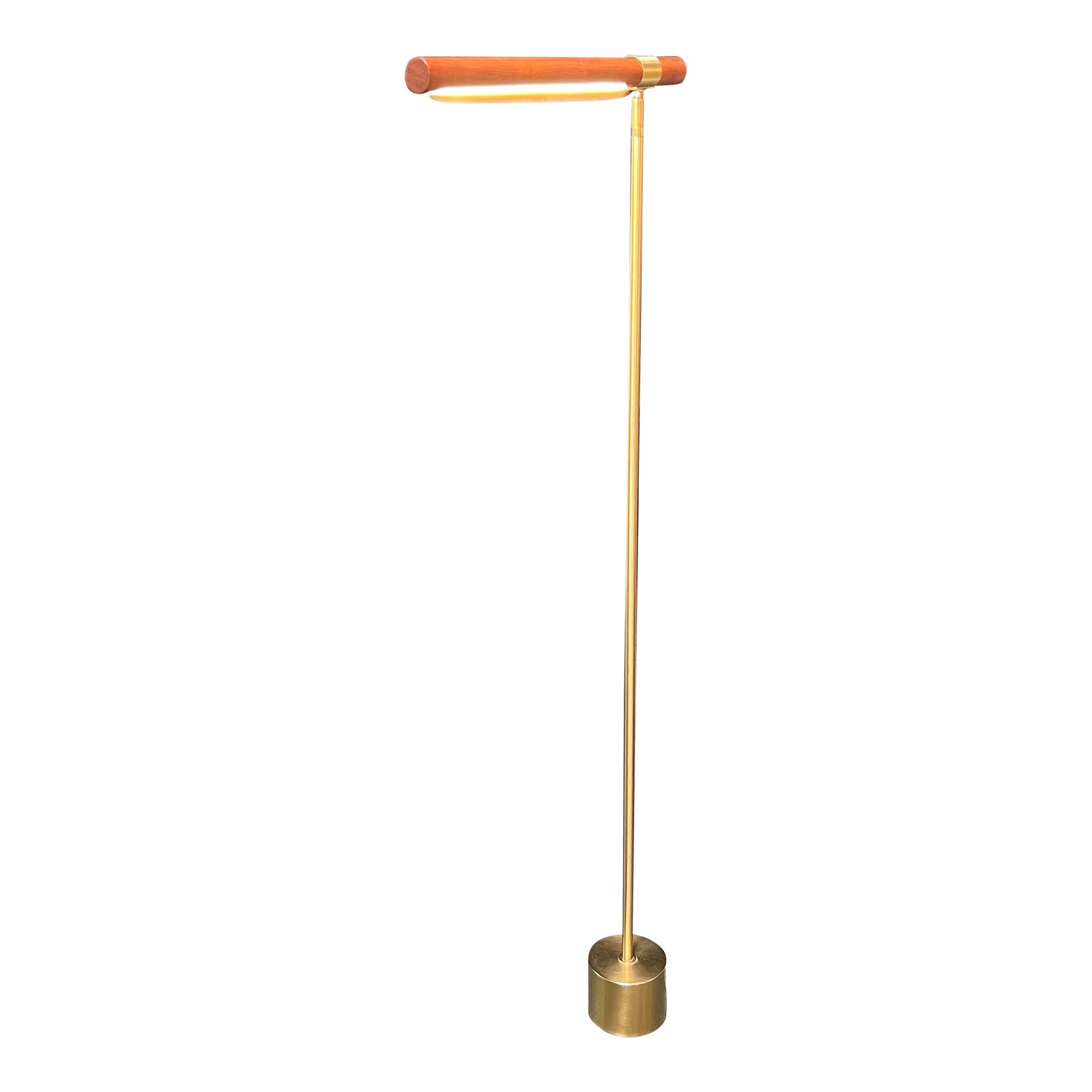 Design Plus Gallery presents a Linear Wood Led Floor Lamp by West Elm. A wood shade in a Walnut finish. Metal body in an Antique Brass finish. Features a white cloth-wrapped cord, adjustable head and In-line On/Off switch. Minor wear from usage. Made in China.