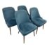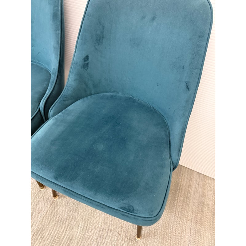 Design Plus Gallery presents a Set oF Four Mid-Century Dining Chairs from West Elm. The chairs have been inspired by mid-century Italian style with features of curved, tapered back and angled “toothpick” metal legs. The legs here have a burnished bronze finish with a dark teal, or their color Lagoon, distressed velvet upholstery. The play with color and their minimalistic yet sophisticated silhouette with a distinctive curved back will keep you coming back to sit upon. The chair style is a best seller with the brand and the color is no longer in production with West Elm. They do show signs of wear around the seams that is consistent with age + use.