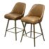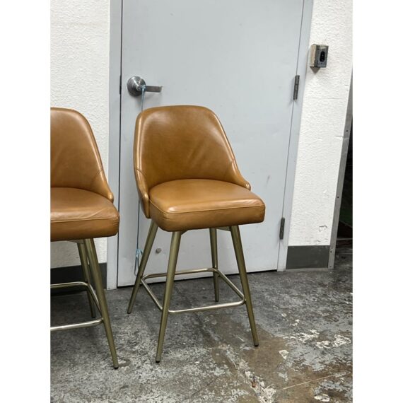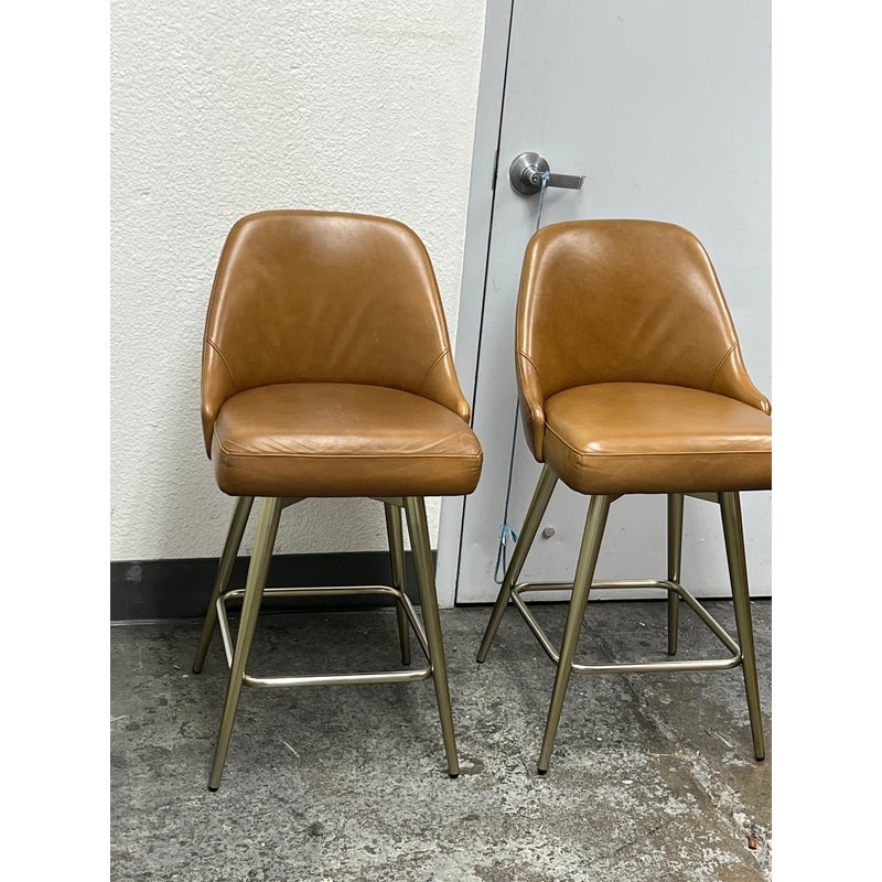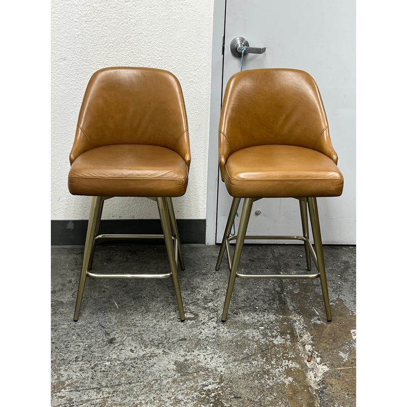 Design Plus Gallery presents a Pair of Mid Century Swivel Stools from West Elm. Presents timeless mid-century design to your space with simple, sloped silhouette wrapped in Leather. A smooth 360 degree swivel mechanism offers a panoramic view of the room. Cushioned comfortable seat is elevated to counter height on blackened brass legs with footrest. Light surface wear; condition is consistent with age and use.