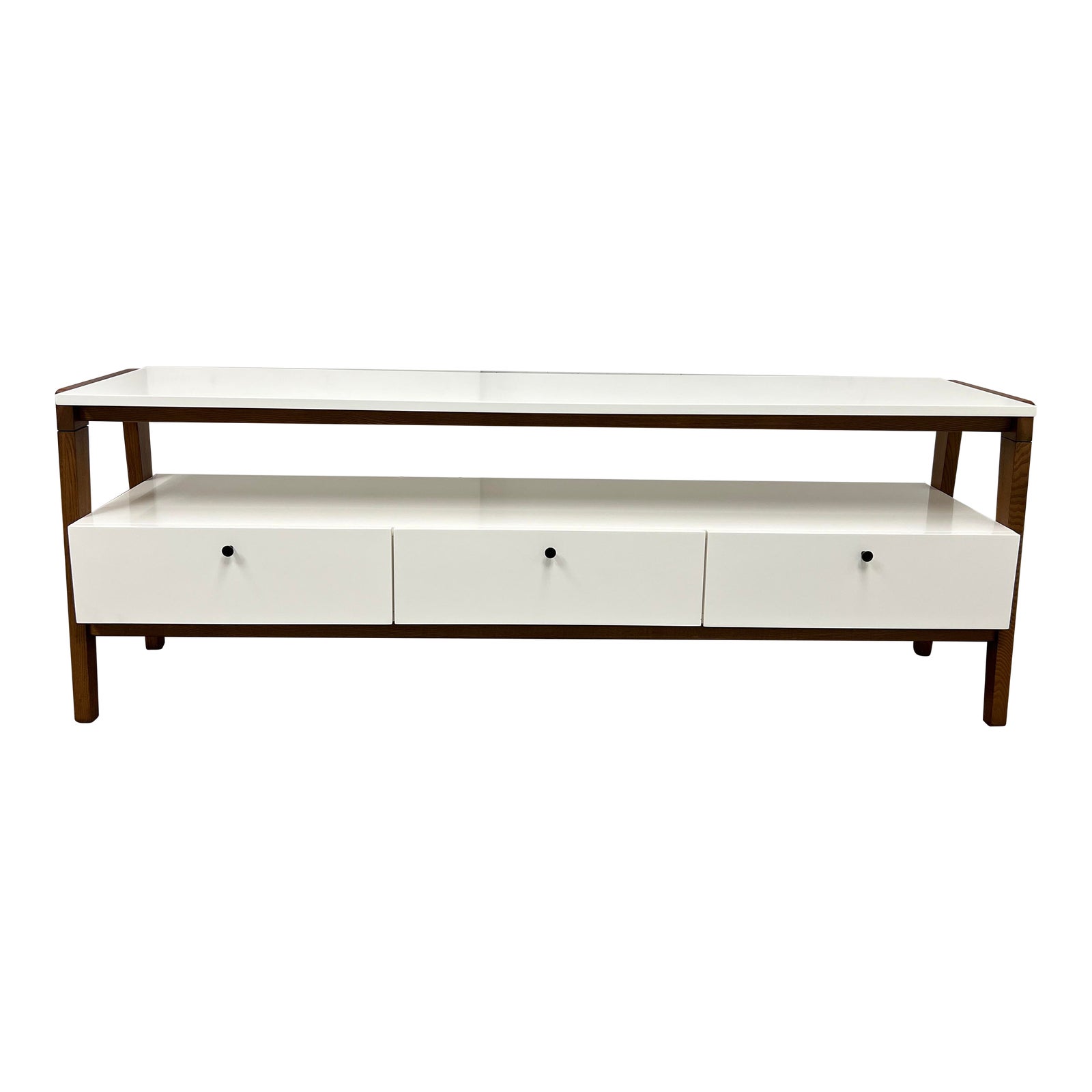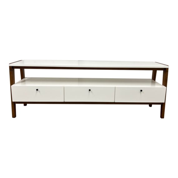 Design Plus Gallery presents a Modern Media Console by West Elm. Inspired by Scandinavian modernism, a sleek body with a pecan-finished frame and beautifully angled legs. A storage piece that’s easy on the eyes and fits in with an eclectic mix of furniture. Solid wood legs in Pecan finish, engineered wood body in White lacquer with gunmetal-finished hardware detail. Features three drawers that open on smooth metal glides. Minor wear from usage. Made in Vietnam.