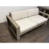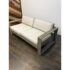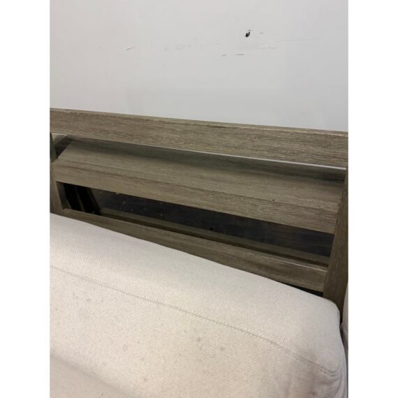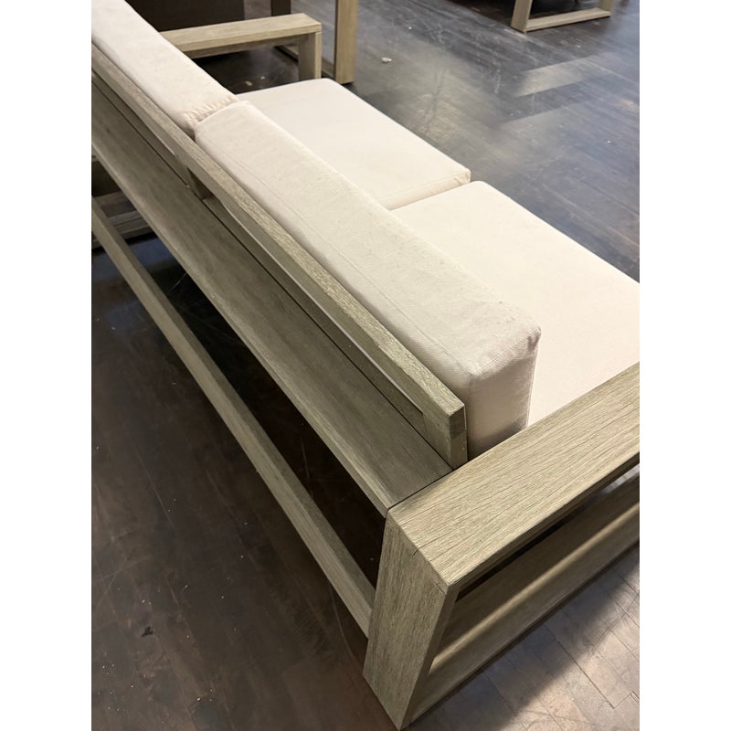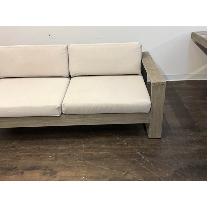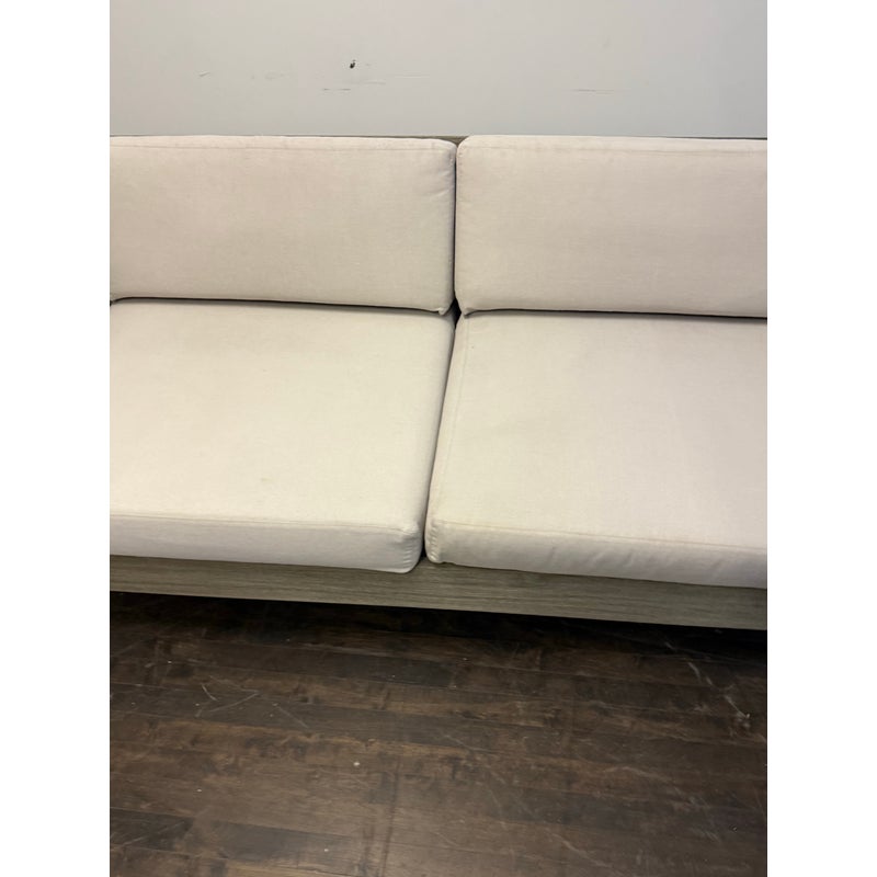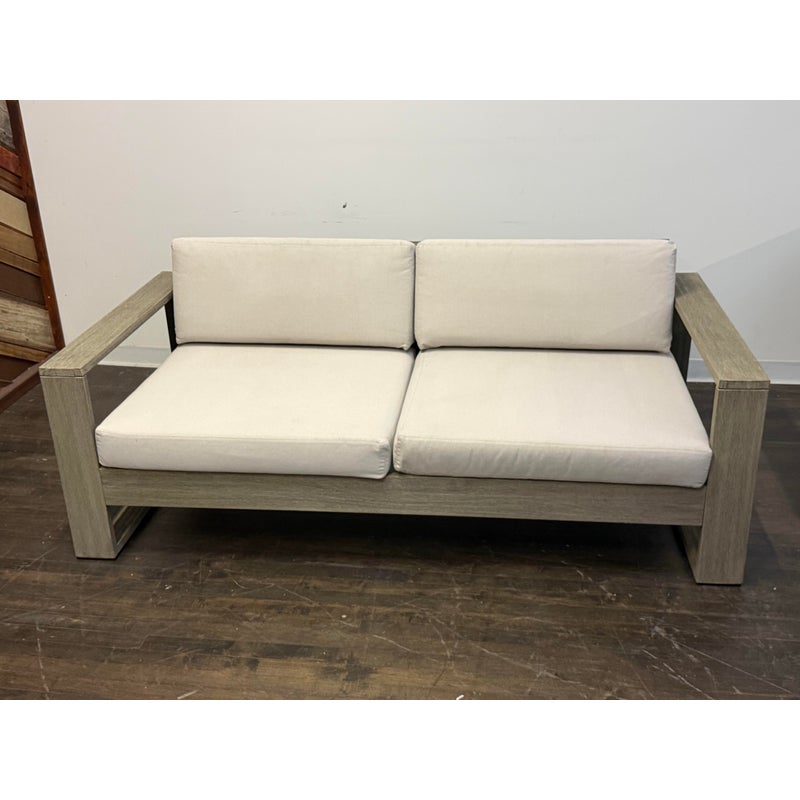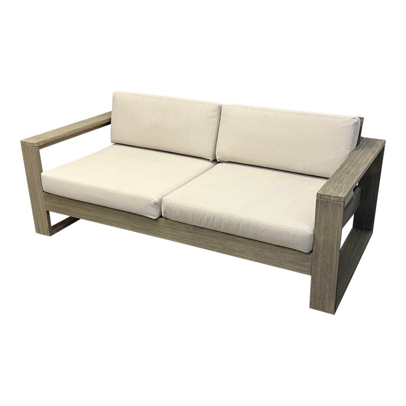 Design Plus Gallery presents a Portside Outdoor Sofa from West Elm. This contemporary two seat sofa is defined by bold lines and a substantial wood frame. The wide plank arms and base display a soft gray-toned wood grain, creating a clean architectural profile. Two thick seat cushions and two supportive back cushions are upholstered in a neutral fabric that is maintainable for the outdoor elements. The low, linear silhouette emphasizes proportion and structure, balancing solid construction with plush upholstery for a composed, modern aesthetic. It is in good condition, with visible and minimal wear from usage.