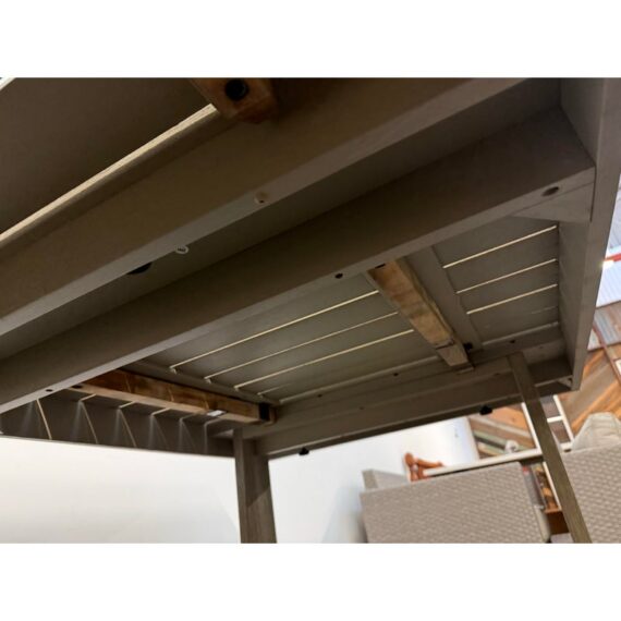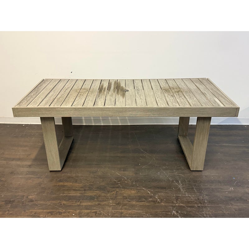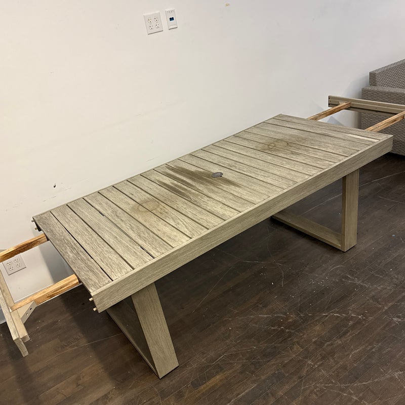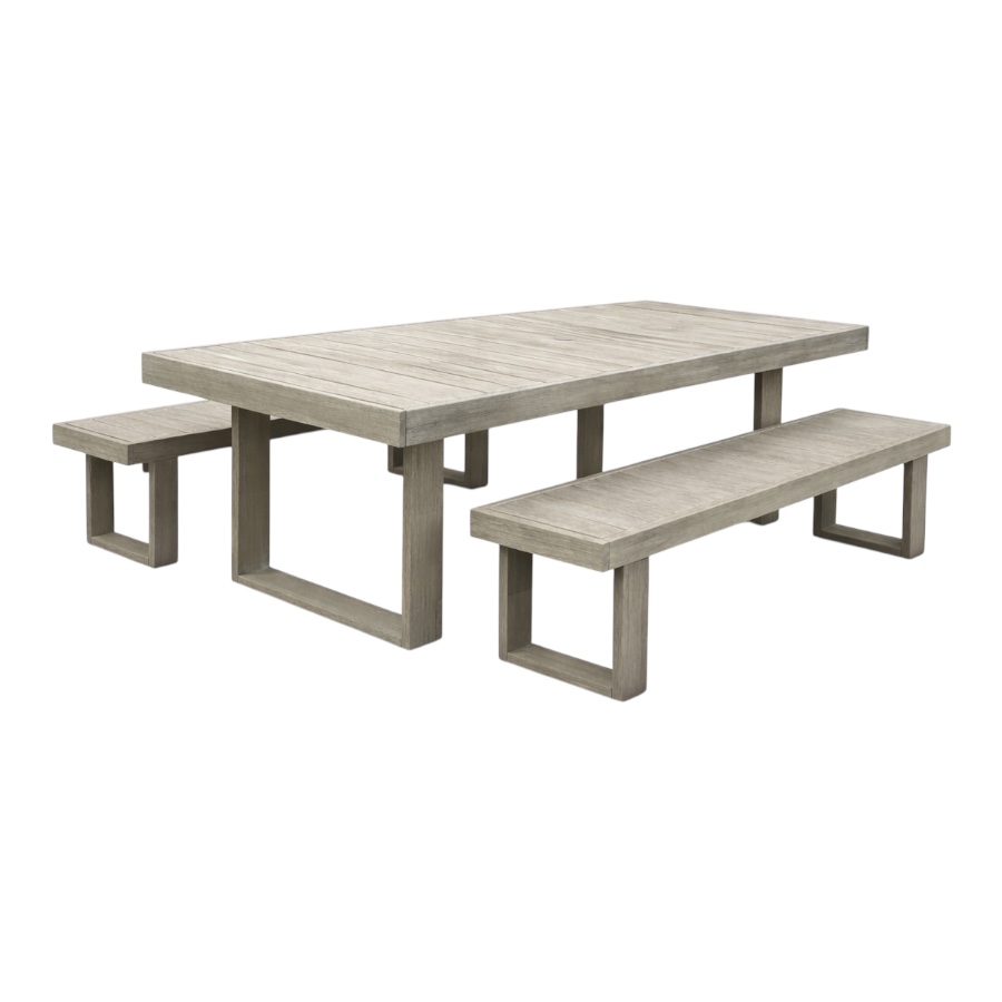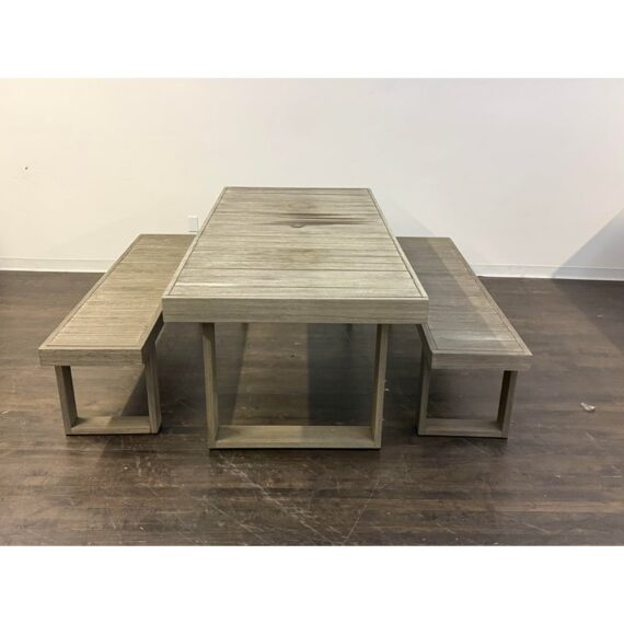 Design Plus Gallery presents the Portside Wood Outdoor Extension Dining Table Set from West Elm. The set includes an Extenting Portside Dining Table and two matching Portside Dining Benches. Made from moisture-resistant solid mahogany and solid eucalyptus wood, the set offers a substantial, clean-lined look with a slatted plank top and bold, squared base supports. Their Weathered Gray stain highlights the natural wood grain while giving the overall design a relaxed, coastal-inspired tone. Coordinating benches mirror the table’s streamlined profile, creating a cohesive and balanced set with strong, modern proportions. This set shows visible wear from outdoor usage.
