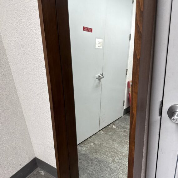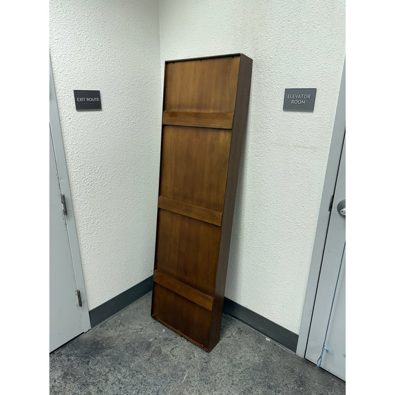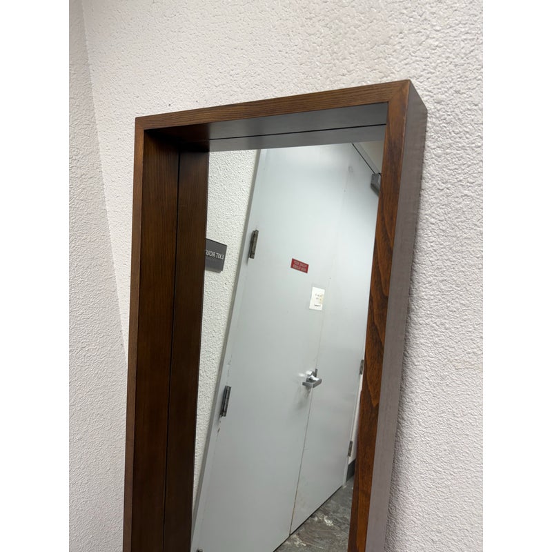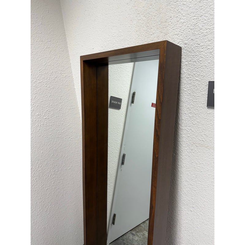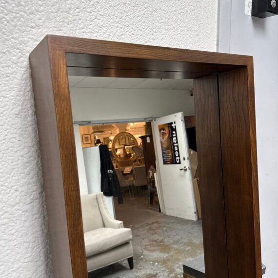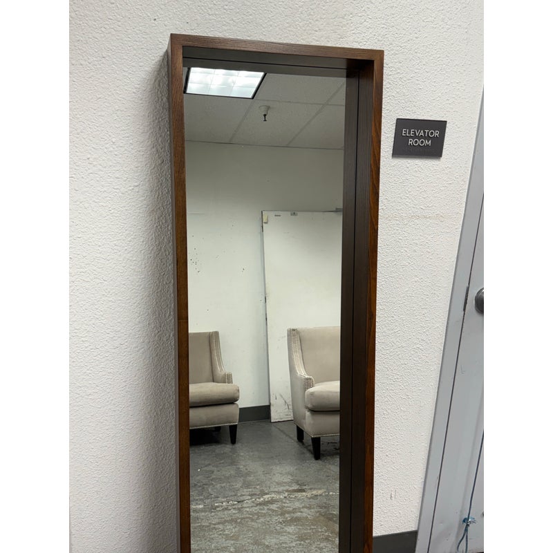 Design Plus Gallery presents the Shadowbox Floor Mirror from West Elm. The recessed mirror is placed back from the frame that is a medium brown walnut finish. The back side offers panel work that allows this piece to rest upon the wall as a lean or hung on the groves. It is in good condition with minimal wear from usage.