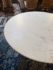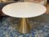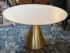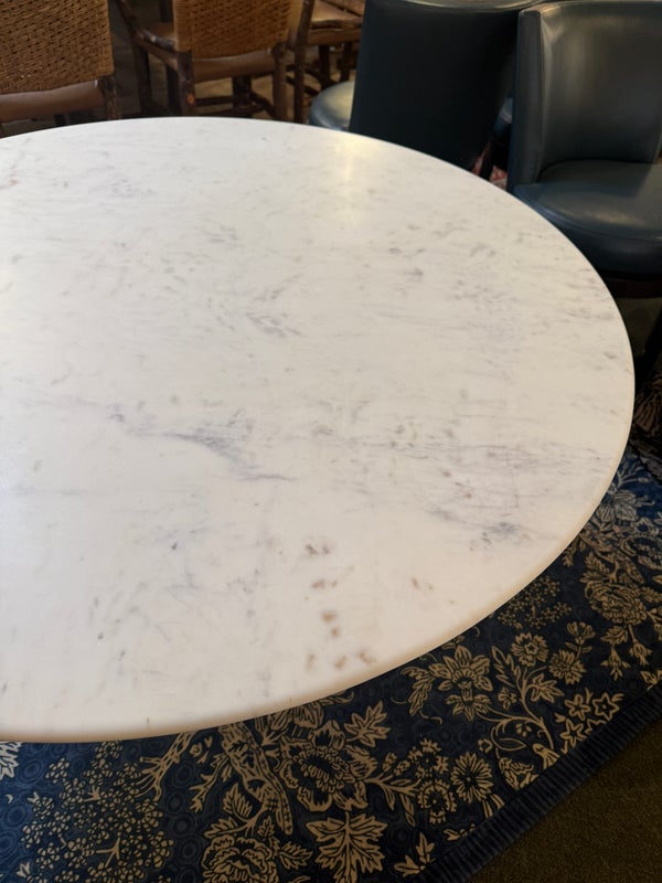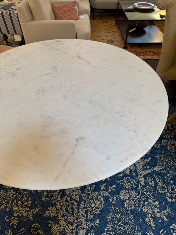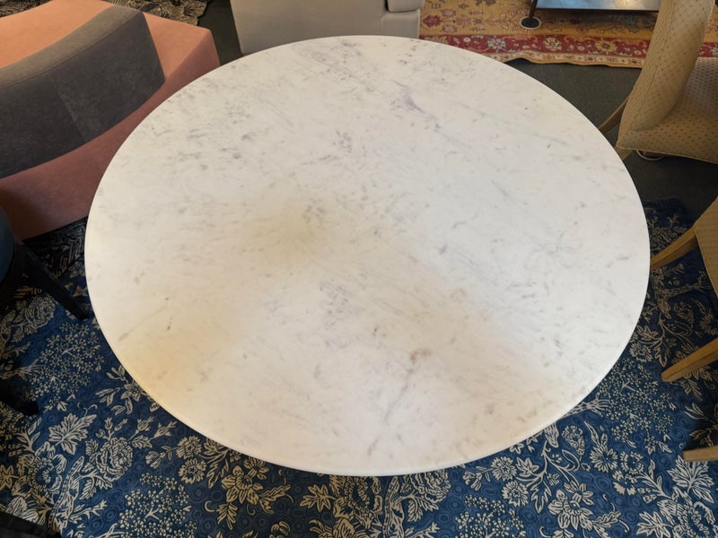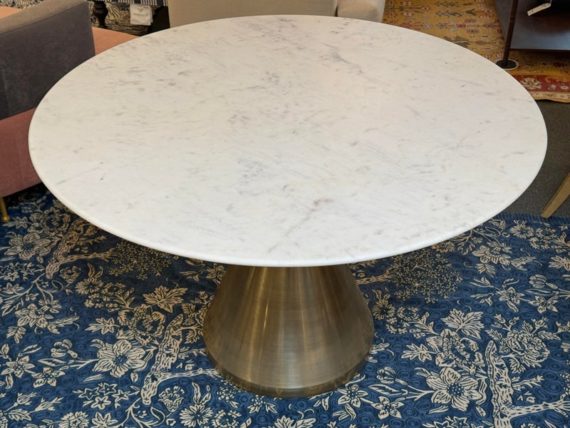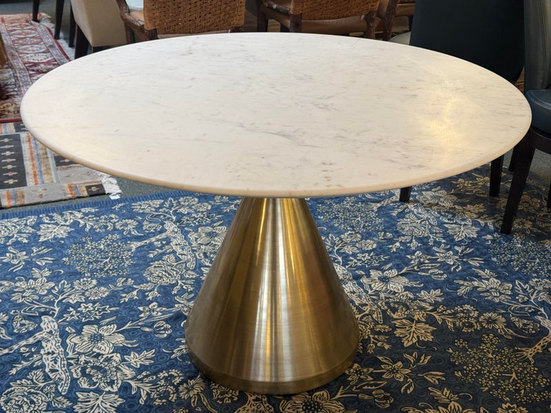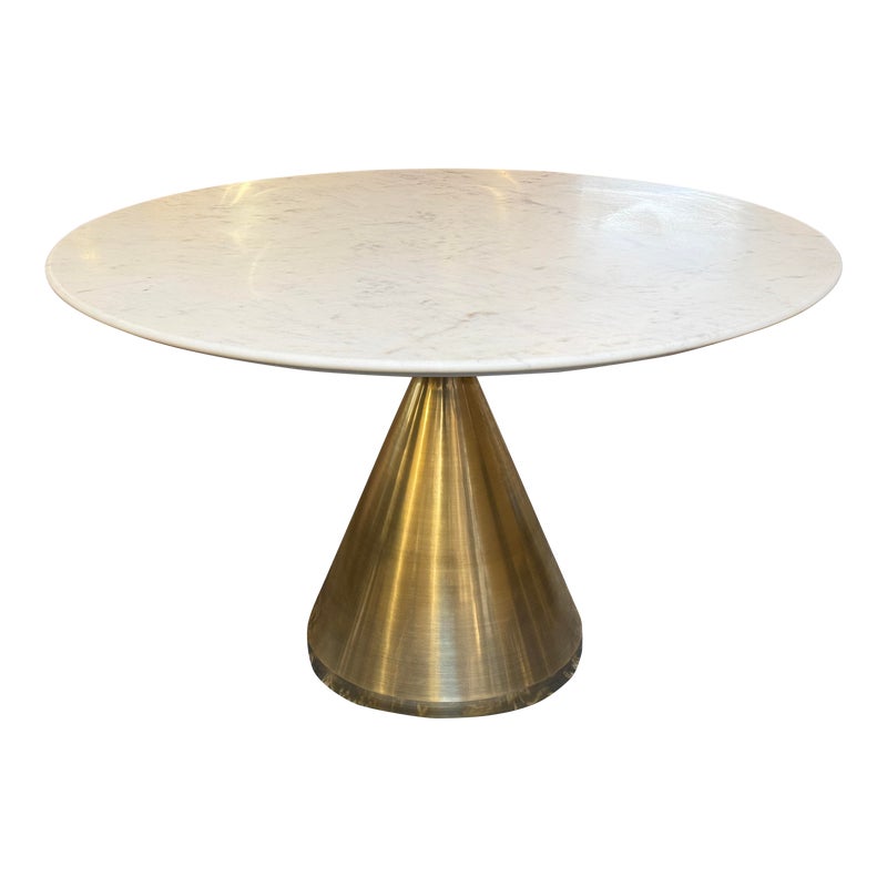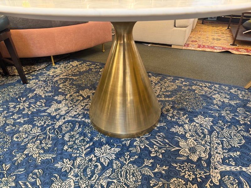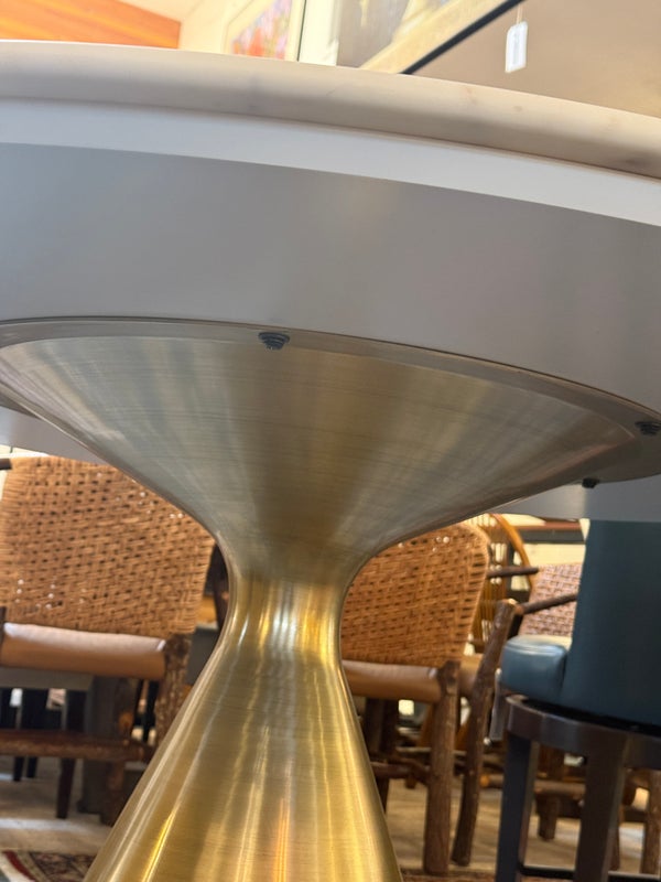 Design Plus Gallery presents a Silhouette Dining Table by West Elm. The dramatic shaped metal base makes a modern statement in an antiqued brass finish. The perfectly scaled pedestal table is topped with lovely grey veined sealed marble. Condition is good, minimal wear.