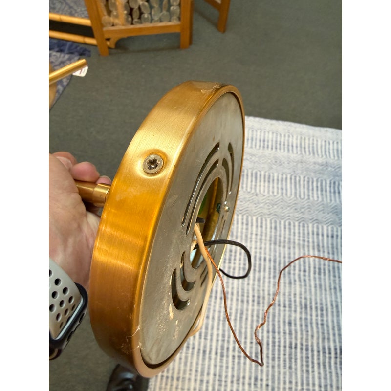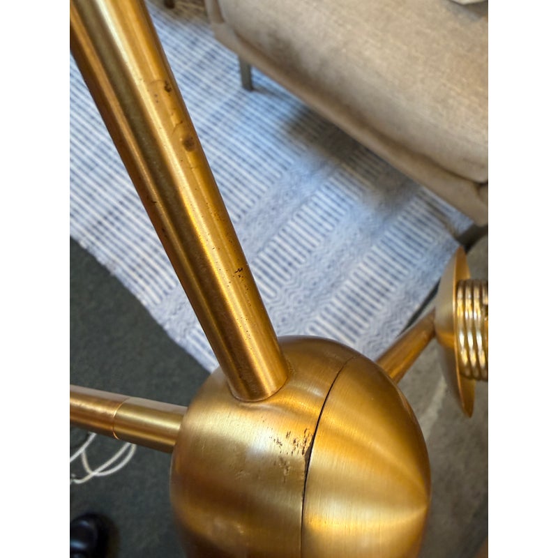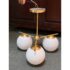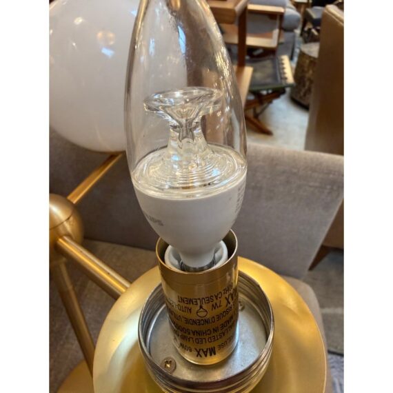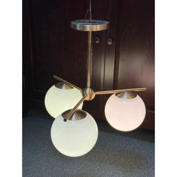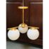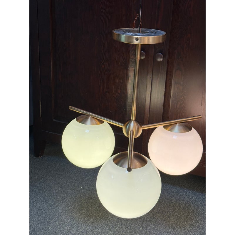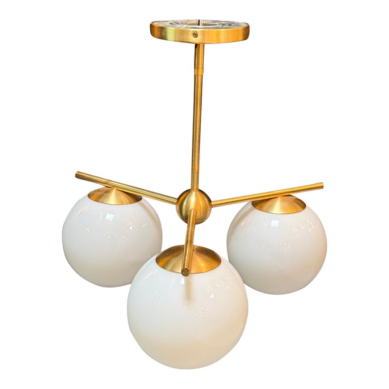 Design Plus Gallery presents a Sphere & Stem Chandelier by West Elm. Three milk glass globes, elevated with brushed brass, emit a warm and inviting glow. The central column can be adjusted in height or shortened to achieve a semi-flush mount. Condition is good for age and use.