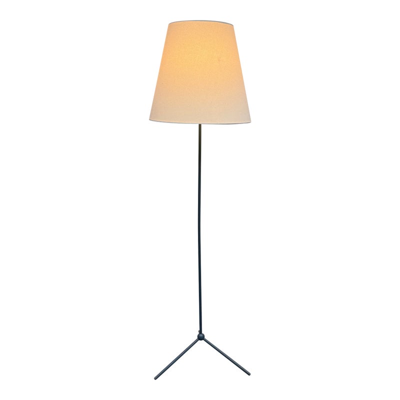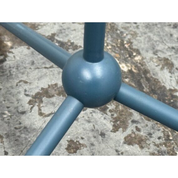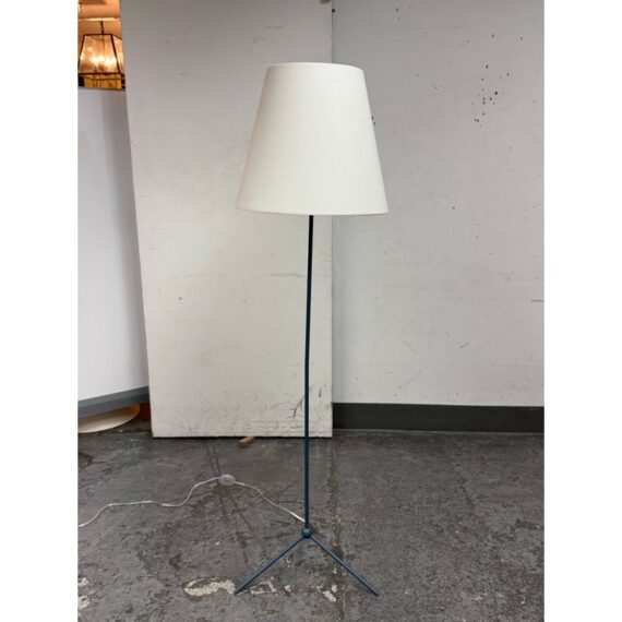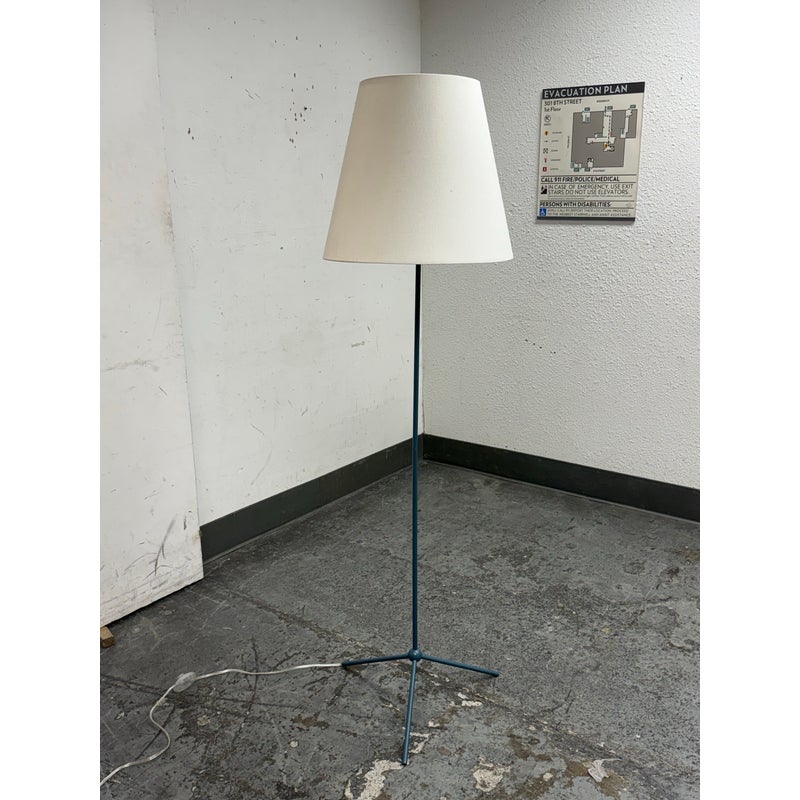 Design Plus Gallery presents a Tapered Shade Floor Lamp from West Elm. This floor lamp pairs an off-white tapered shade with a slim blue metal stem and tripod base for a balanced, sculptural silhouette. The round center joint and angled legs give the piece a distinct geometric profile, while the softly textured shade adds contrast to the streamlined frame. This is a discontinued model with the brand and is in good condition with visible and minimal wear from usage.