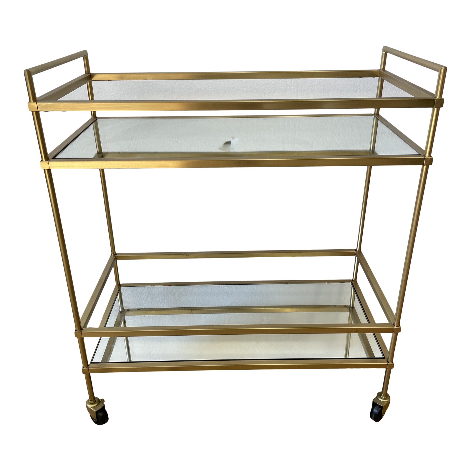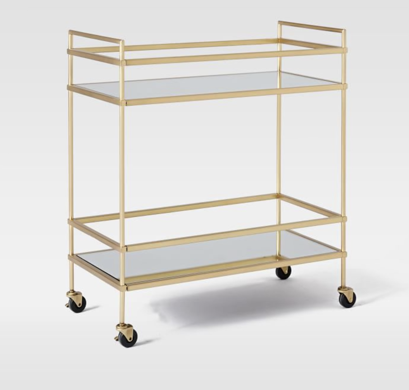 Design Plus Gallery presents a Terrace Bar Cart by West Elm. The metal frame is n a gold finish.