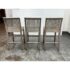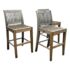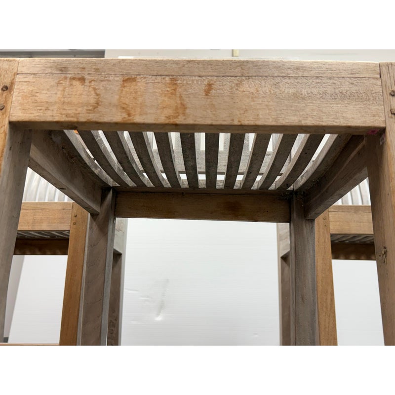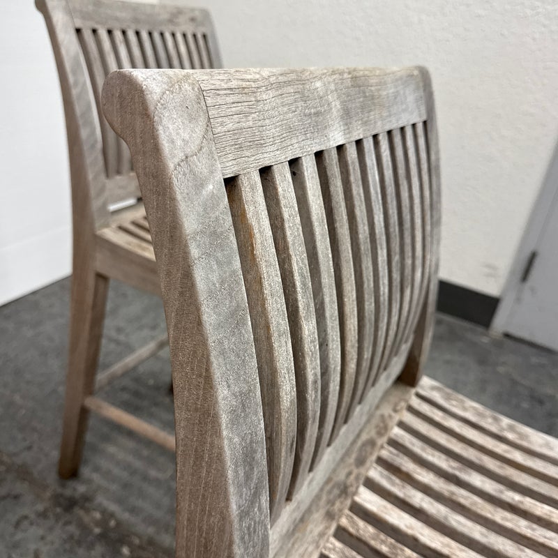 Design Plus Gallery presents a Set of Three Counter Stools from Westminster. Set of three outdoor counter stools crafted from solid teak, naturally weathered to a soft silver-gray patina. The slatted backs and slatted, gently curved seats offer both quick drainage and comfortable support, while the visible heavy and discoloration from age and use lend a rich, lived-in character. In fair condition, visible wear from usage.