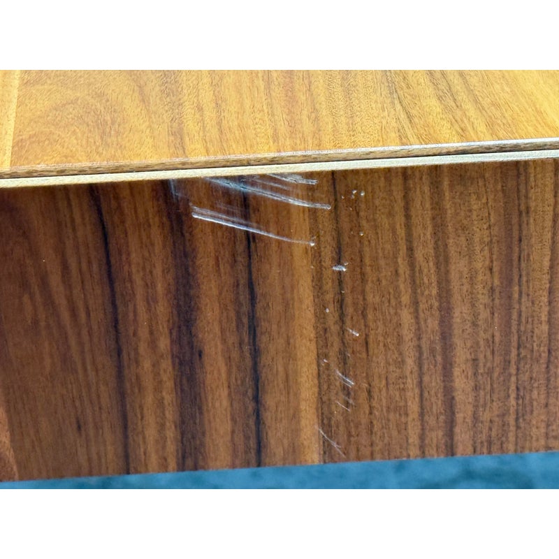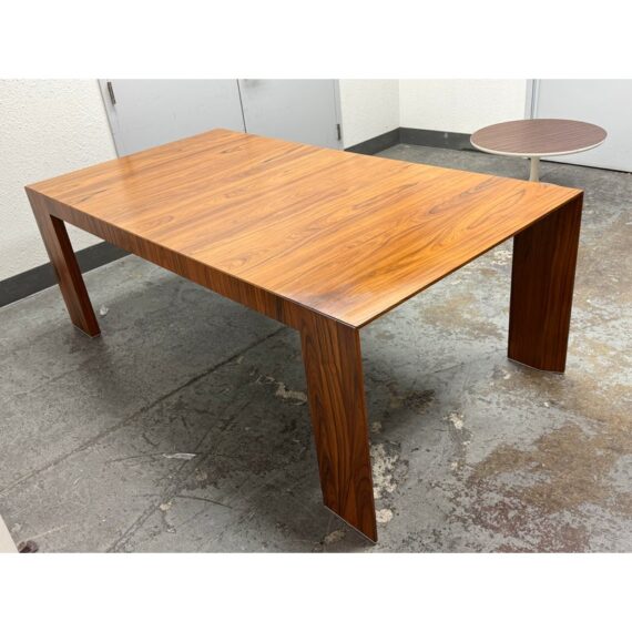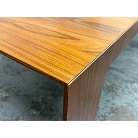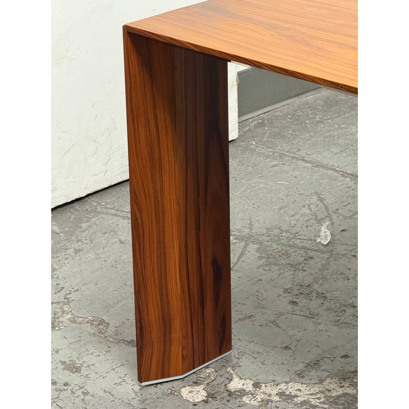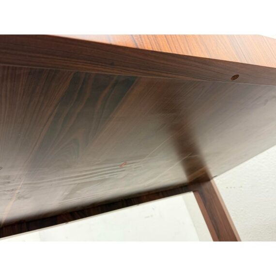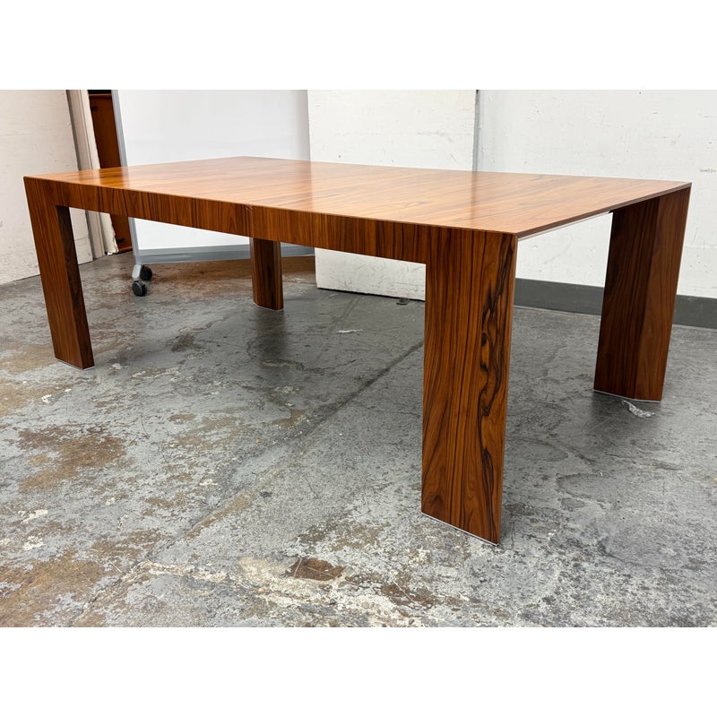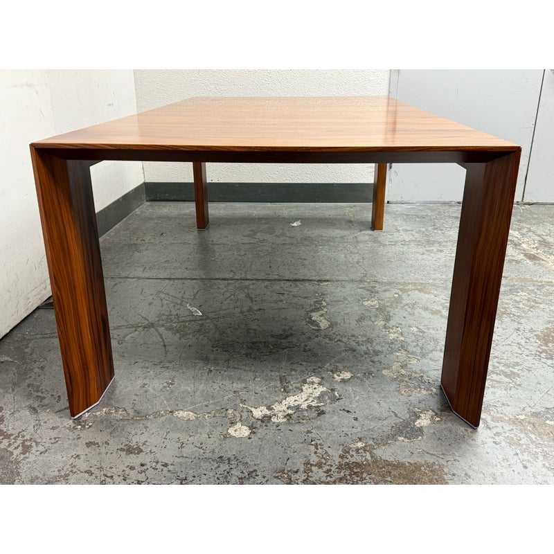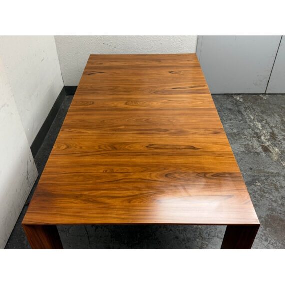 A study in restraint and precision, the embodies Hannes Wettstein’s modern sensibility with clean, simple, and powerful lines. Crafted in richly figured Santos rosewood, its rectangular top sits over an architectural rectangular frame, creating a crisp, elegant silhouette that suits both dining and meeting spaces. Was a Showroom Sample, In good condition, visible scratches and wear from usage. Made in Italy.