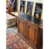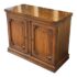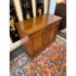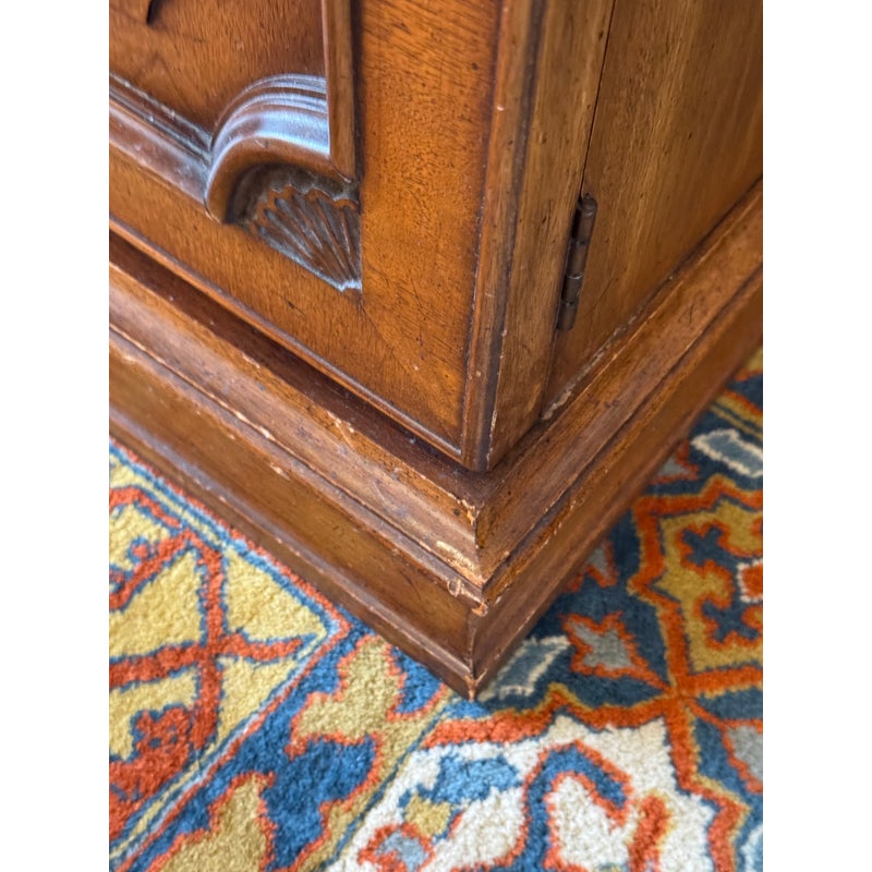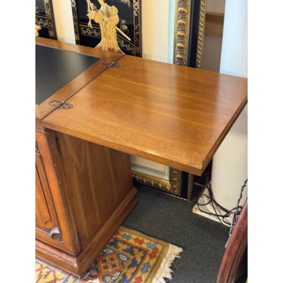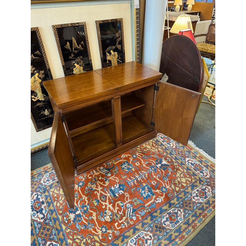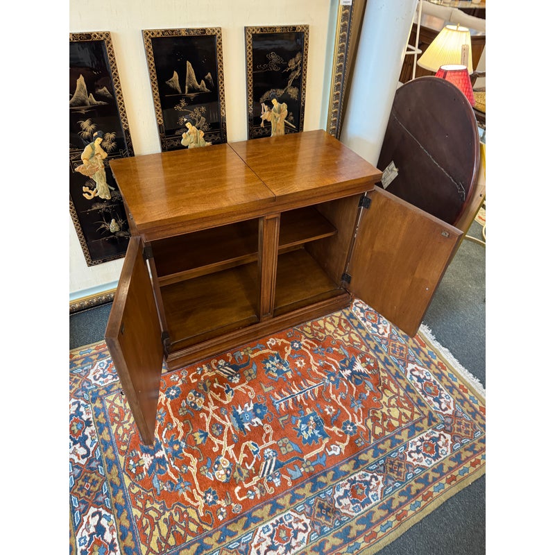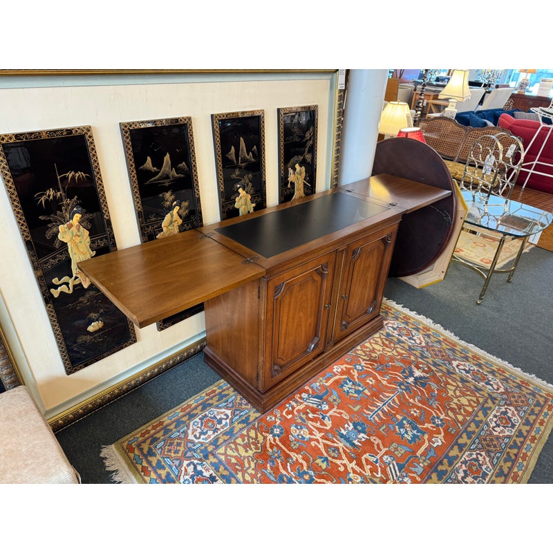Design Plus Gallery presents a Walnut Wood Buffet with a Flip Top White Fine Furniture. The buffet/bar has a rectangular form made from walnut wood that has a honey brown stain. The top flips open for service with black laminated surface when open to protect from liquid damage. There are two cabinet doors with molded paneling and carved fans along the corners. The buffet is in good condition with visible wear to the veneer that is consistent with age + use.
