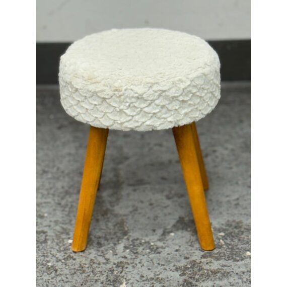 Design Plus Gallery presents a White Fluffy Stool. It features a soft, textured, faux fur, providing a cozy and inviting feel. The stool is supported by sturdy wooden legs in a mid-century modern style. It can serve as extra seating, In good condition, minimal wear.