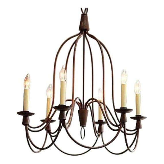 A rustic 6 light French Country chandelier from William Sonoma. This iron chandelier is detailed with bold curves. An inspired old world welding look thats perfect for above a dining or entry way table.