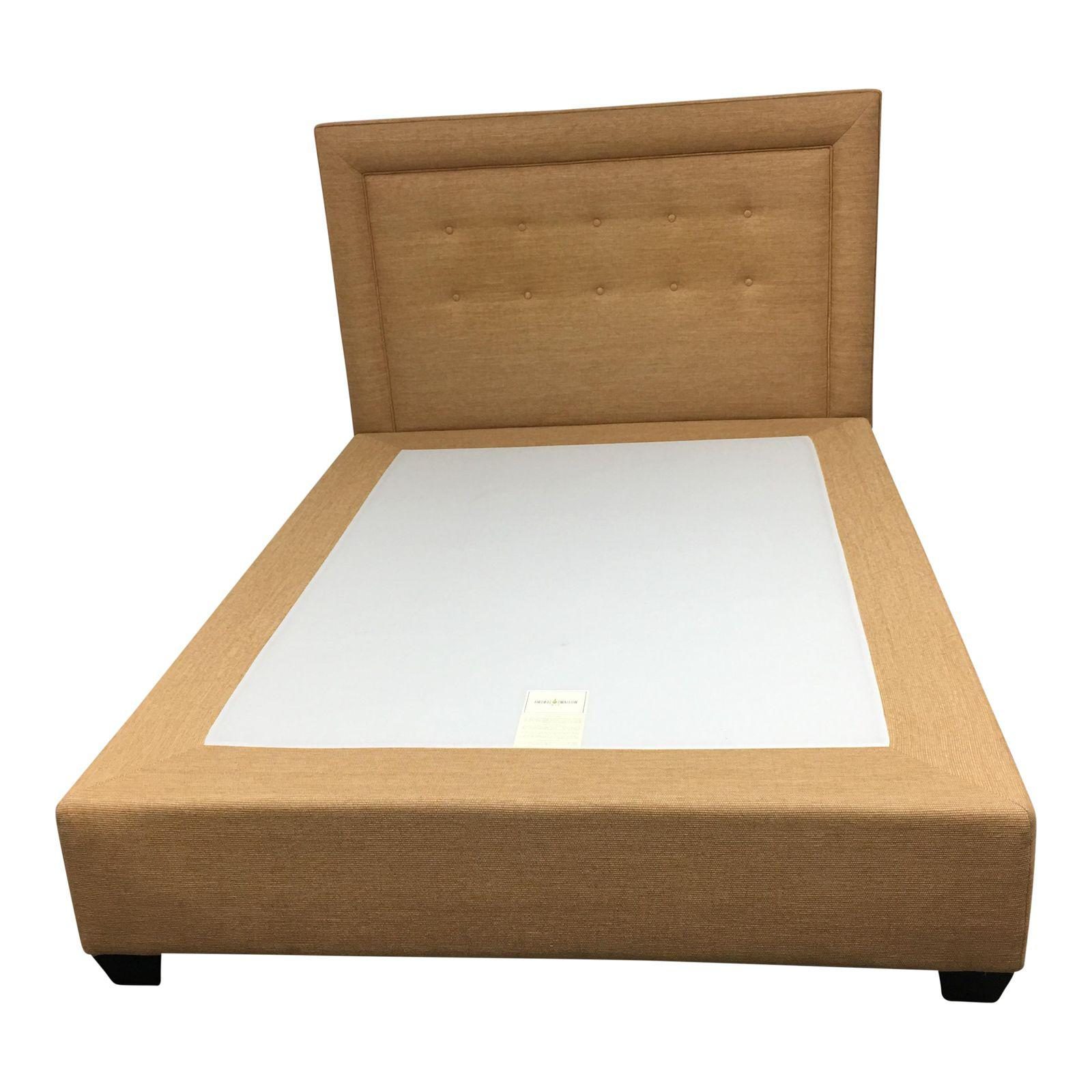 Design Plus Gallery has a William Sonoma “Hampton” queen size bed. The frame is a platform and comes in one piece. The bed is upholstered in a Golderod color fabric. The headboard is rather tailored, it has piping and button tufted details which give it a polished sensibility. With the Hampton there is no need for a box spring or any other foundation. Original $3500.