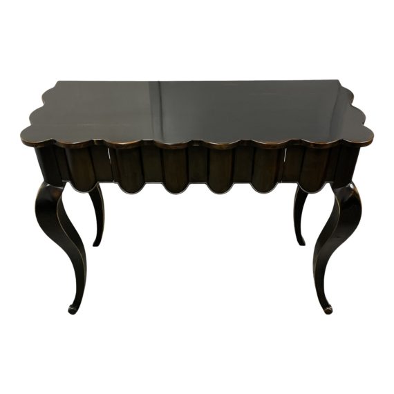 Design Plus Gallery presents a William Sonoma Black Lacquer Curved Console. Contemporary cabriole legs are exaggerated for a modern touch and to match the large scale and high proportions of this convenient display console. Drawer is cleverly embedded within the scalloped sides and curvature. Small scale can fit in a variety of niches and nooks. There is some visible wear on the top, unit is in good condition. Lacquer finish has been distressed on the curves, edges and top for an heirloom feel. Style has been discontinued by William Sonoma Home.