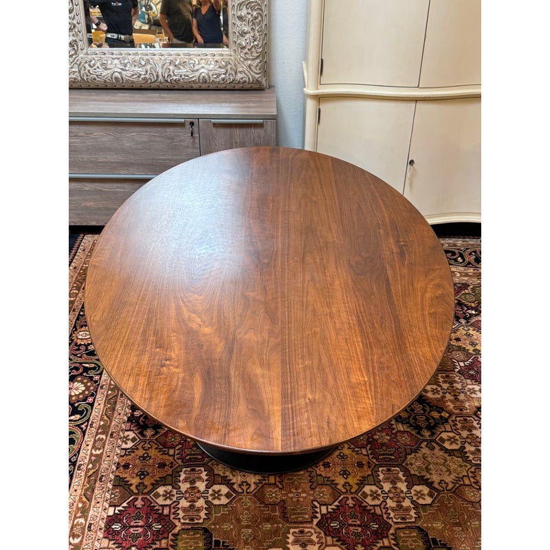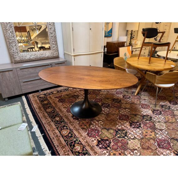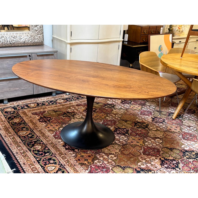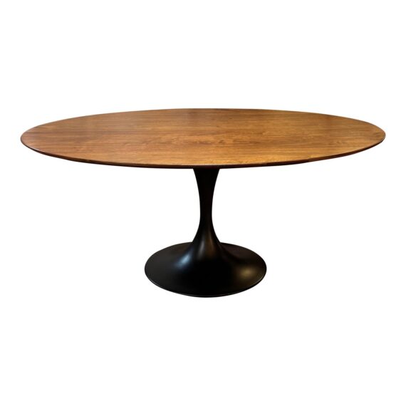 Design Plus Gallery presents a Walnut Tulip Table by Williams-Sonoma Home. A lovely oval top is constructed with a durable wooden frame with solid walnut and walnut veneer, finished with a bottom beveled edge. The expanse, designed to seat six to eight, is elevated by an elegant pedestal base crafted from durable stainless steel, featuring an antique brass plated topcoat. In good condition, visible and minimal wear from usage. Weight 283lbs.