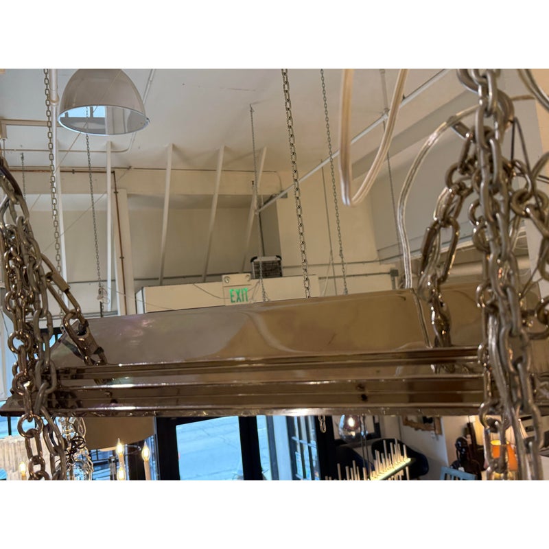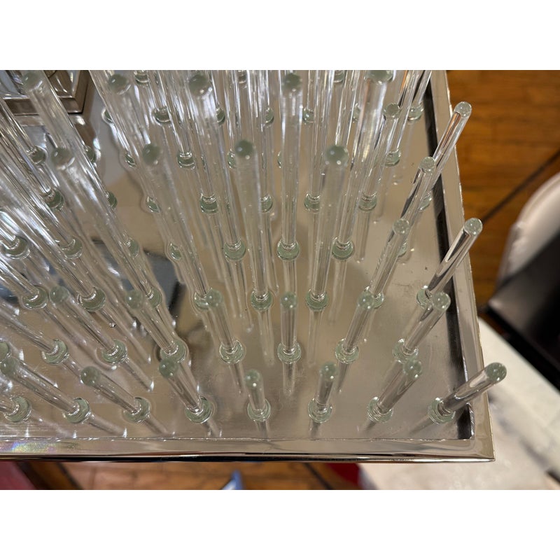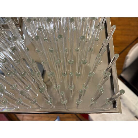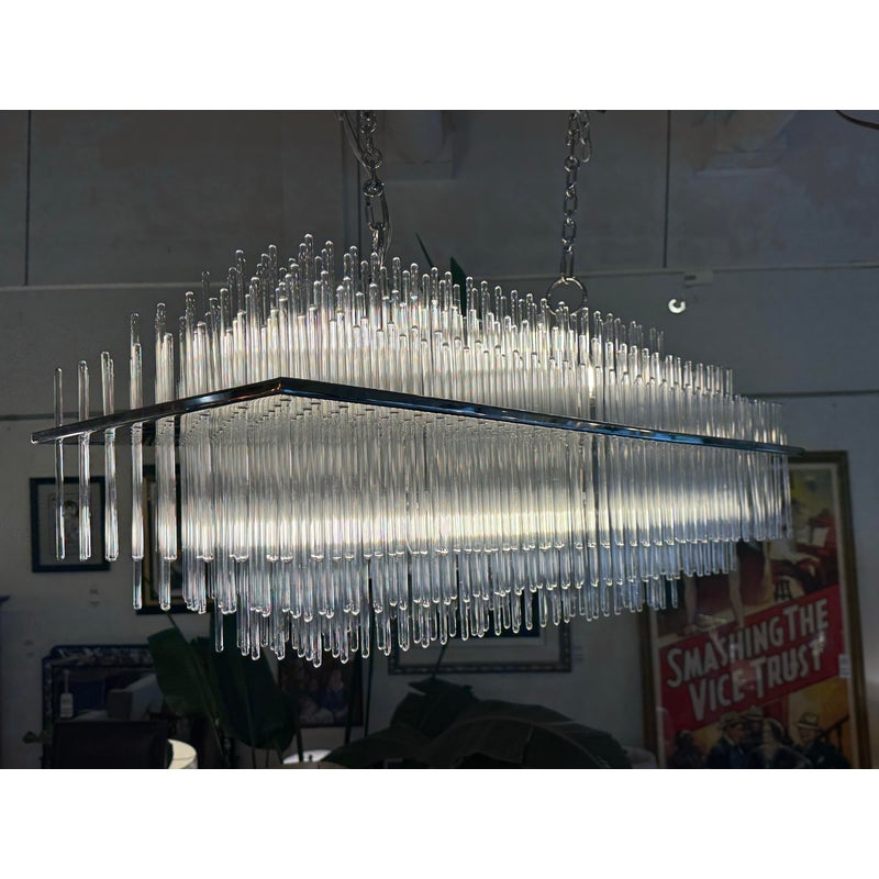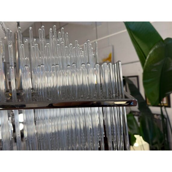 Design Plus Gallery presents a Metropolitan Linear Glass Rod Chandelier from Williams Sonoma. A stunning centerpiece designed to elevate any dining or living space. Featuring a sleek polished chrome frame, this chandelier offers a modern yet sophisticated aesthetic. The lighting elements are uniquely positioned to face both upward and downward, providing balanced illumination and creating a warm, inviting ambiance.This chandelier boasts a total of 10 lights, thoughtfully arranged to enhance its architectural design. The glass rods, crafted in three different sizes, add a dynamic visual interest: the largest rods are positioned at the center, gradually tapering to the shortest rods at the ends. This graduated arrangement not only adds depth and dimension but also accentuates the linear form of the fixture. The combination of polished chrome and varied glass rods results in a striking and elegant chandelier that serves as both a functional light source and a captivating work of art. In good condition, visible and minimal wear.