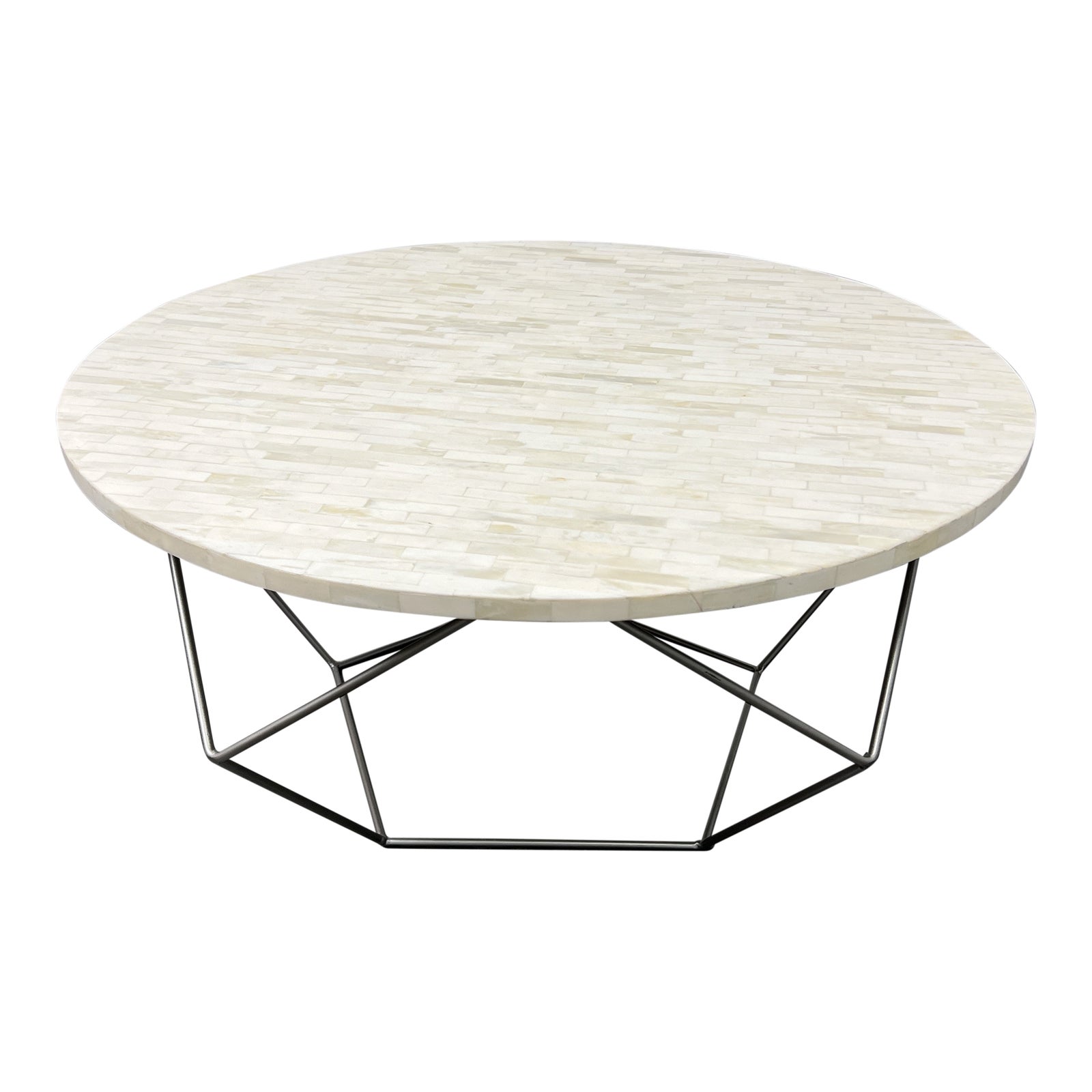 Design Plus Gallery presents a Origami Coffee Table by William Sonoma. Table has a hand-inlaid bone-tile top that’s artfully supported by a sculptural base. Hand-inlaid natural bone tile top. Due to the natural materials used, tile coloring ranges from bright white to light tan. Metal base in a Gunmetal finish. Minor wear from usage + age.