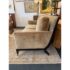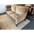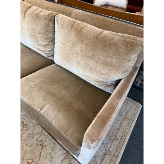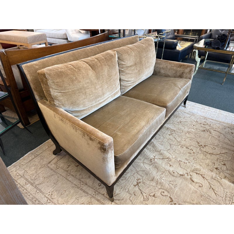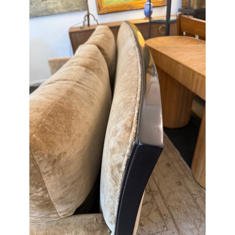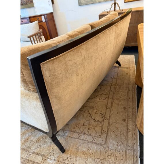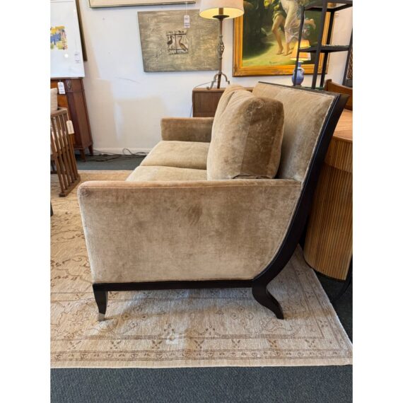 Design Plus Gallery presents the Canape Apollon Settee from the Lucien Rollin Collection for William Switzer. The charming two seater crafted for sophisticated relaxation and is an elegant design from furniture visionary Lucien Rollin. This piece has an exposed wooden frame handmade from solid Cotibe with a dark walnut stain that complimented with nickel hardware. The fabric is rich with a golden hue of a blend of linen and cotton, only by Donghia. It is the Bravo textile in the color and is a luxurious, lightly crushed, velvet-like textile. The sofa shows some signs of wear to the fabric but overall is in good condition for its usage.
