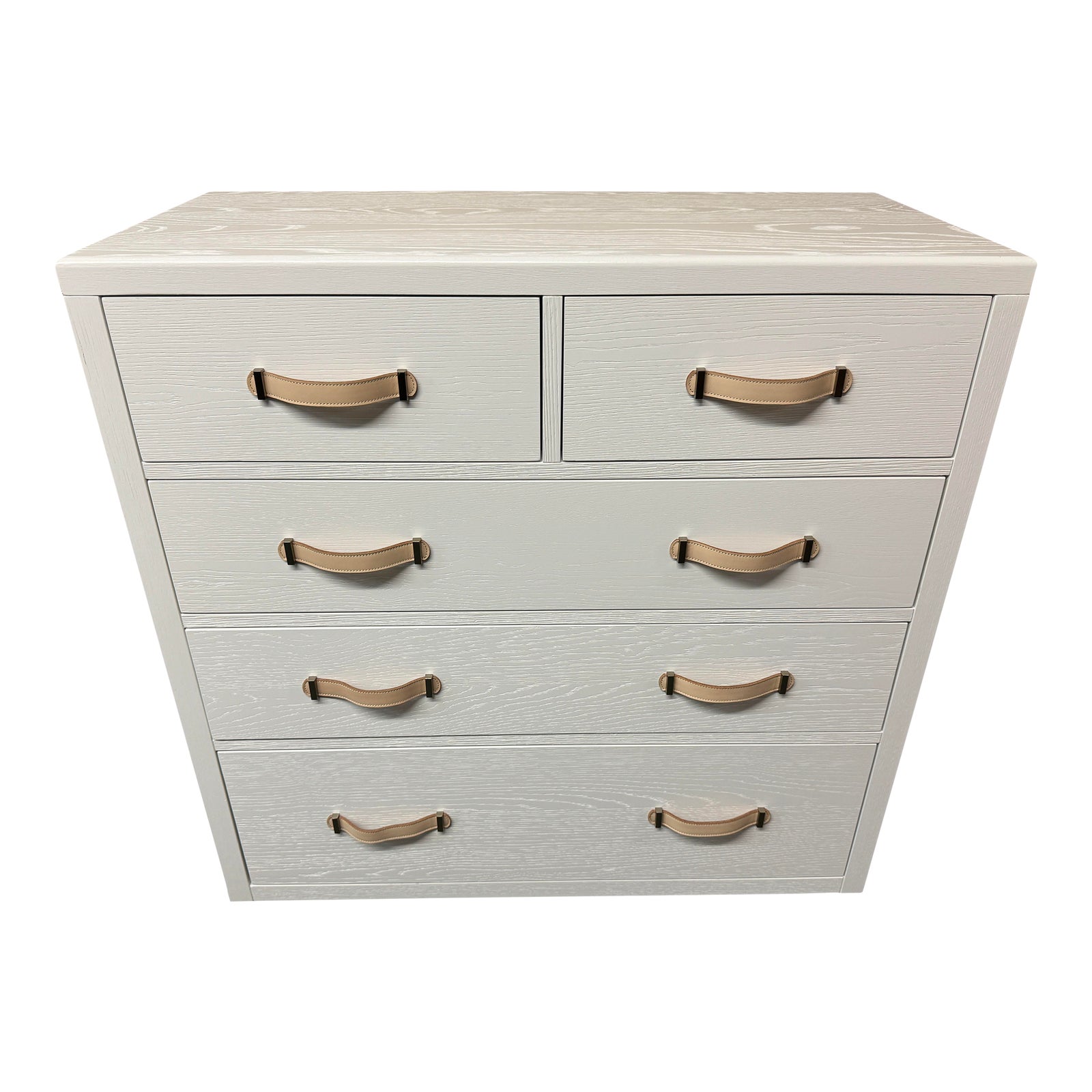 Design Plus Gallery presents the Collins 6 Drawer Chest by Williams-Sonoma. The stylish and simple six drawer dresser features natural leather drawer pulls for an organic modern vibe. Expertly crafted of solid poplar wood kiln-dried, oak veneers, and MDF for durability. Drawers feature English dovetail joinery and waxed wooden glides, which ensure smooth motion. Montauk White finish is applied with a thin layer of white lacquer to highlight the natural wood grain. Light surface wear; condition is good for age and use.