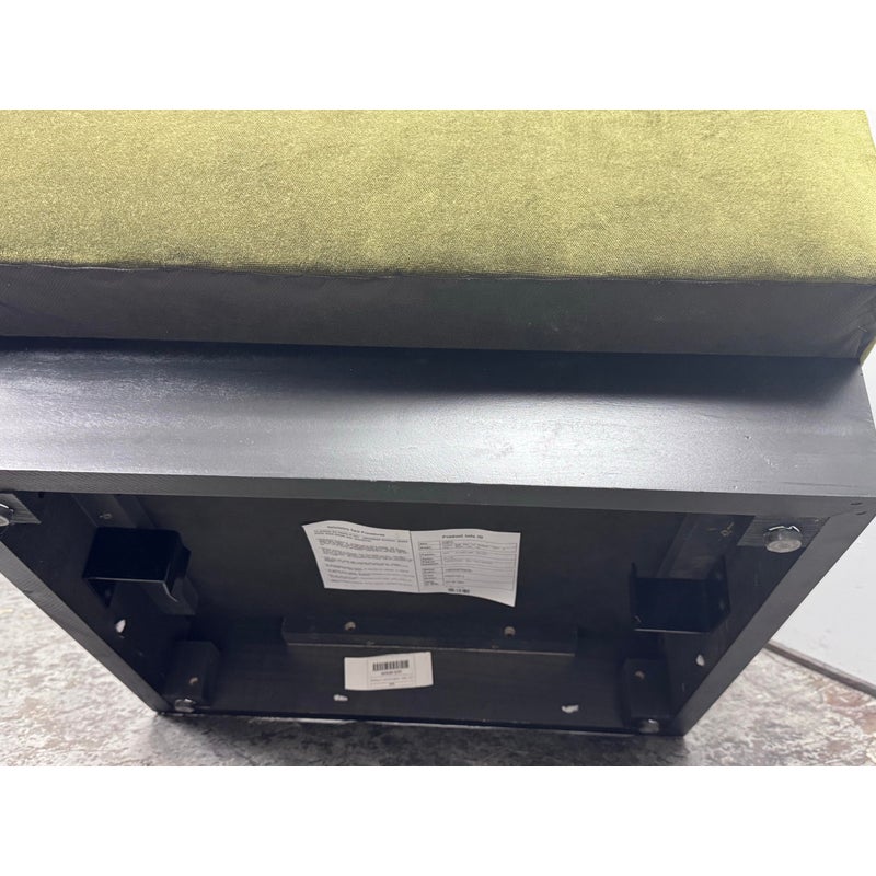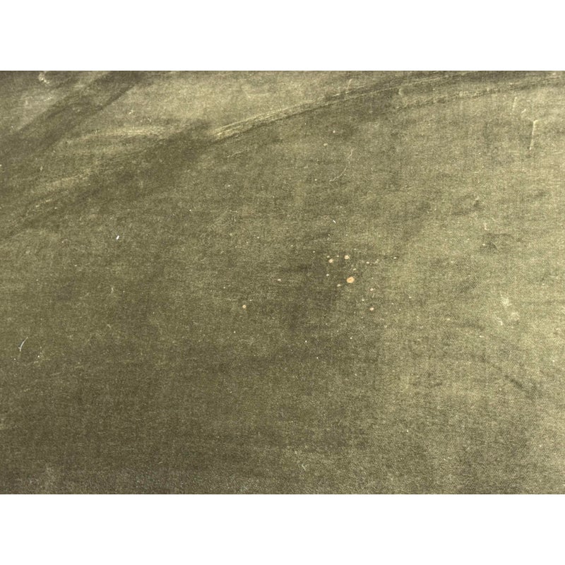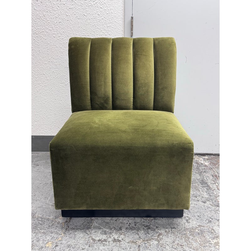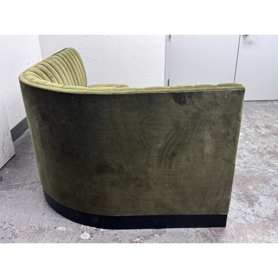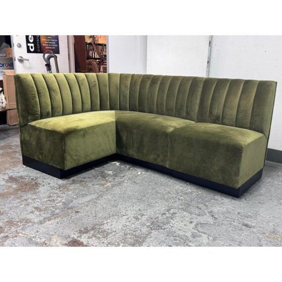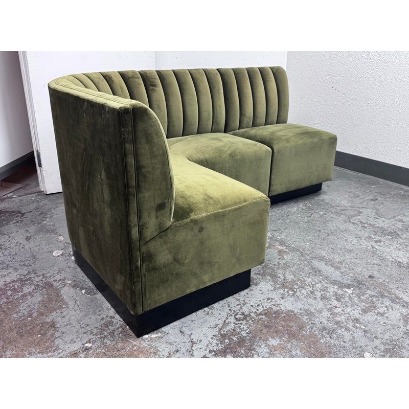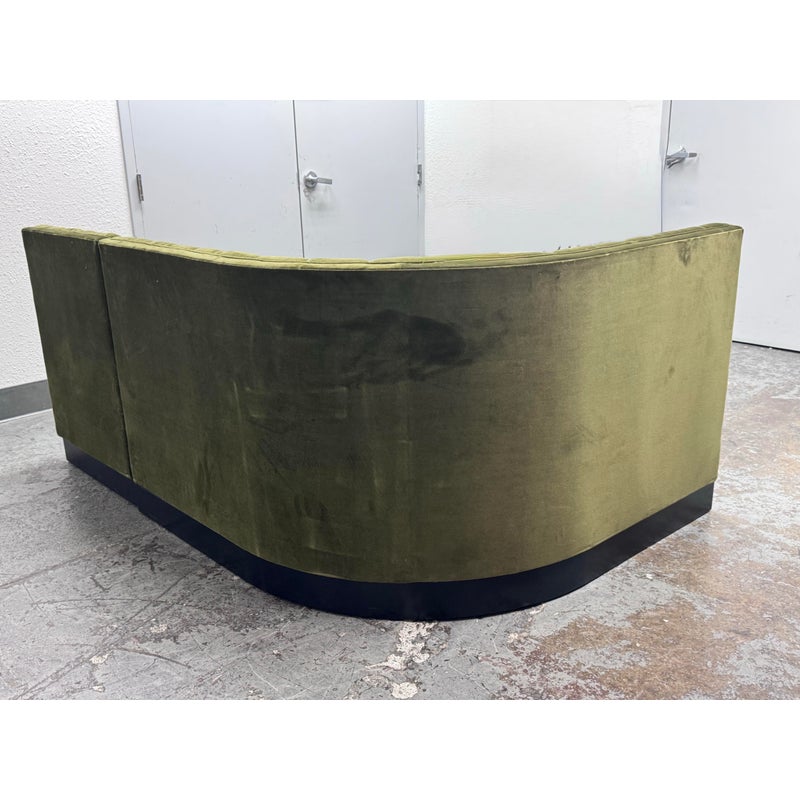 Design Plus Gallery presents a Banquet Seating Set of Two with a Curved Sofa + Armless Chair Custom Created by Village West Designs. The banquet seating is perfect for your kitchen dining area with a rounded sofa and individual armless chair that can be placed in multiple ways. The entirety of the banquet seating is in an olive green velvet with the seat back offering paneled tufting. They have platform bases of a dark wood, espresso like finish. Both the chair and curved sofa show visible and minor visible wear and are considered to be in good condition for their usage. Made in the USA.