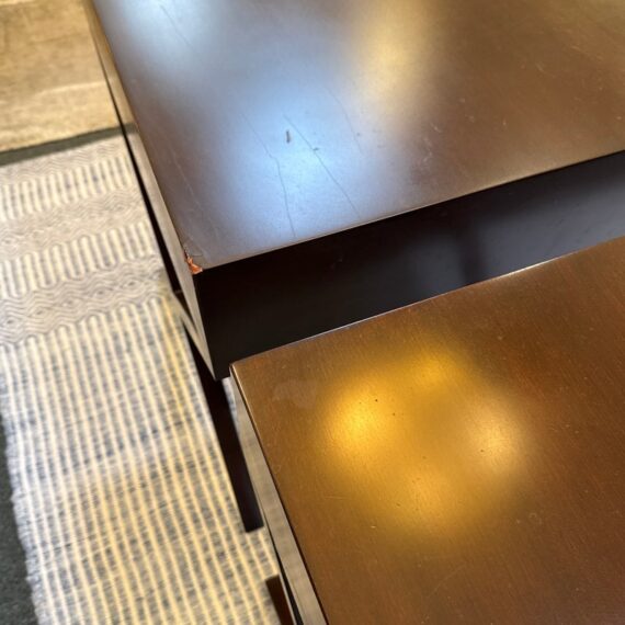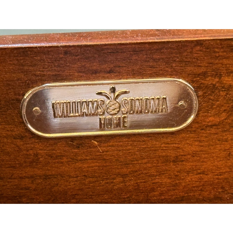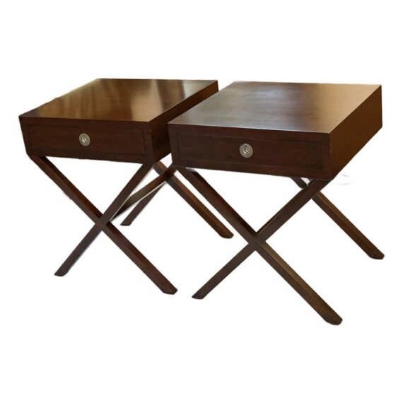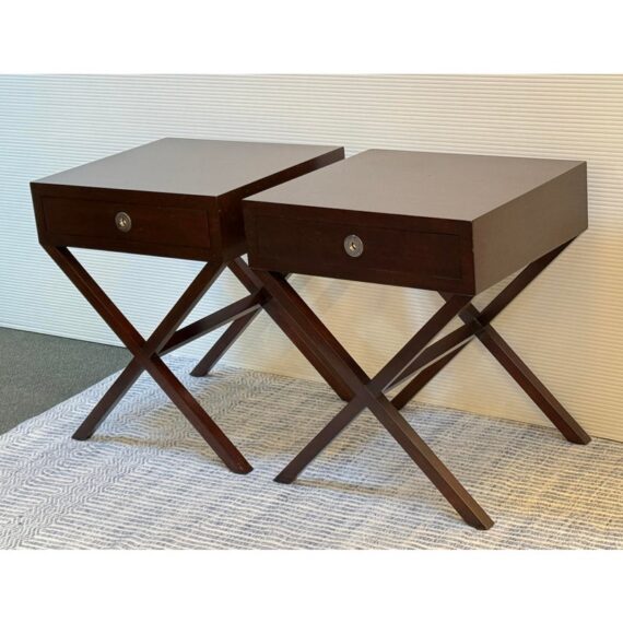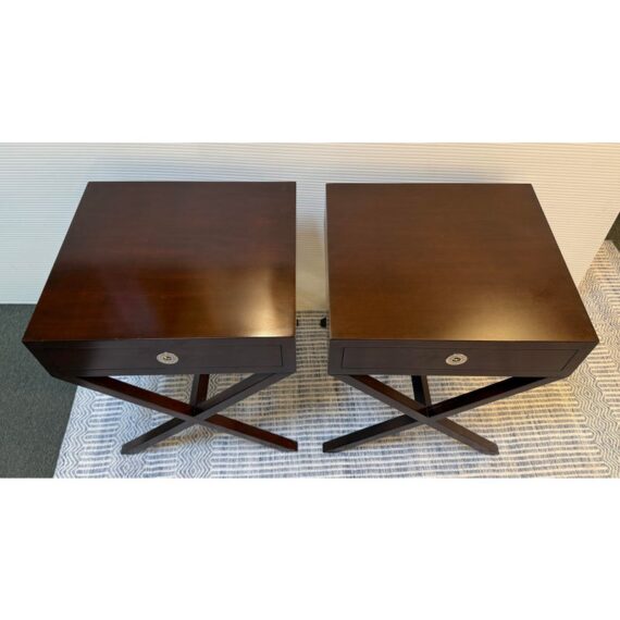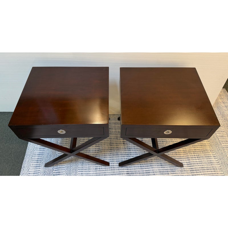 Design Plus Gallery presents a Pair of Hudson Nightstands from Williams-Sonoma Home. The pair of nightstands are handcrafted by skilled artisans with a wide dovetailed drawer in each. The drawer has a polished-nickel-plated ring pull. An X-shaped base gives this side table graphic impact that works equally well next to a club chair, couch or bed. The clean-lined look complements modern and classic décor. Brand plate is found on the interior of the drawer and this style is no longer in production with the brand. They are in good condition, with visible and minimal wear for its usage.