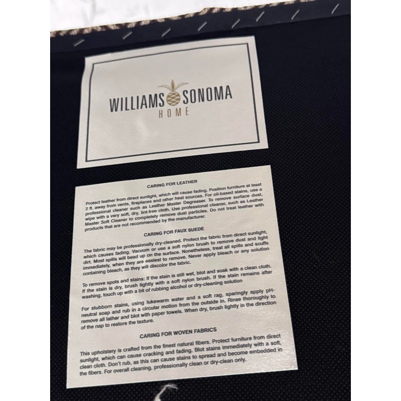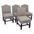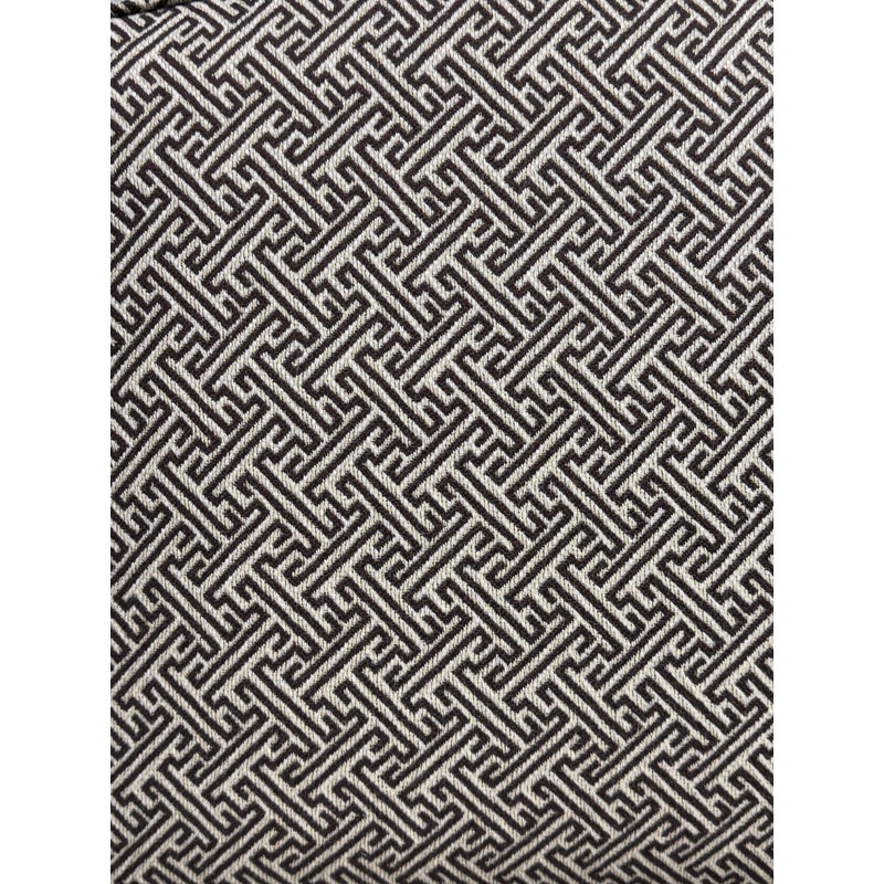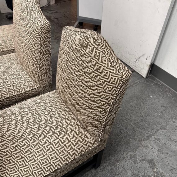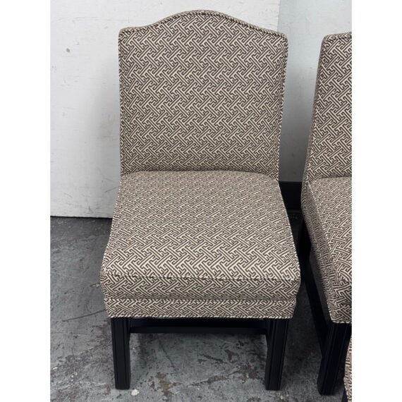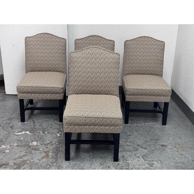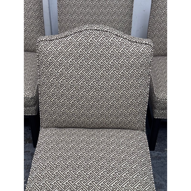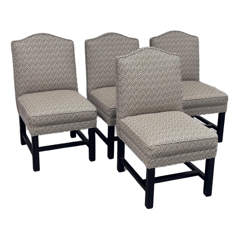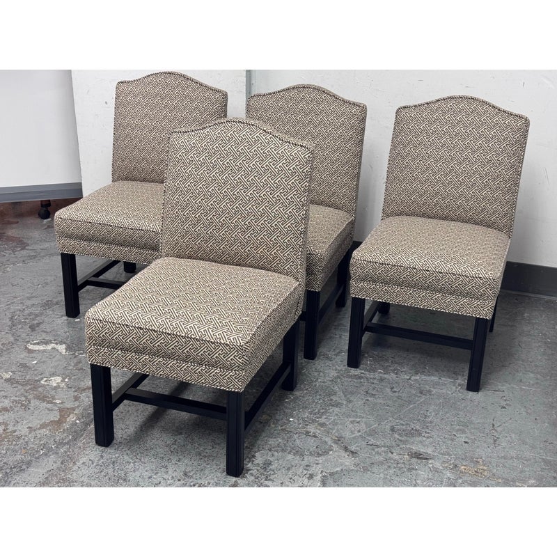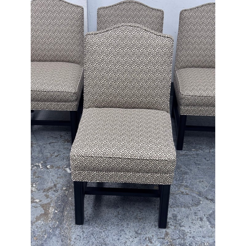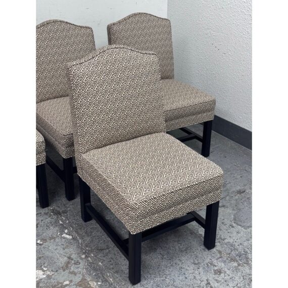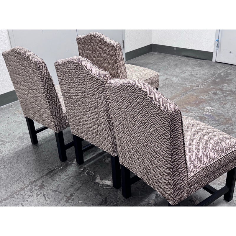 Design Plus Gallery presents a Set of Four Custom Upholstered Side Dining Chairs from Williams Sonoma Home. The fabric is of a Sayagata pattern; a traditional Japanese design of unlocking Buddhist symbols representing life + strength. They are nicely padded on the seat + back, stretchers to lend durability to their support and a dark wood espresso finish. The chairs are all in good condition with minimal surface wear for their usage. This is a discontinued style for the brand.
