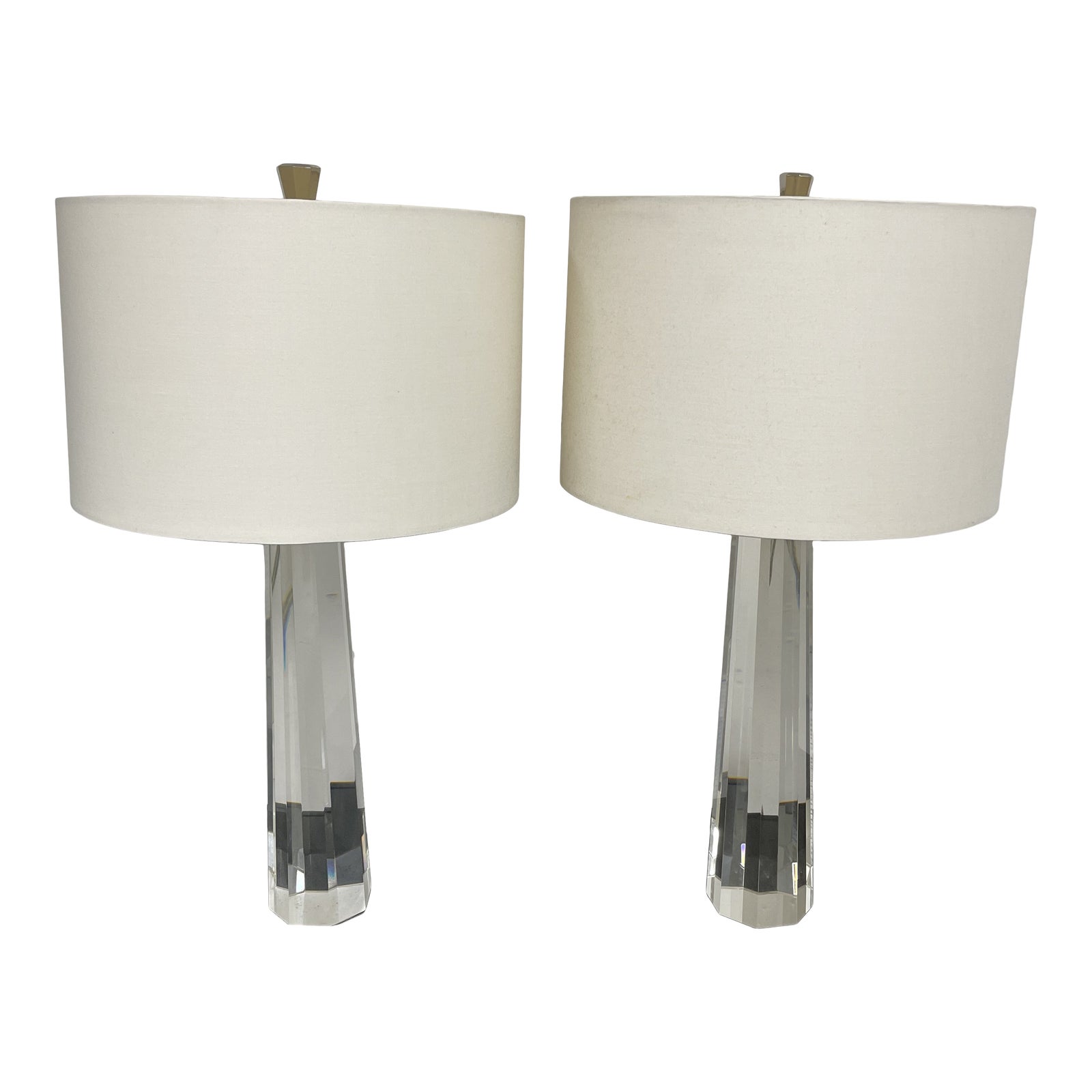 Design Plus Gallery presents a Pair of William Sonoma Crystal Prism Table Lamp. Hand-polished, solid crystal gives these lamps their clean, modern lines. Small and narrow proportions maximizes surface area and can illuminate small niches. Base is cut from solid crystal. A modern and simple ivory linen barrel shade tops off the sharp and glamorous look. Minor wear through out, table lamps are in good condition. One harp is larger than the other.