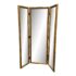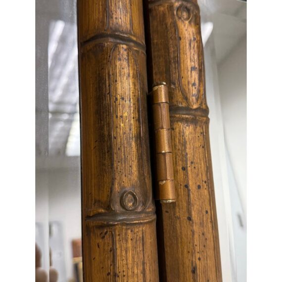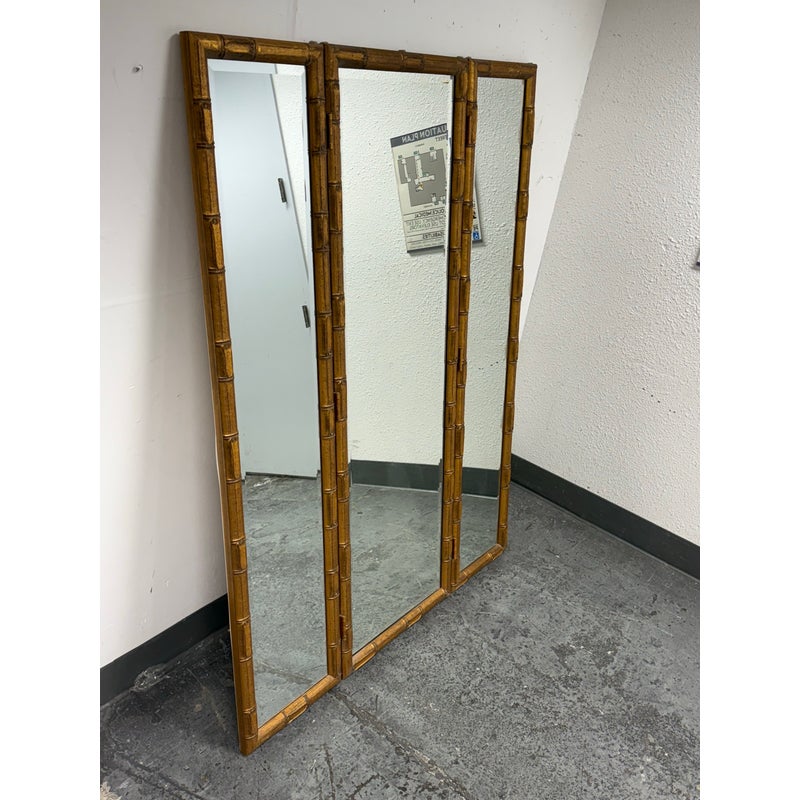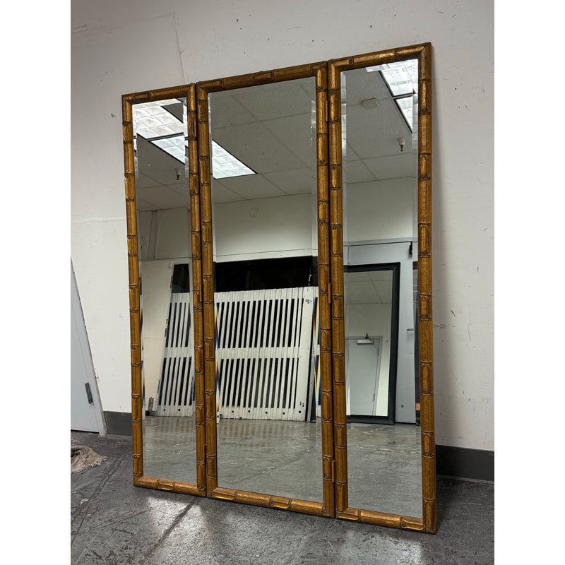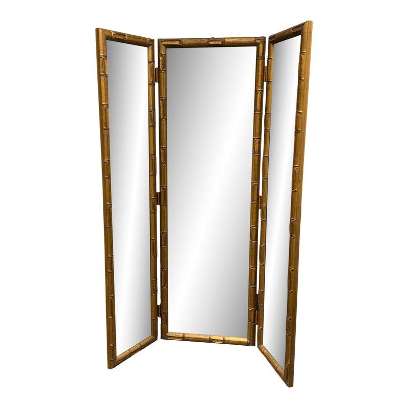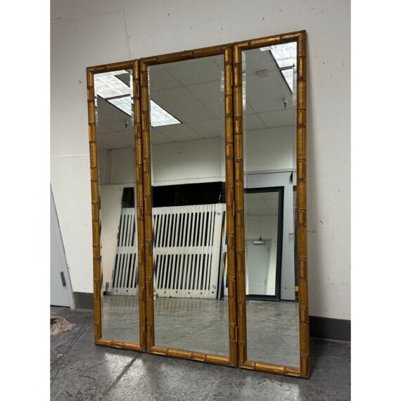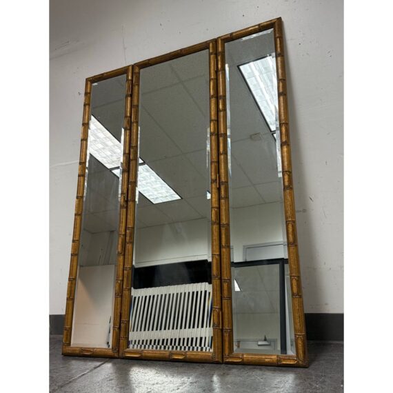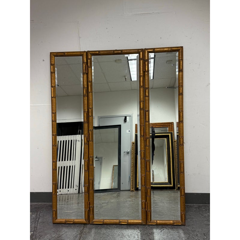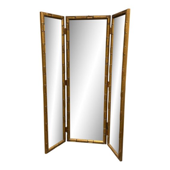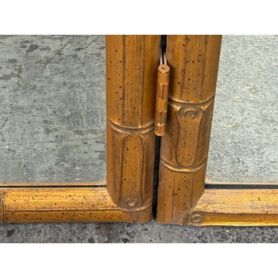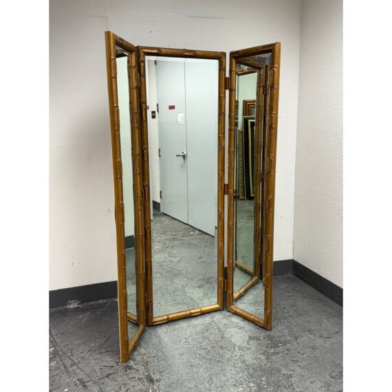 Design Plus Gallery presents a Custom Design Wall Divider/Screen Made up of Three Folding Mirrors from Windsor Art & Mirror Company. The mirrors are dynamic, they can be folded up when not in use and displayed to separate a room easily or used for dressing behind. The frame has a layer of bronze painted bamboo reeds that is attractive, bohemian and many other styles in between. Overall the divider is in good condition with visible and minor wear that is consistent with usage.