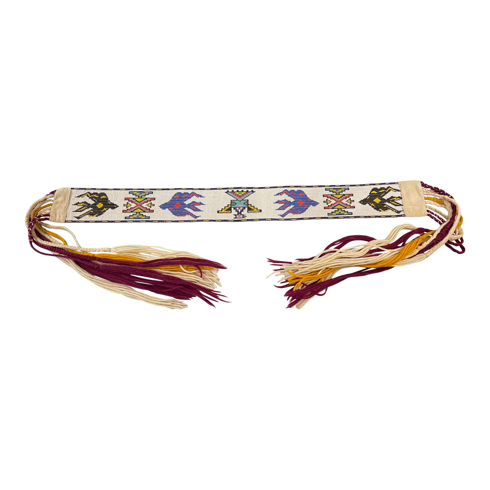 Design Plus Gallery presents a Winnebago Tribe Beaded + Fringe Sash Belt. Beaded belt is meticulously constructed with graphic motifs in vibrant colors and black outlines. Ends are fringed with mustard, magenta, and ivory fibers. Fringe is meant for tying around waist. Piece is a stand out as a decorative accessory that can be layered in any space. Minor wear on fibers, all beading is in tact. Sash belt is in very good condition. Original design is from Late 17th-Century and has been updated for it’s current sharp look.