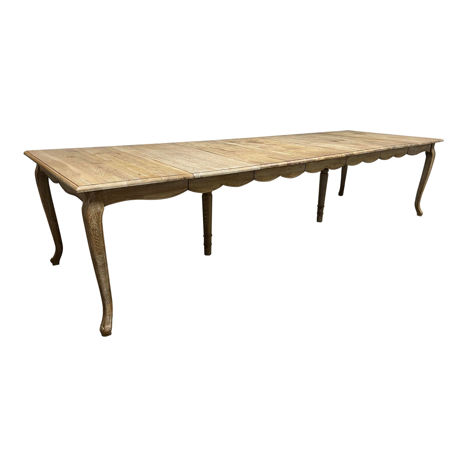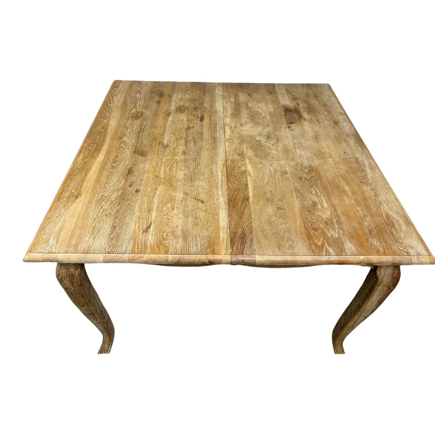 Design Plus Gallery presents the Wisteria French Country Extension Table. Features include five leaves, four corner cabriole legs, and two center legs that shift mid-extension. The table was constructed in India using white oak wood. Table weighs 125 pounds without leaves; with leaves, it weighs 240 pounds. Visible and minor wear from usage; table is in good condition.