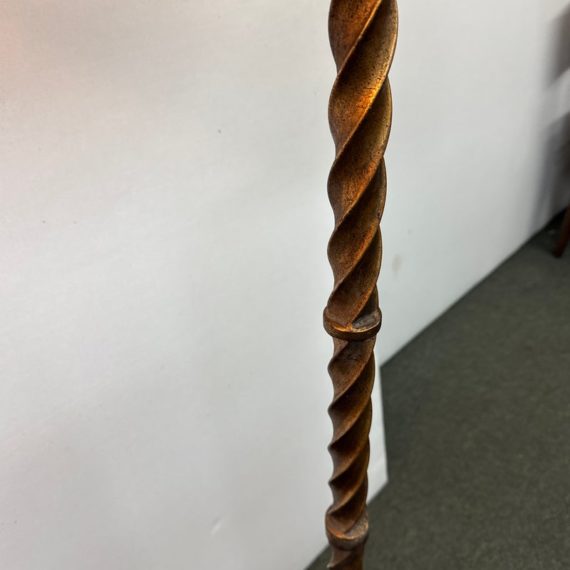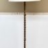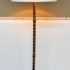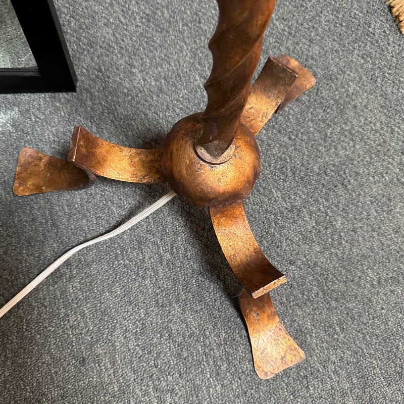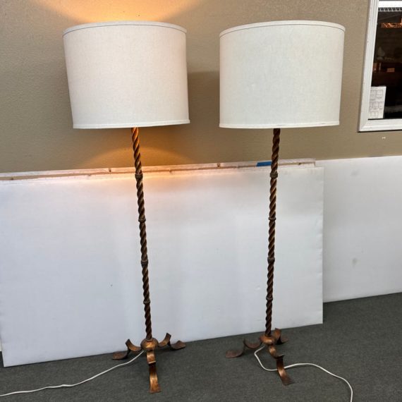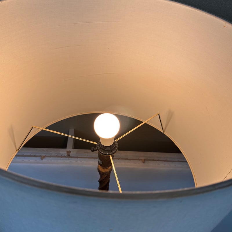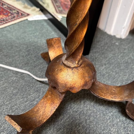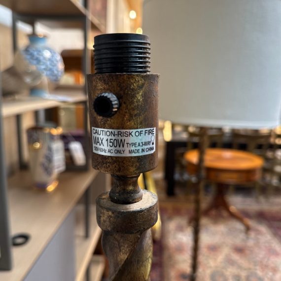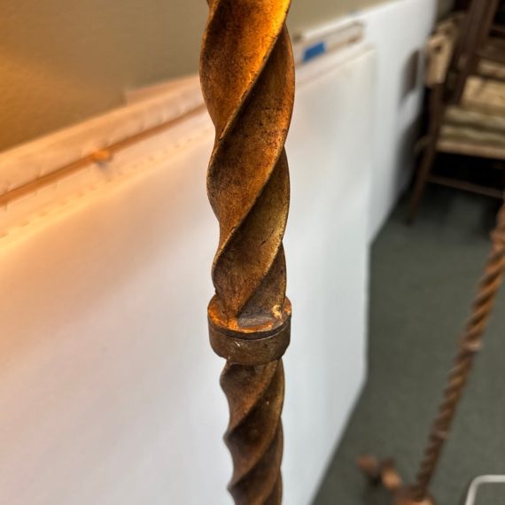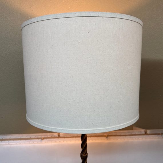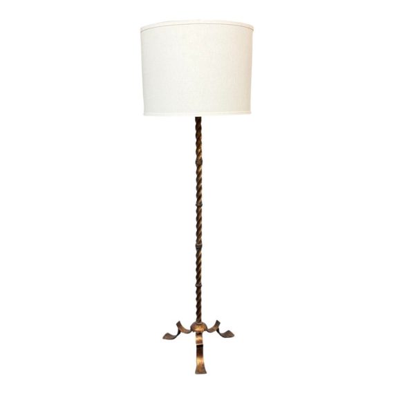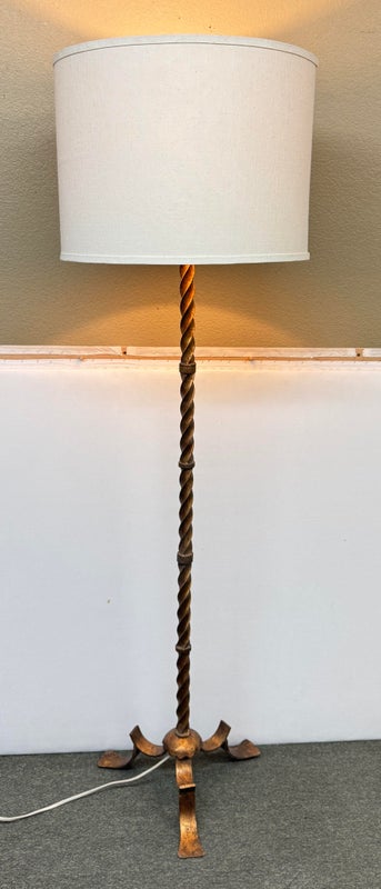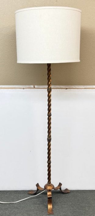 Design Plus Gallery presents a Grand Spanish Floor Lamp by Wisteria. Classic twisting metal spirals up from the tripod base, finished in an antiqued gold finish. Topped with linen drum shade. Single bulb, 3 way socket. Light wear; condition is good for age and use.