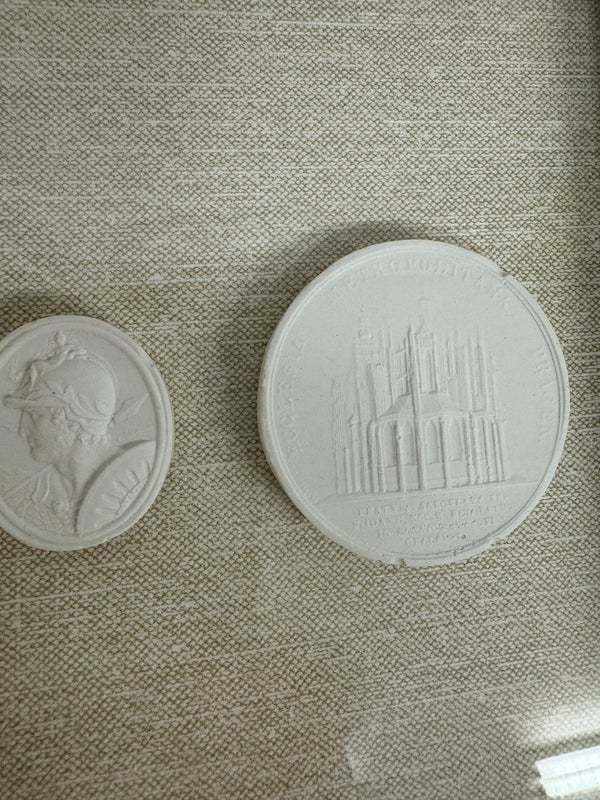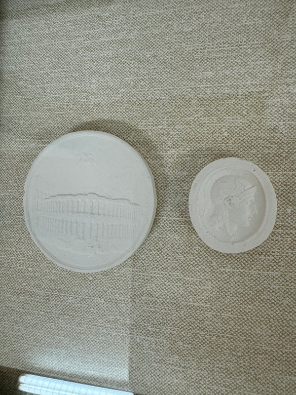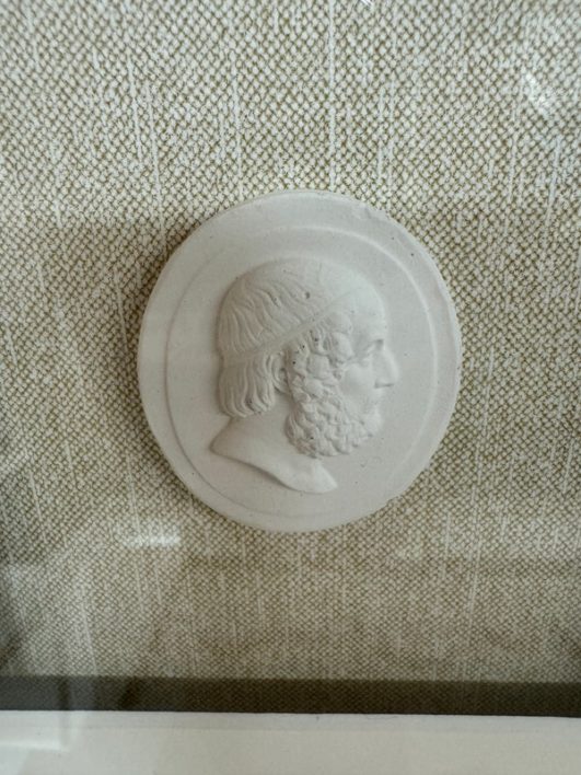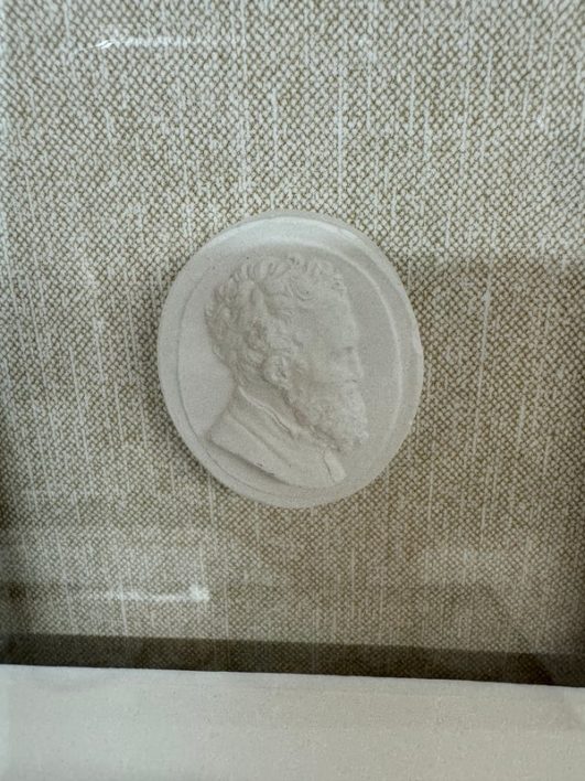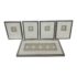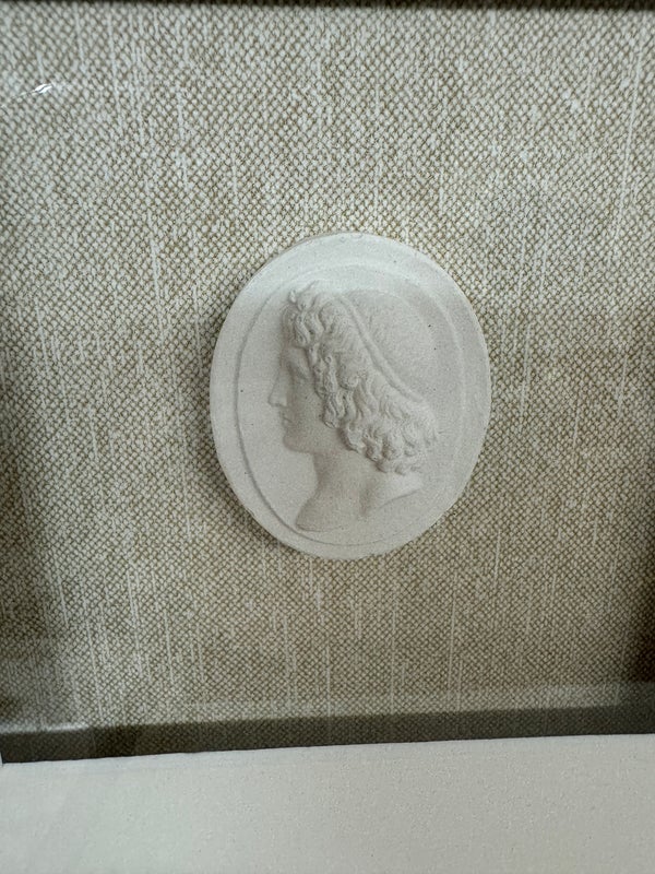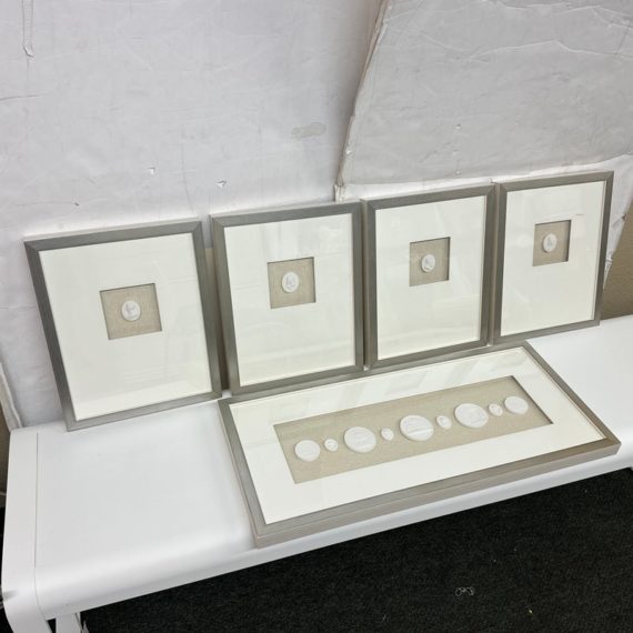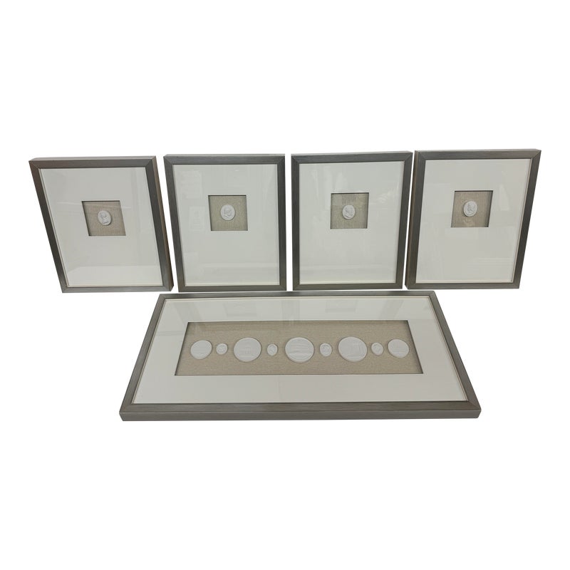 Design Plus Gallery presents a Set of Five Intaglio Collection by WJC Design. Each design or figure is carved, incised, or engraved into a ceramic so that it is dimensional, and finished with a light wash. The frames have a soft metallic silver finish. The collection is mounted beautifully on natural linen and matted. Little wear; condition is good.