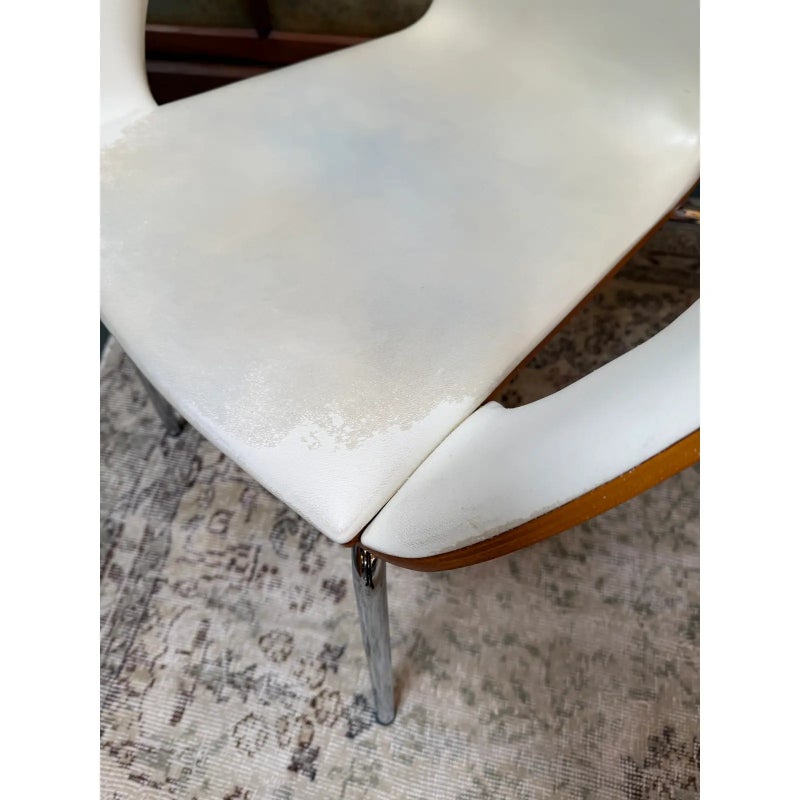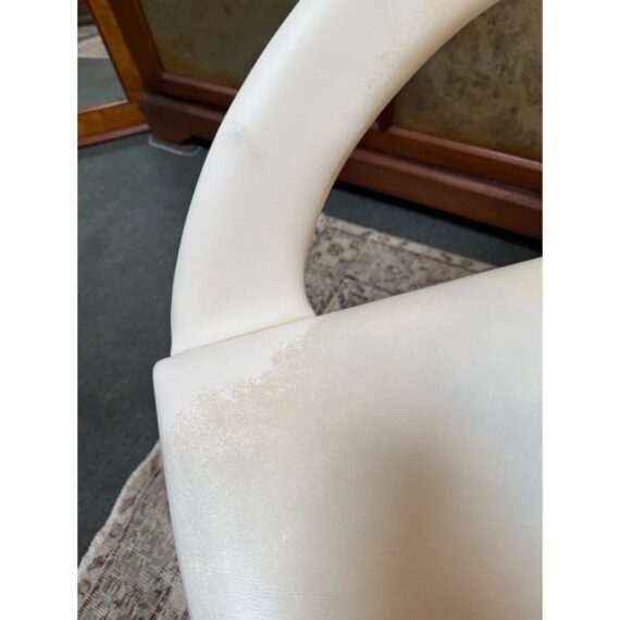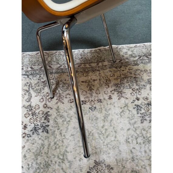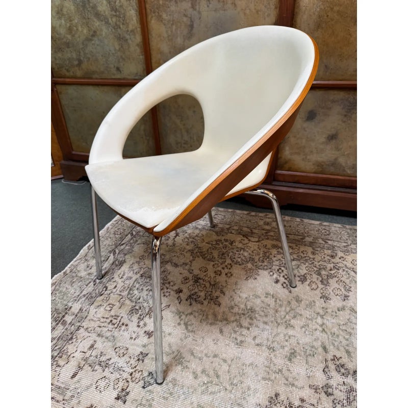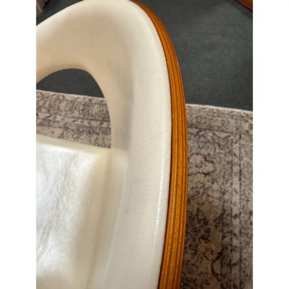 Design Plus Gallery presents a Kirkos Chair by Wolfgang C.R. Mezger for Davis Furniture. The chair has an iconic shell molded from a solid piece of plywood, creating its unique, encompassing shape. It is fully upholstered in a creamy tone of vinyl that is luxurious with the tone of wood. The chair has four tubular metal legs for stability. The chair is no longer in production with the brand and shows wear to the seat that is consistent with regular usage. Overall, in fair condition. Made in the USA.